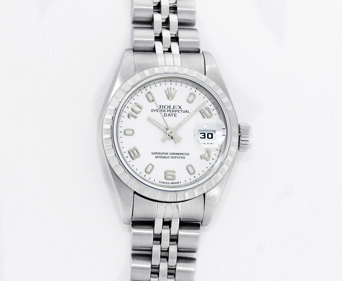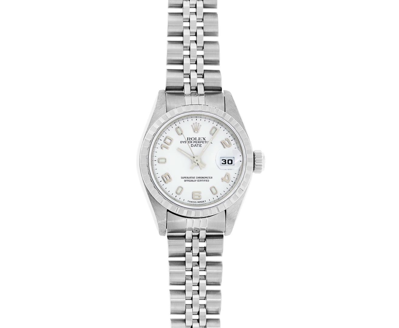 One Ladies Pre Owned Quickset Stainless Steel Rolex Date Polished Bright with Satin Finish, Serviced & Electronically Tested, Rolex Stainless Steel Case: 26mm. Rolex Stainless Steel Crown, Rolex Bezel: Stainless Steel Engine Turn Bezel. Crystal: Sapphire With Magnified Date Window. Hands: Lumi Hands. Rolex Movement: Quickset Automatic Winding Movement 2235. Rolex Dial: White Arabic With Dash Track. Date Window: 3 O'Clock Position Date Display, Model: Sapphire Quickset Datejust. Condition: G-6 Extra Fine. Rolex Bracelet: Stainless Steel Jubilee Band. Bright Polish & Satin Finish. 6.0 Inch Length, Adjustable. Standard Clasp, With Rolex Logo. This Watch Has Been Serviced Time Tested And Is In Excellent Condition It Is Free Of All Scratches And Dents.