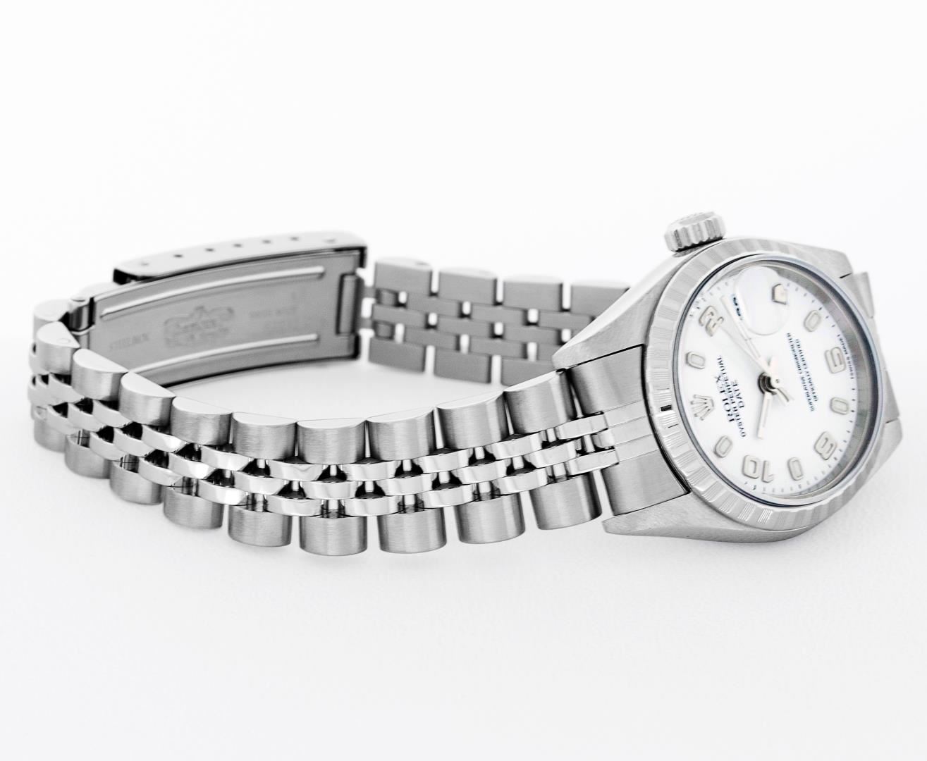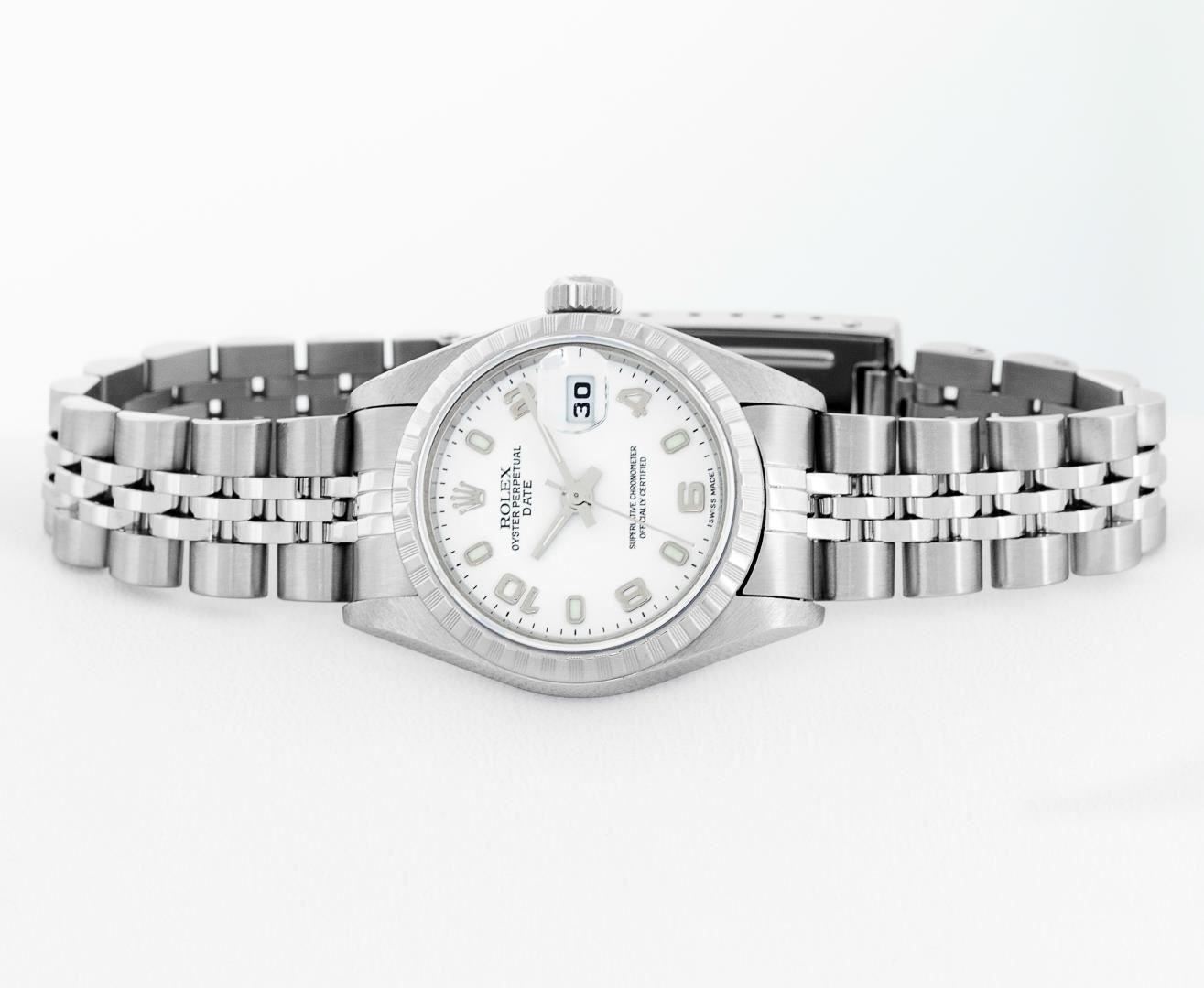One Ladies Pre Owned Quickset Stainless Steel Rolex Date Polished Bright with Satin Finish, Serviced & Electronically Tested, Rolex Stainless Steel Case: 26mm. Rolex Stainless Steel Crown, Rolex Bezel: Stainless Steel Engine Turn Bezel. Crystal: Sapphire With Magnified Date Window. Hands: Lumi Hands. Rolex Movement: Quickset Automatic Winding Movement 2235. Rolex Dial: White Arabic With Dash Track. Date Window: 3 O'Clock Position Date Display, Model: Sapphire Quickset Datejust. Condition: G-6 Extra Fine. Rolex Bracelet: Stainless Steel Jubilee Band. Bright Polish & Satin Finish. 6.0 Inch Length, Adjustable. Standard Clasp, With Rolex Logo. This Watch Has Been Serviced Time Tested And Is In Excellent Condition It Is Free Of All Scratches And Dents.