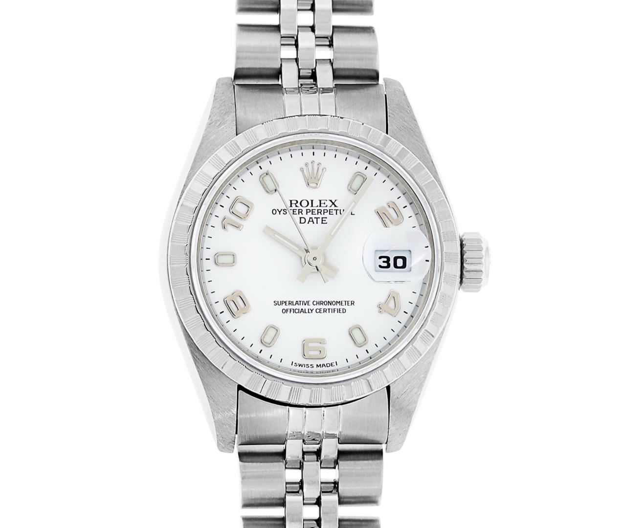 One Ladies Pre Owned Quickset Stainless Steel Rolex Date Polished Bright with Satin Finish, Serviced & Electronically Tested, Rolex Stainless Steel Case: 26mm. Rolex Stainless Steel Crown, Rolex Bezel: Stainless Steel Engine Turn Bezel. Crystal: Sapphire With Magnified Date Window. Hands: Lumi Hands. Rolex Movement: Quickset Automatic Winding Movement 2235. Rolex Dial: White Arabic With Dash Track. Date Window: 3 O'Clock Position Date Display, Model: Sapphire Quickset Datejust. Condition: G-6 Extra Fine. Rolex Bracelet: Stainless Steel Jubilee Band. Bright Polish & Satin Finish. 6.0 Inch Length, Adjustable. Standard Clasp, With Rolex Logo. This Watch Has Been Serviced Time Tested And Is In Excellent Condition It Is Free Of All Scratches And Dents.