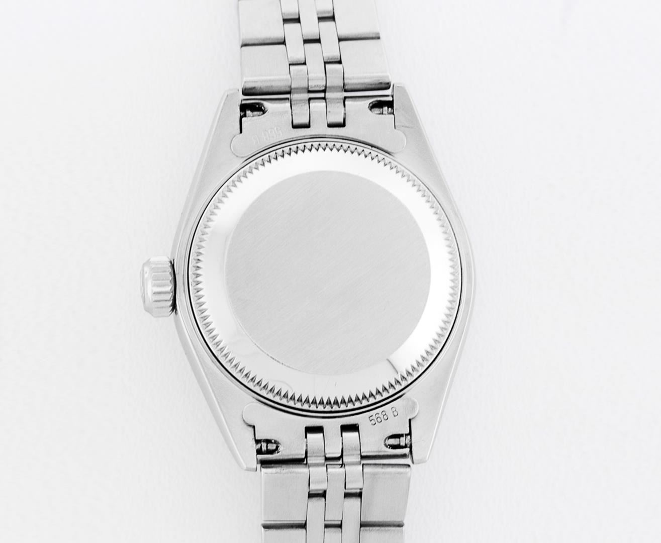 One Ladies Pre Owned Quickset Stainless Steel Rolex Date Polished Bright with Satin Finish, Serviced & Electronically Tested, Rolex Stainless Steel Case: 26mm. Rolex Stainless Steel Crown, Rolex Bezel: Stainless Steel Engine Turn Bezel. Crystal: Sapphire With Magnified Date Window. Hands: Lumi Hands. Rolex Movement: Quickset Automatic Winding Movement 2235. Rolex Dial: White Arabic With Dash Track. Date Window: 3 O'Clock Position Date Display, Model: Sapphire Quickset Datejust. Condition: G-6 Extra Fine. Rolex Bracelet: Stainless Steel Jubilee Band. Bright Polish & Satin Finish. 6.0 Inch Length, Adjustable. Standard Clasp, With Rolex Logo. This Watch Has Been Serviced Time Tested And Is In Excellent Condition It Is Free Of All Scratches And Dents.