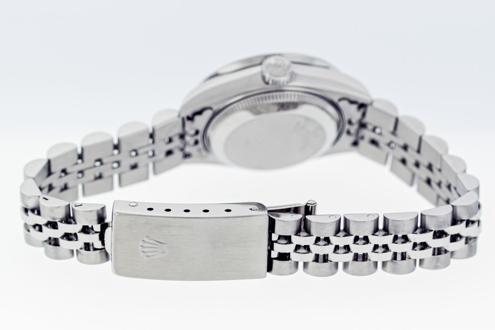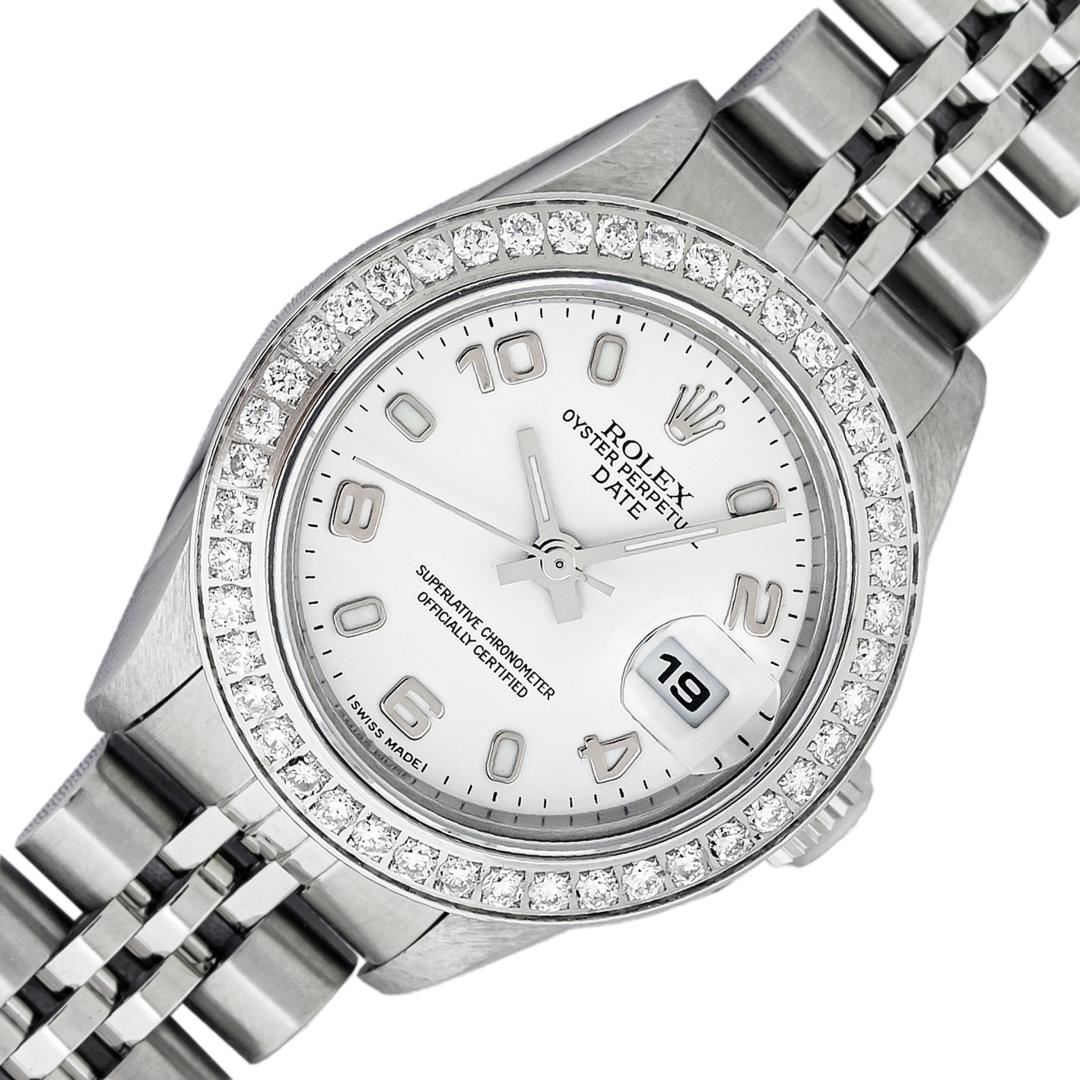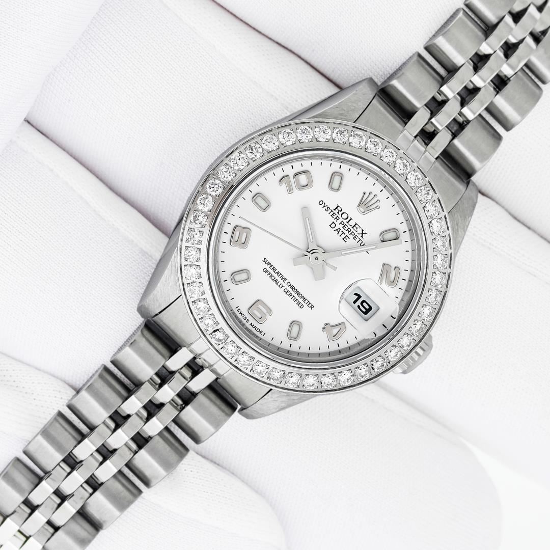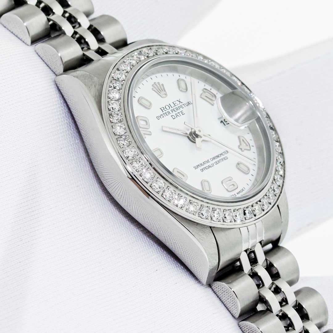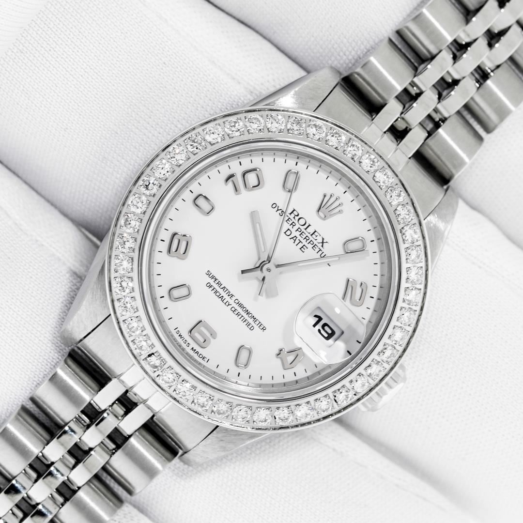One Ladies Pre Owned Quickset Stainless Steel Rolex Date Polished Bright with Satin Finish, Serviced & Electronically Tested, Stainless Steel Case: 26mm, Rolex Stainless Steel Crown, Custom Bezel: New Stainless Steel Bead Set Diamond Bezel, Diamond Count: 40 Diamonds, Clarity: SI-VS, Color: G to H. Custom Crystal: New Sapphire With Magnified Date Window. Custom Hands: New Luminescent Hands. Rolex Movement: Automatic Winding Movement 2235. Rolex Dial: White With Arabic Hour Markers. Date Window: 3 O'Clock Position Date Display, Model: Datejust. Condition: G-6 Extra Fine. Rolex Bracelet: Stainless Steel Jubilee Band. Bright Polish & Satin Finish. 6.0 Inch Length, Adjustable. Standard Clasp, With Rolex Logo. This Watch Has Been Serviced Time Tested And Is In Excellent Condition It Is Free Of All Scratches And Dents.