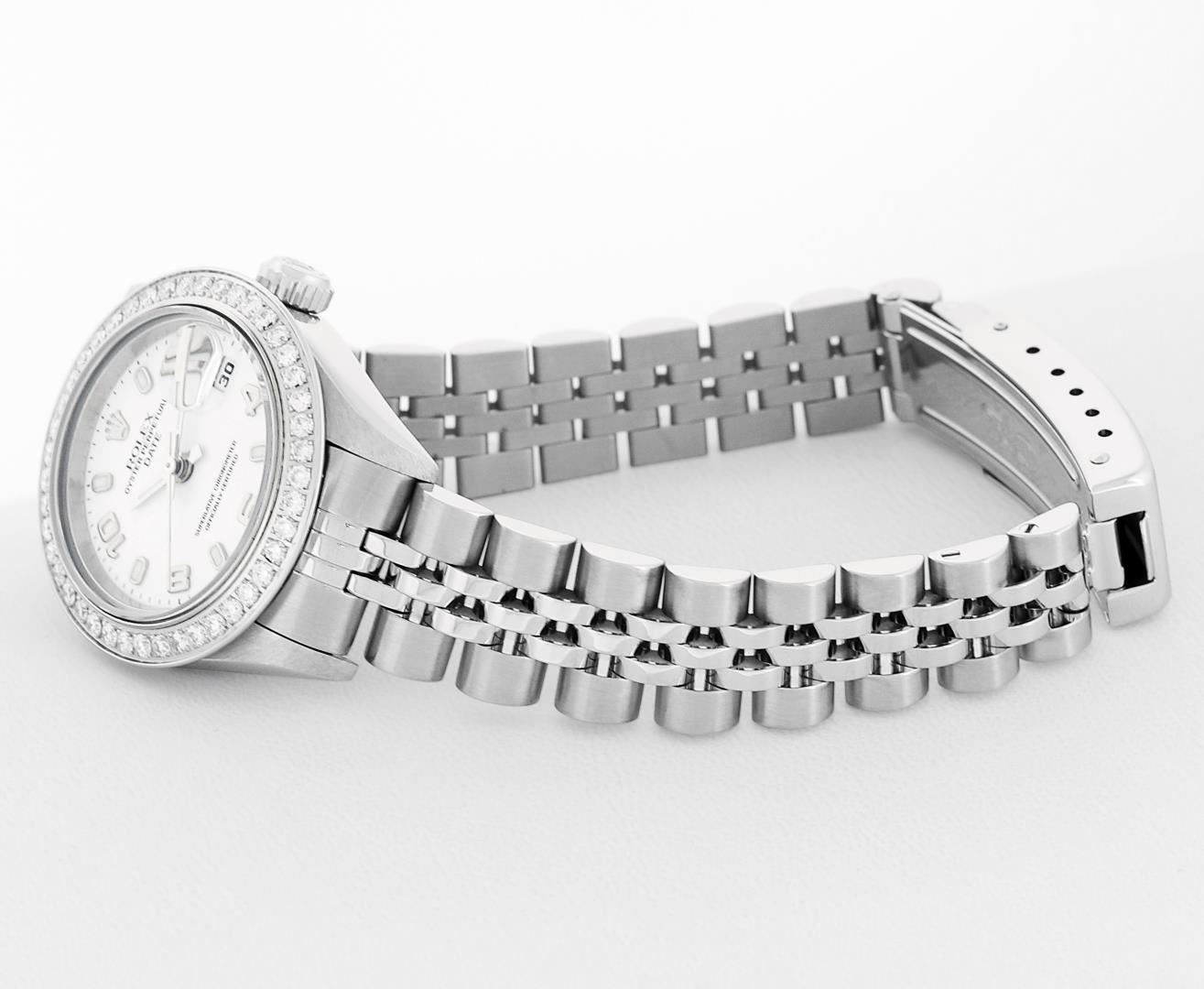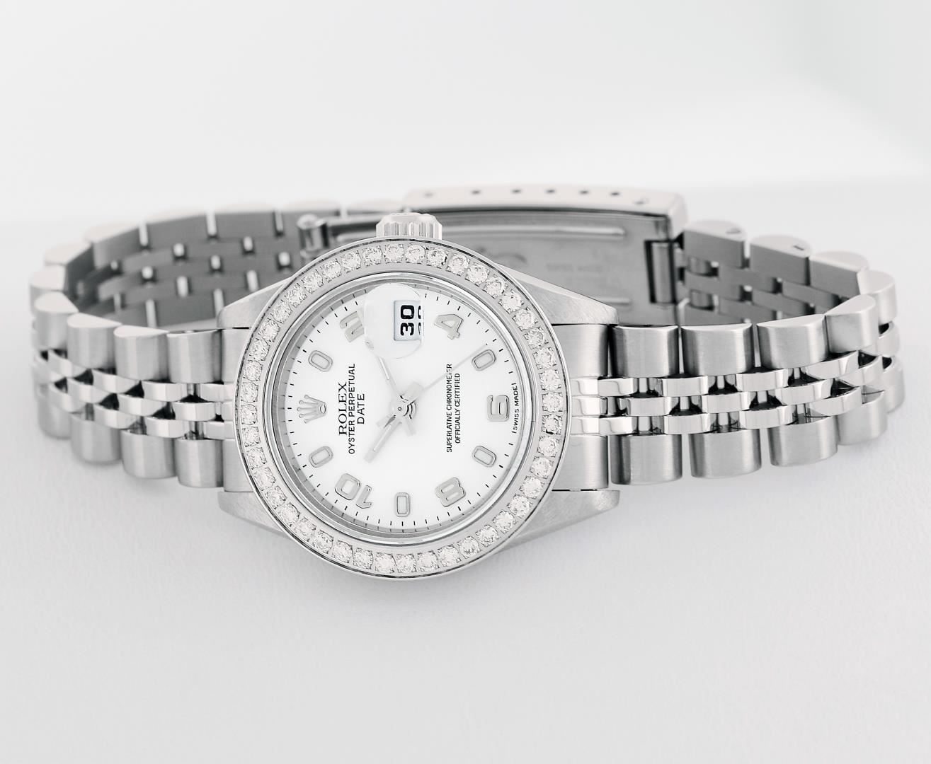 One Ladies Pre Owned Quickset Stainless Steel Rolex Date Polished Bright with Satin Finish, Serviced & Electronically Tested, Rolex Stainless Steel Case: 26mm. Rolex Stainless Steel Crown, Custom Bezel: New Stainless Steel Beadset Diamond Bezel, Stone Count: 32 Diamonds On Bezel, Diamond Color: G To H, Clarity: SI-VS. Custom Crystal: New Sapphire With Magnified Date Window. Custom Hands: New Lumi Hands. Rolex Movement: Quickset Automatic Winding Movement 2235. Rolex Dial: White Arabic With Dash Track. Date Window: 3 O'Clock Position Date Display, Model: Sapphire Quickset Datejust. Condition: G-6 Extra Fine. Rolex Bracelet: Stainless Steel Jubilee Band. Bright Polish & Satin Finish. 6.0 Inch Length, Adjustable. Standard Clasp, With Rolex Logo. This Watch Has Been Serviced Time Tested And Is In Excellent Condition It Is Free Of All Scratches And Dents.
