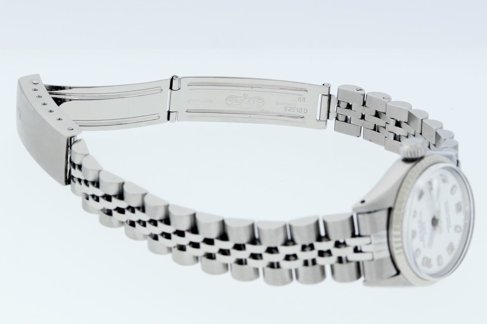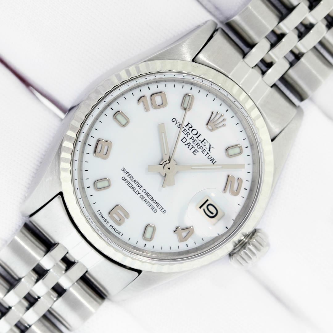 One Ladies Pre Owned Stainless Steel Rolex Date Polished Bright with Satin Finish, Serviced & Electronically Tested, Rolex Stainless Steel Case: 26mm, Rolex Stainless Steel Crown, Rolex Bezel: Rolex White Gold Fluted Bezel, Custom Crystal: New Acrylic Plastic Crystal. Custom Hands: New Luminescent Hands. Rolex Movement: Automatic Winding Movement 1161. Rolex Dial: White Arabic Dial. Date Window: 3 O'Clock Position Date Display, Model: Date. Condition: G-6 Extra Fine. Rolex Bracelet: Stainless Steel Jubilee Band. Bright Polish & Satin Finish. 6.00 Inches Length, Adjustable. Standard Clasp, With Rolex Logo. This Watch Has Been Serviced Time Tested And Is In Excellent Condition It Is Free Of All Scratches And Dents.