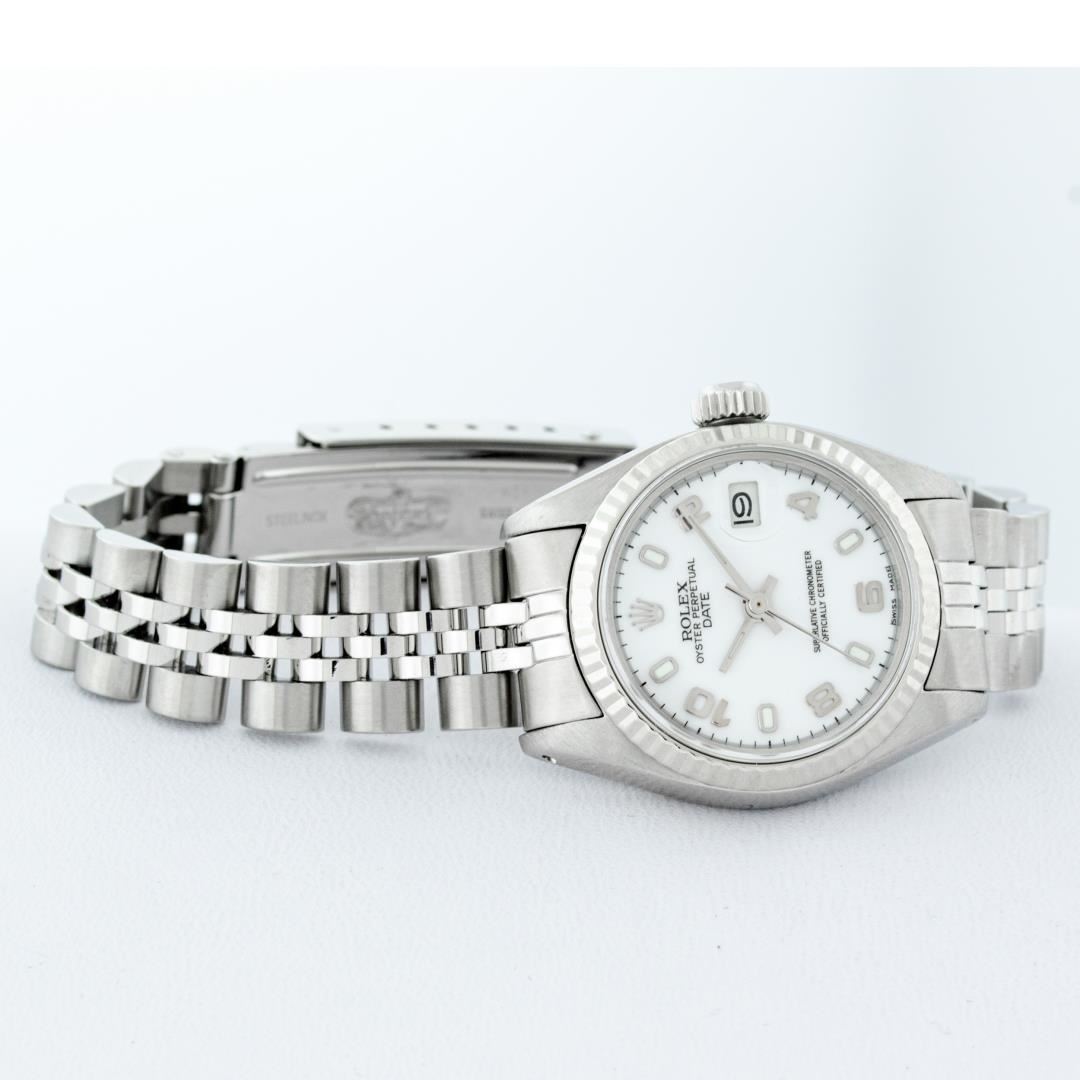 One Ladies Pre Owned Stainless Steel Rolex Polished Bright with Satin Finish, Serviced & Electronically Tested, Rolex Stainless Steel Case: 26mm, Rolex Stainless Steel Crown, Rolex Bezel: 14K White Gold Fluted Bezel. Custom Crystal: New With Magnified Date Window. Custom Hands: New Luminescent Hands. Rolex Movement: Automatic Winding Movement. Rolex Dial: White Arabic Dial With Dash Track, Date Window: 3 O'Clock Position Date Display, Model: Datejust. Condition: G-6 Extra Fine. Rolex Bracelet: Stainless Steel Jubilee Band. Bright Polish & Satin Finish. 6.0 Inch Length, Adjustable. Standard Clasp, With Rolex Logo. This Watch Has Been Serviced Time Tested And Is In Excellent Condition It Is Free Of All Scratches And Dents.