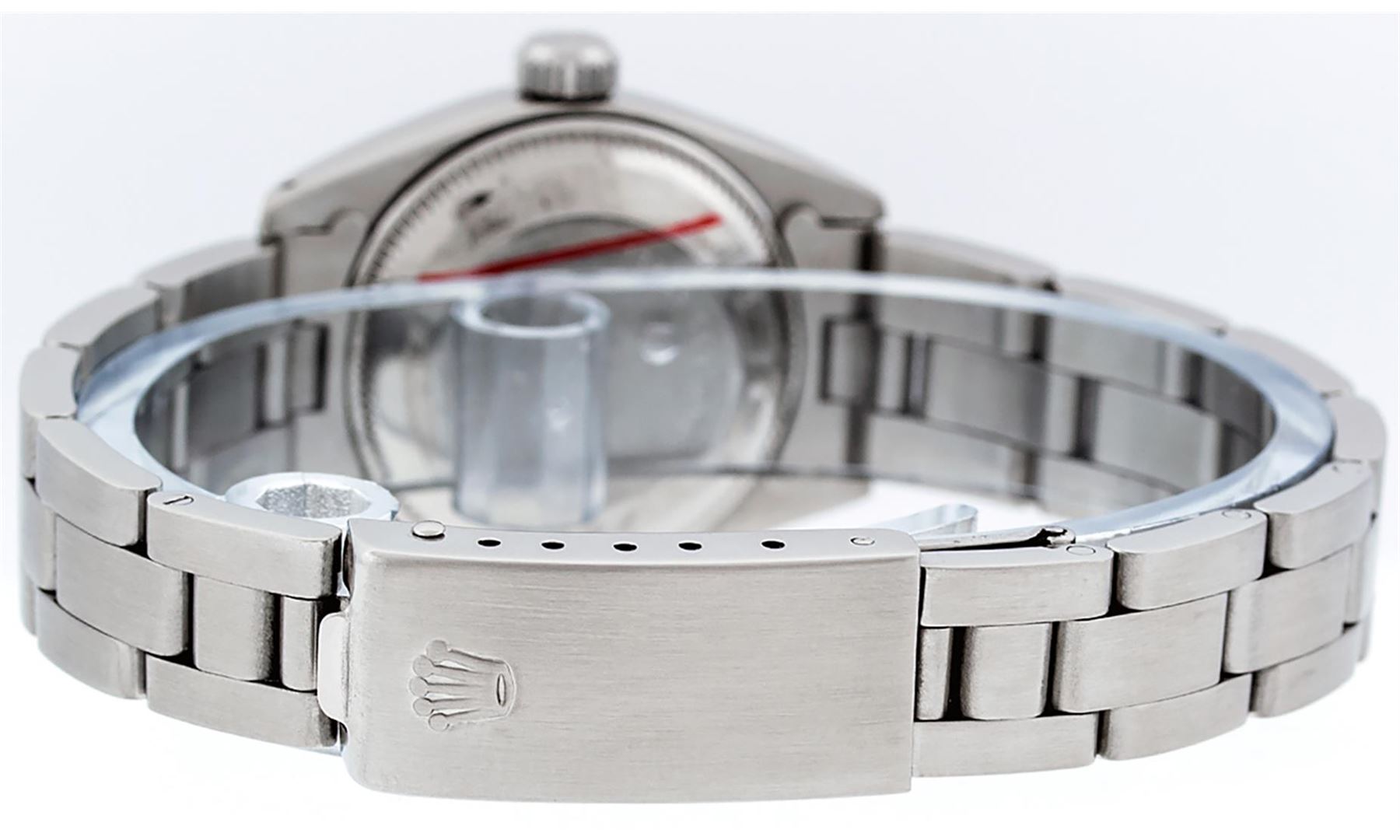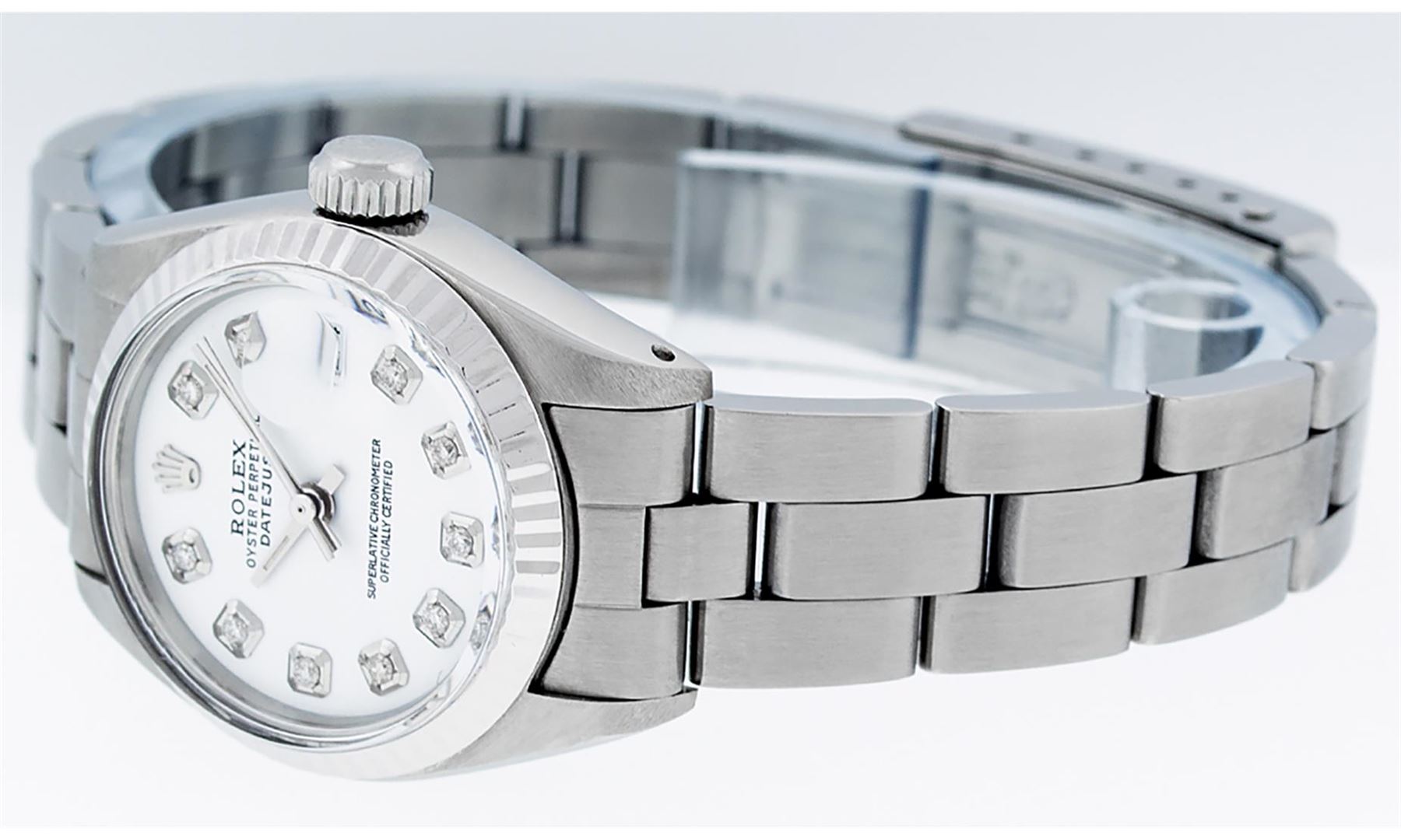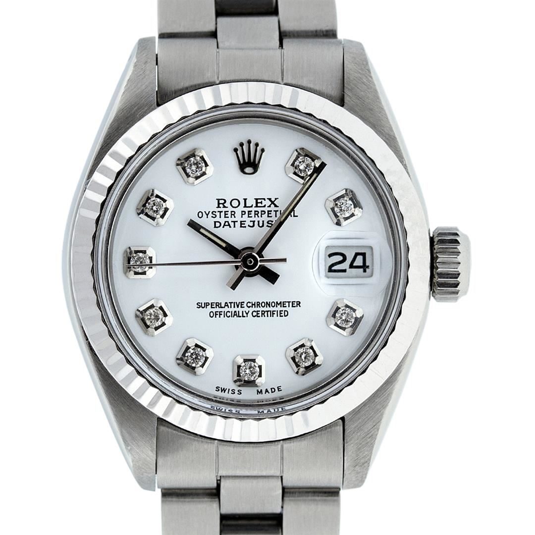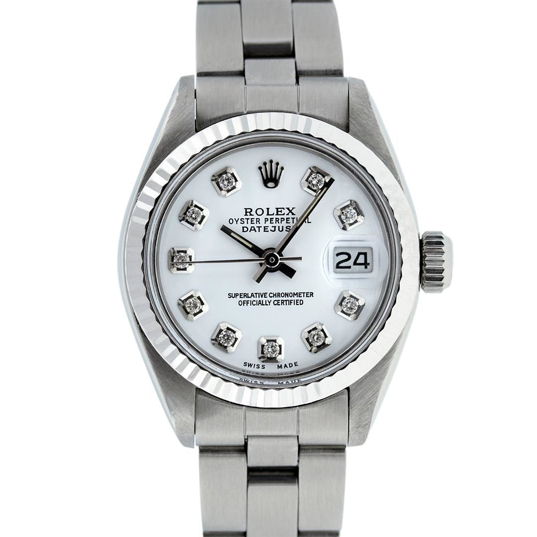 One Ladies Stainless Steel Rolex Datejust Polished Bright with Satin Finish, Serviced & Electronically Tested, Stainless Steel Case: 26mm, Stainless Steel Crown, Bezel: 14K White Gold Bezel. Custom Crystal: New Acrylic Cyclops Lens. Custom Hands: New Luminescent Hands. Movement: Automatic Winding Movement Caliber 2030. Dial: White Diamond Dial, Diamond Count: 10 Diamonds In Dial, Color: G to H, Clarity: SI-VS. Date Window: 3 O'Clock Position Date Display, Model: Datejust. Condition: G-6 Extra Fine. Bracelet: Stainless Steel Oyster Band. Bright Polish & Satin Finish. 6.0 Inch Length, Adjustable. Standard Clasp, With Rolex Logo. This Watch Has Been Serviced Time Tested And Is In Excellent Condition It Is Free Of All Scratches And Dents.