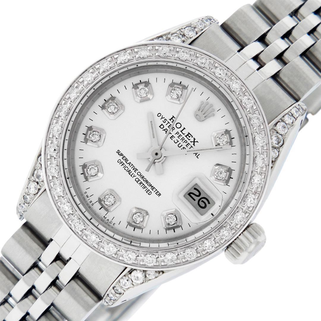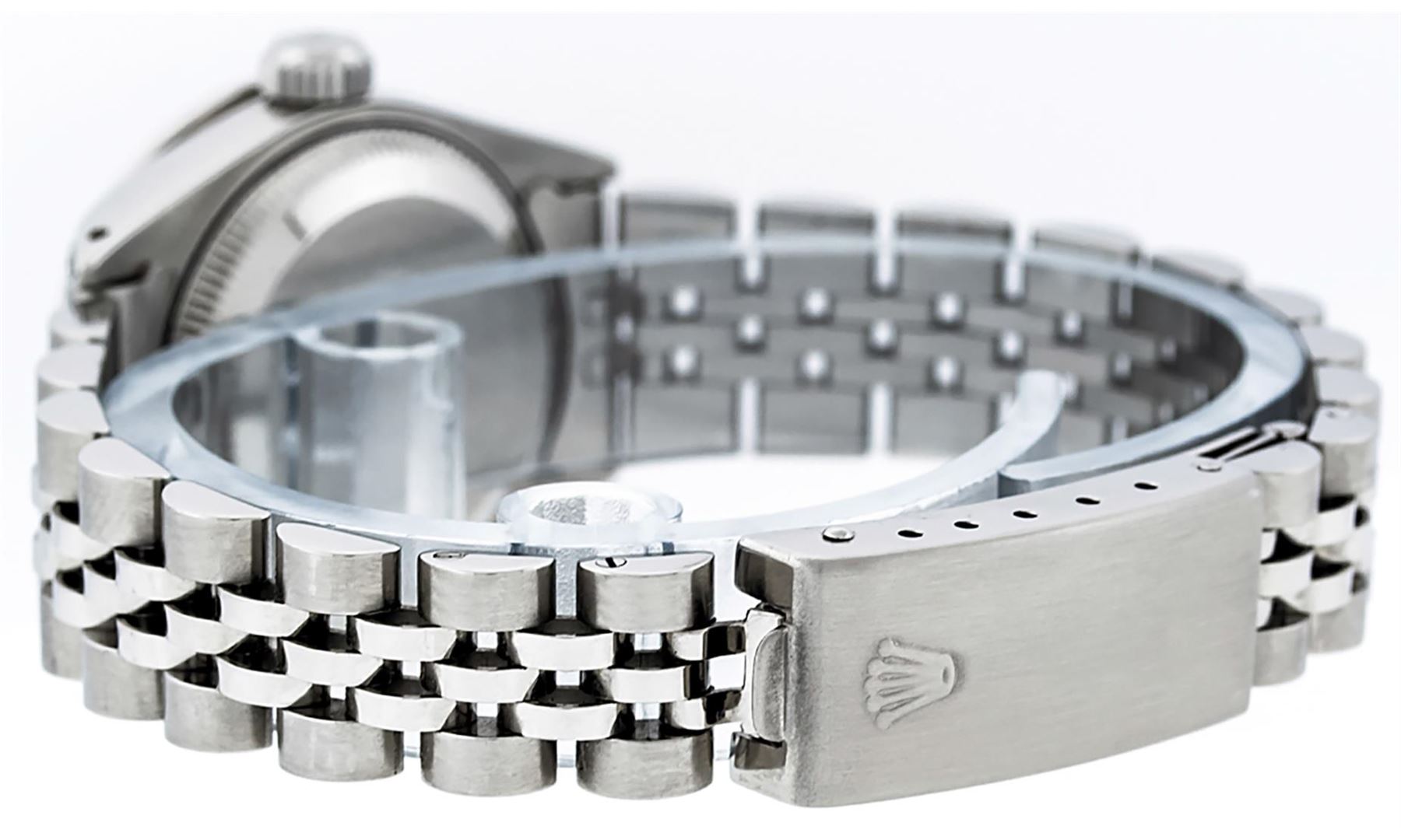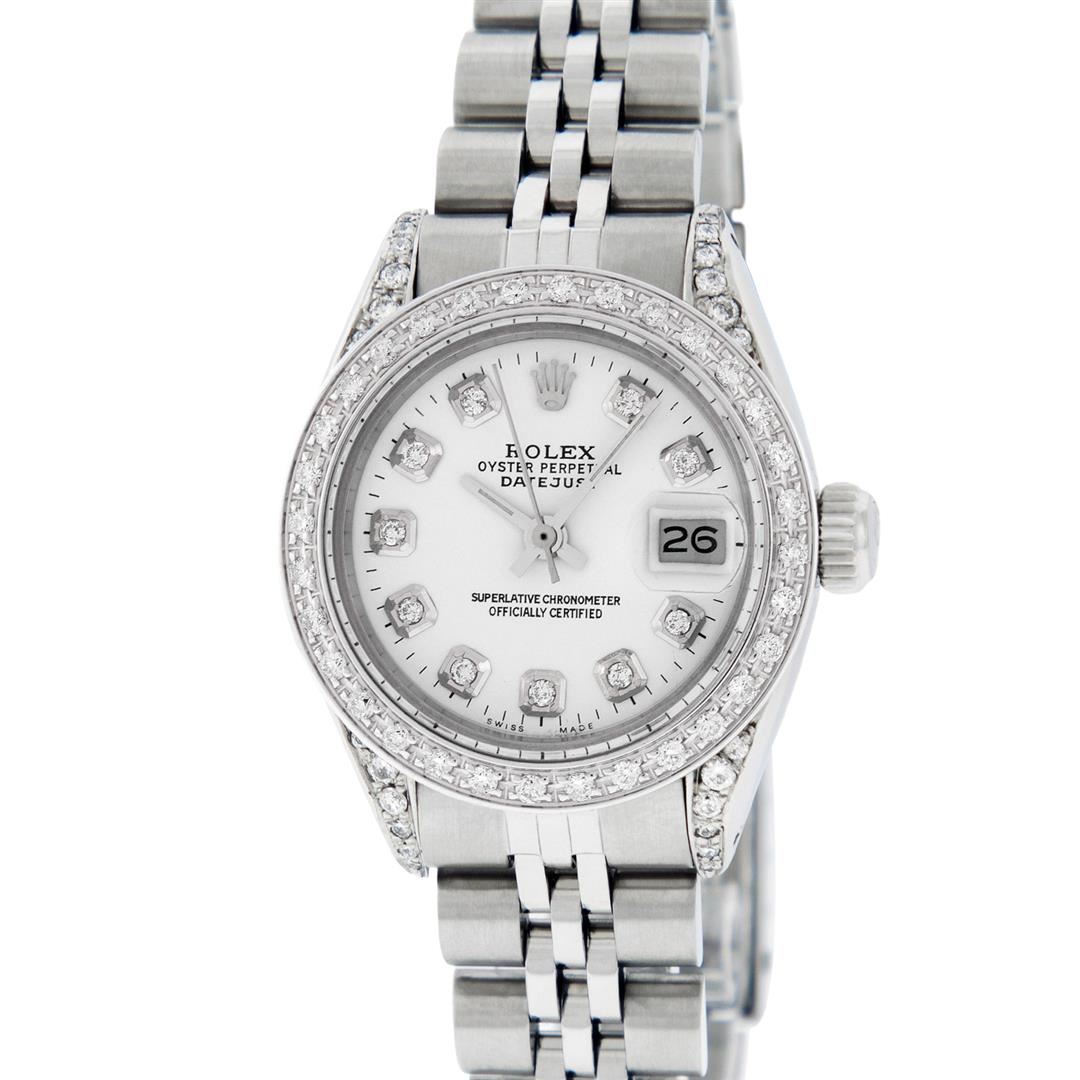 One Ladies Stainless Steel Rolex Datejust Polished Bright with Satin Finish, Serviced & Electronically Tested, Stainless Steel Case: 26mm, Stainless Steel Crown, Diamond Lugs: 24 Diamonds On Lugs, Clarity: SI-VS, Color: G to H. Custom Bezel: New 18K White Gold Diamond Beadset Bezel, Diamond Count: 32 Diamonds, Total Weight .70 Carat, Clarity: SI-VS, Color: G to H. Custom Crystal: New Scratch Resistant Synthetic Sapphire Cyclops Lens. Custom Hands: New Luminescent Hands. Movement: Automatic Winding Movement. Custom Dial: Refinished White Diamond Dial With Dash Track, 10 Diamonds in Dial, G To H In Color, Clarity: SI-VS. Date Window: 3 O'clock Position Date Display, Model: Datejust Condition: G-6 Extra Fine. Bracelet: Stainless Steel Jubilee Band. Bright Polish & Satin Finish. 6.0 Inch Length, Adjustable. Standard Clasp, With Rolex Logo. This Watch Has Been Serviced Time Tested And Is In Excellent Condition It Is Free Of All Scratches And Dents.