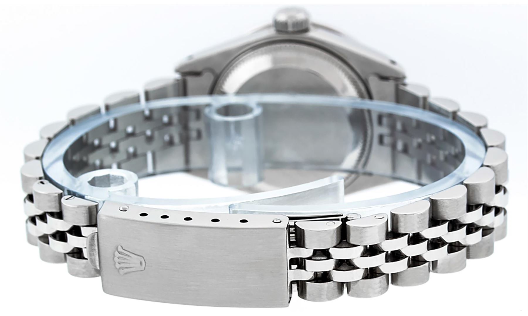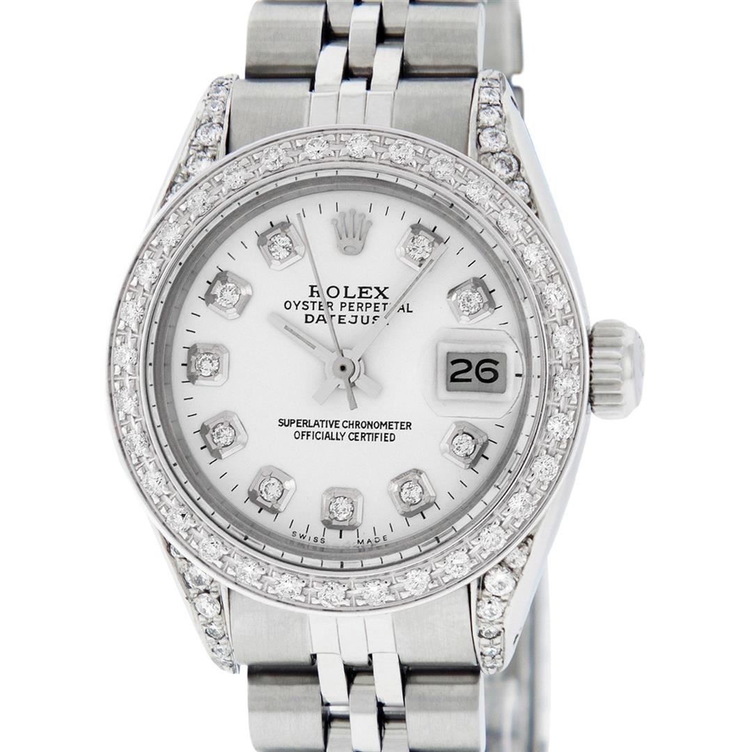 One Ladies Stainless Steel Rolex Datejust Polished Bright with Satin Finish, Serviced & Electronically Tested, Stainless Steel Case: 26mm, Stainless Steel Crown, Diamond Lugs: 24 Diamonds On Lugs, Clarity: SI-VS, Color: G to H. Custom Bezel: New 18K White Gold Diamond Beadset Bezel, Diamond Count: 32 Diamonds, Total Weight .70 Carat, Clarity: SI-VS, Color: G to H. Custom Crystal: New Scratch Resistant Synthetic Sapphire Cyclops Lens. Custom Hands: New Luminescent Hands. Movement: Automatic Winding Movement. Custom Dial: Refinished White Diamond Dial With Dash Track, 10 Diamonds in Dial, G To H In Color, Clarity: SI-VS. Date Window: 3 O'clock Position Date Display, Model: Datejust Condition: G-6 Extra Fine. Bracelet: Stainless Steel Jubilee Band. Bright Polish & Satin Finish. 6.0 Inch Length, Adjustable. Standard Clasp, With Rolex Logo. This Watch Has Been Serviced Time Tested And Is In Excellent Condition It Is Free Of All Scratches And Dents.