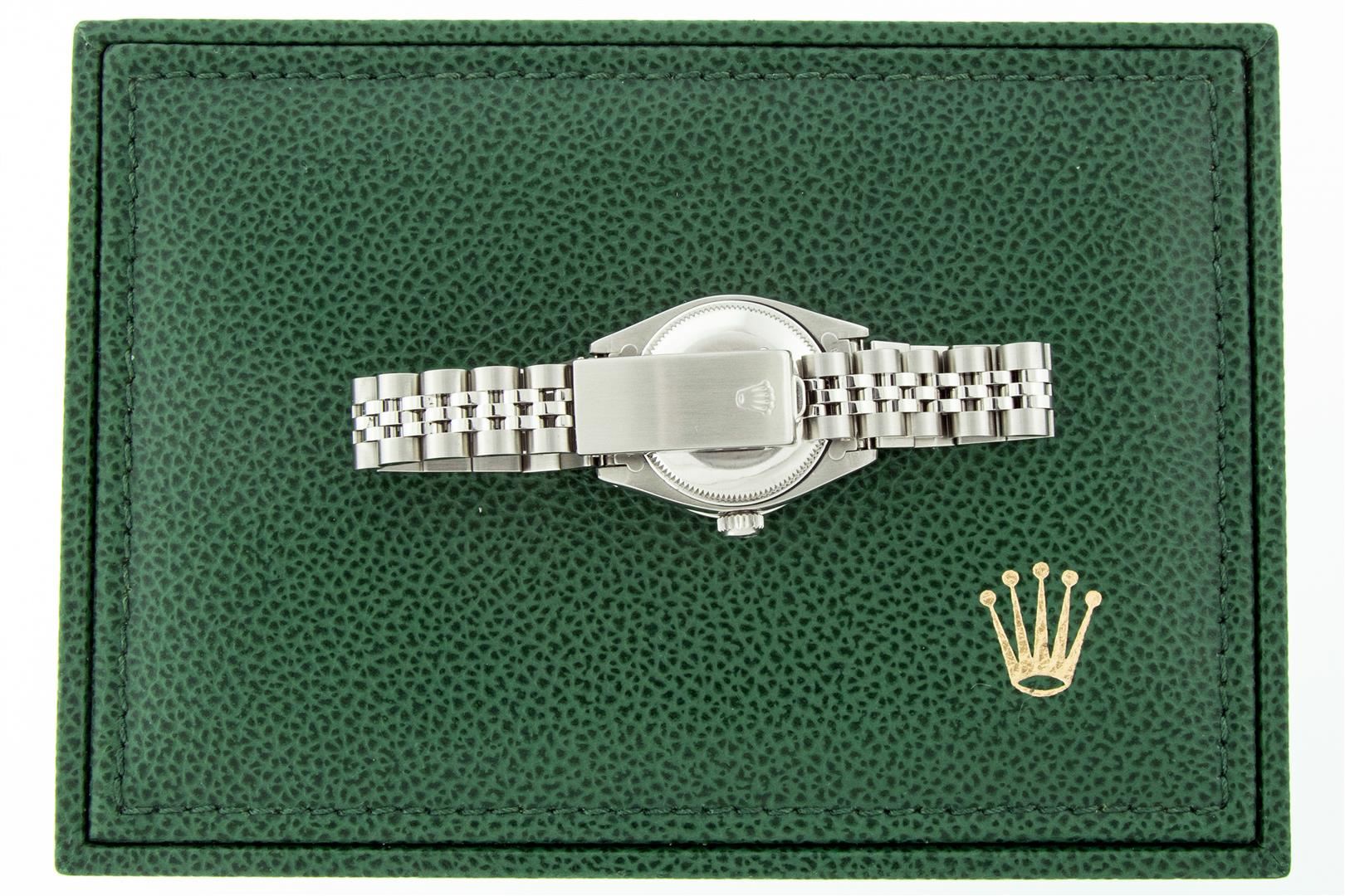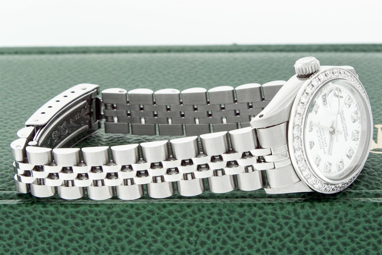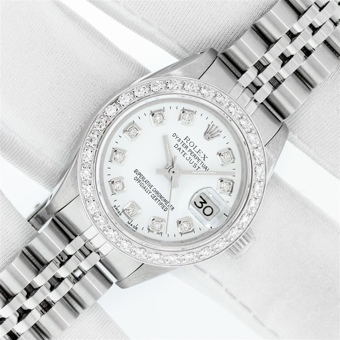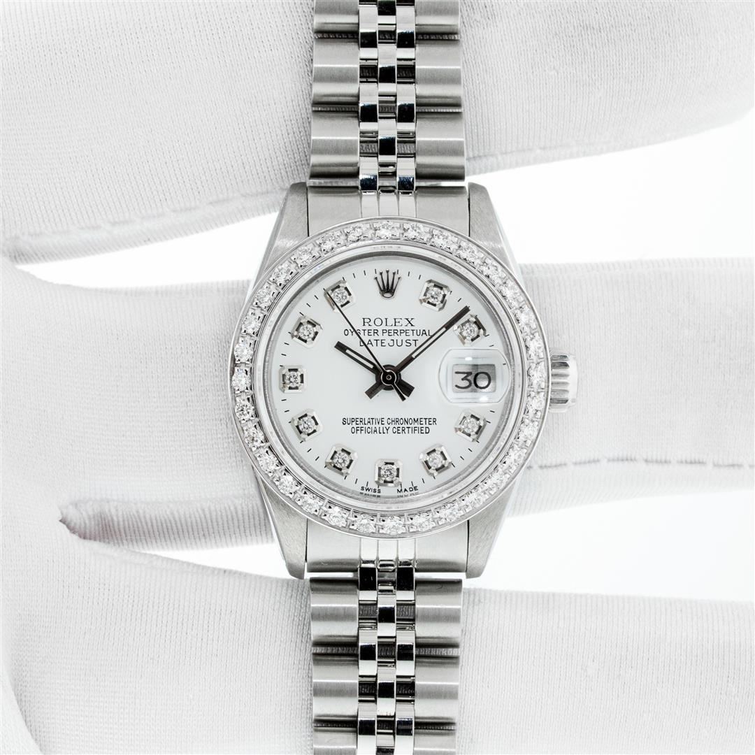 One Ladies Stainless Steel Rolex Datejust Polished Bright with Satin Finish, Serviced & Electronically Tested, Rolex Stainless Steel Case: 26mm, Rolex Stainless Steel Crown, Custom Bezel: New 18K White Gold Beadset Diamond Bezel, Diamond Count: 32 Diamonds, Total Weight .70 Carat, Clarity: SI-VS, Color: G to H. Custom Crystal: New Sapphire With Magnified Date Window. Custom Hands: New Luminescent Hands. Rolex Movement: Automatic Winding Movement. Custom Dial: White Diamond Dial, Diamond Count: 10 Diamonds In Dial, Color: G To H, Clarity: SI-VS. Date Window: 3 O'clock Position Date Display, Model: Datejust. Condition: G-6 Extra Fine. Bracelet: Stainless Steel Jubilee. Bright Polish & Satin Finish. 6.0 Inch Length, Adjustable. Standard Clasp, With Rolex Logo. This Pre Owned Watch Has Been Serviced Time Tested And Is In Excellent Condition It Is Free Of All Scratches And Dents. This Watch Comes With A Rolex Box.
