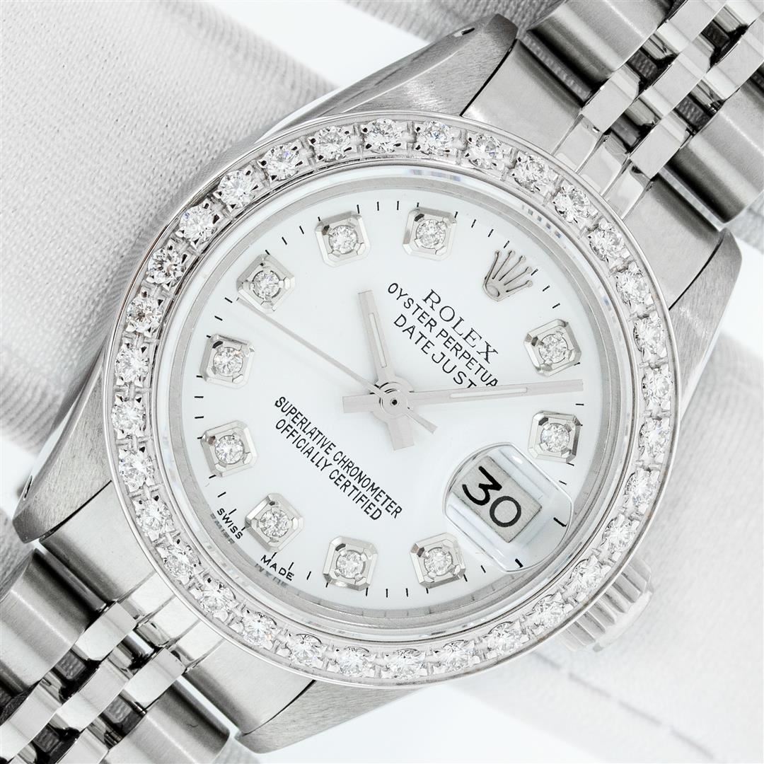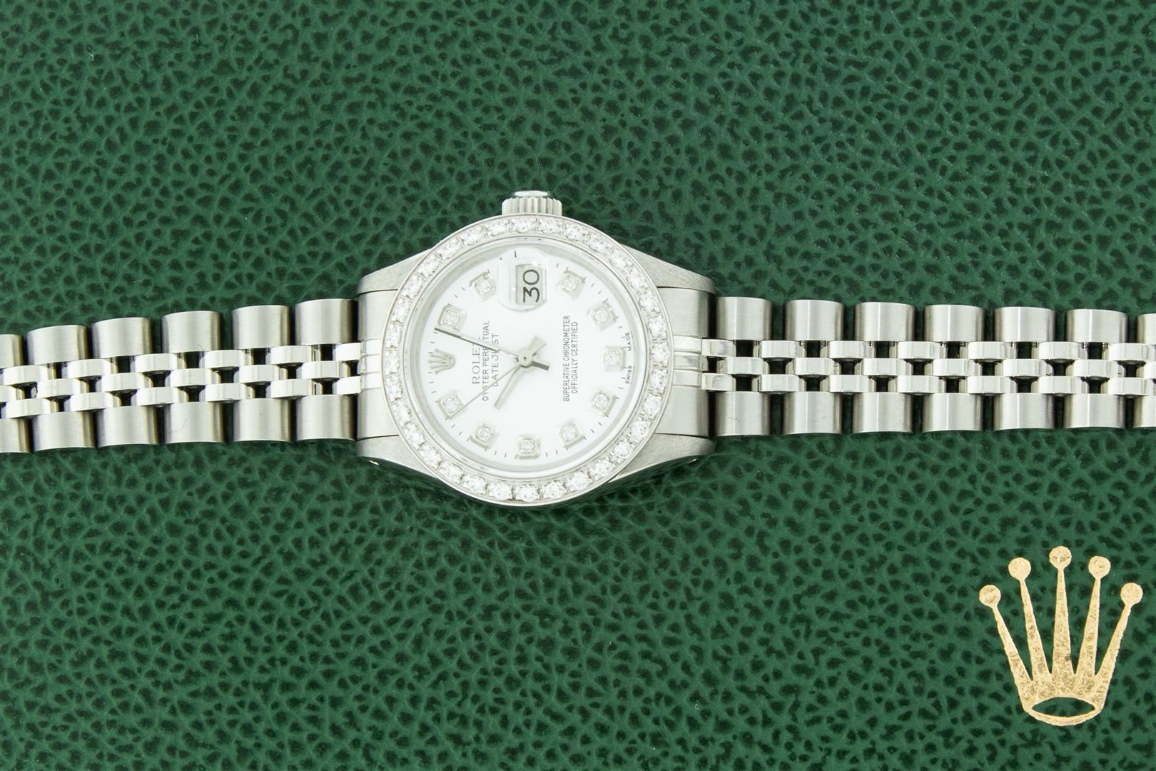 One Ladies Stainless Steel Rolex Datejust Polished Bright with Satin Finish, Serviced & Electronically Tested, Rolex Stainless Steel Case: 26mm, Rolex Stainless Steel Crown, Custom Bezel: New 18K White Gold Beadset Diamond Bezel, Diamond Count: 32 Diamonds, Total Weight .70 Carat, Clarity: SI-VS, Color: G to H. Custom Crystal: New Sapphire With Magnified Date Window. Custom Hands: New Luminescent Hands. Rolex Movement: Automatic Winding Movement. Custom Dial: White Diamond Dial, Diamond Count: 10 Diamonds In Dial, Color: G To H, Clarity: SI-VS. Date Window: 3 O'clock Position Date Display, Model: Datejust. Condition: G-6 Extra Fine. Bracelet: Stainless Steel Jubilee. Bright Polish & Satin Finish. 6.0 Inch Length, Adjustable. Standard Clasp, With Rolex Logo. This Pre Owned Watch Has Been Serviced Time Tested And Is In Excellent Condition It Is Free Of All Scratches And Dents. This Watch Comes With A Rolex Box.