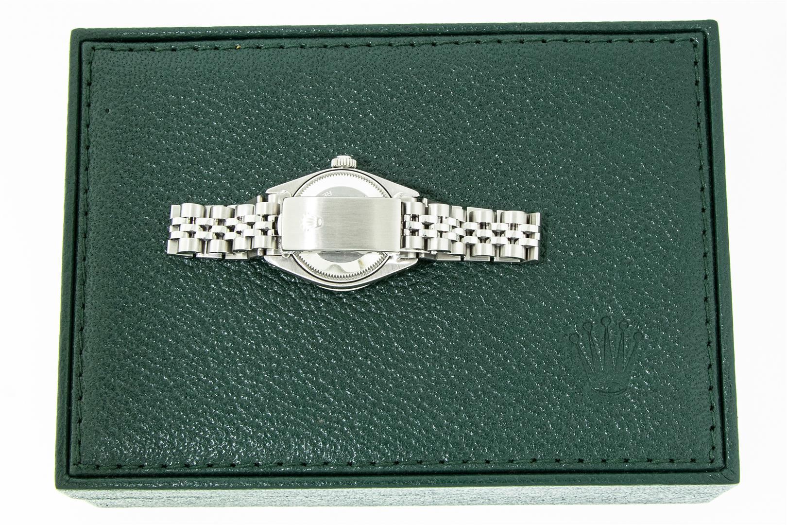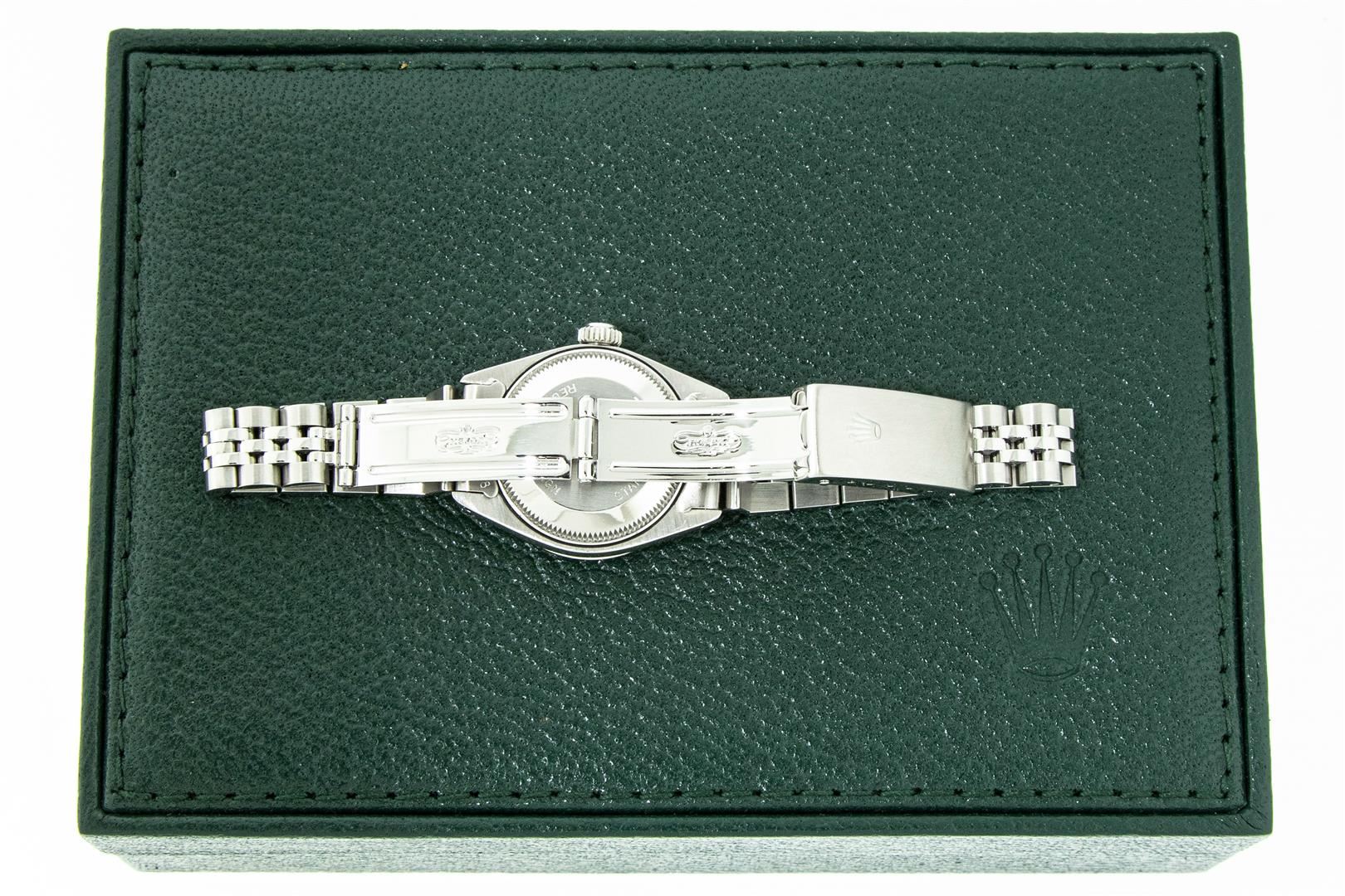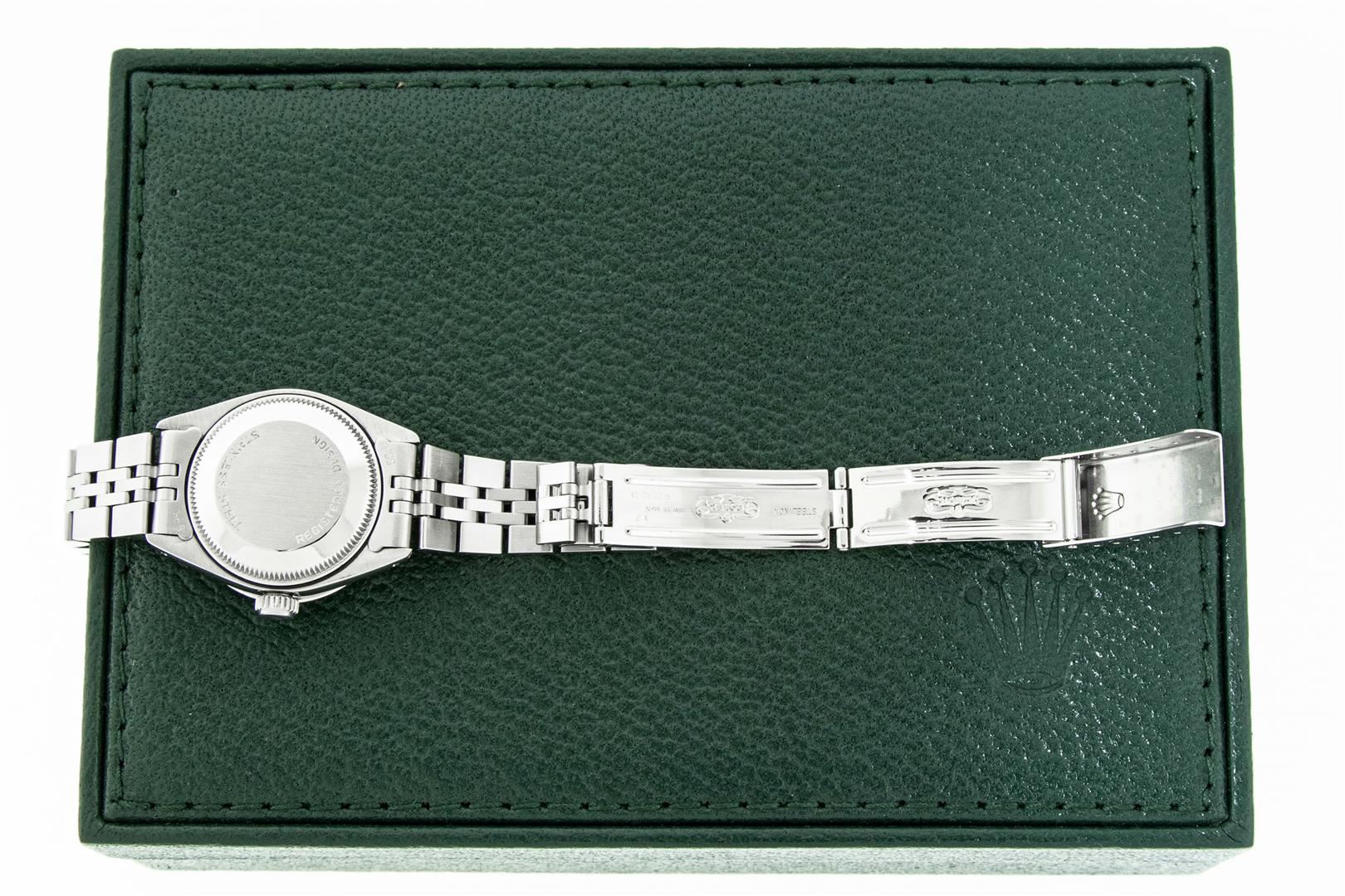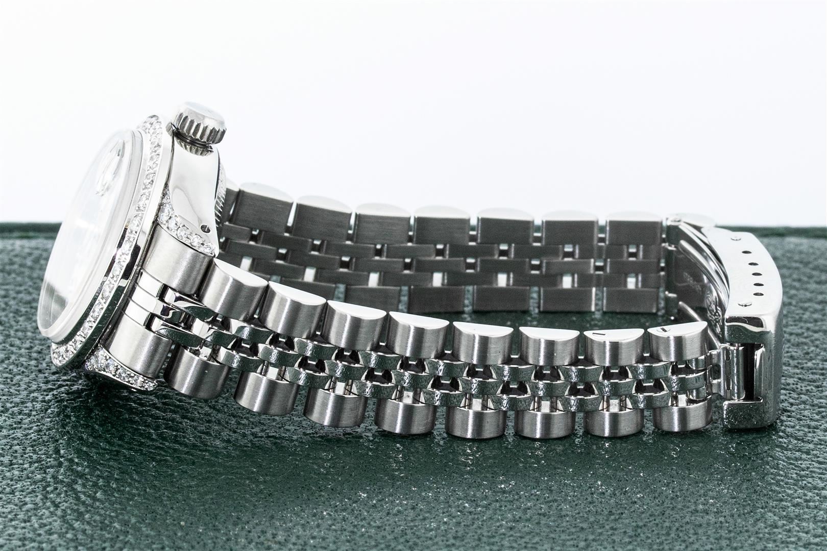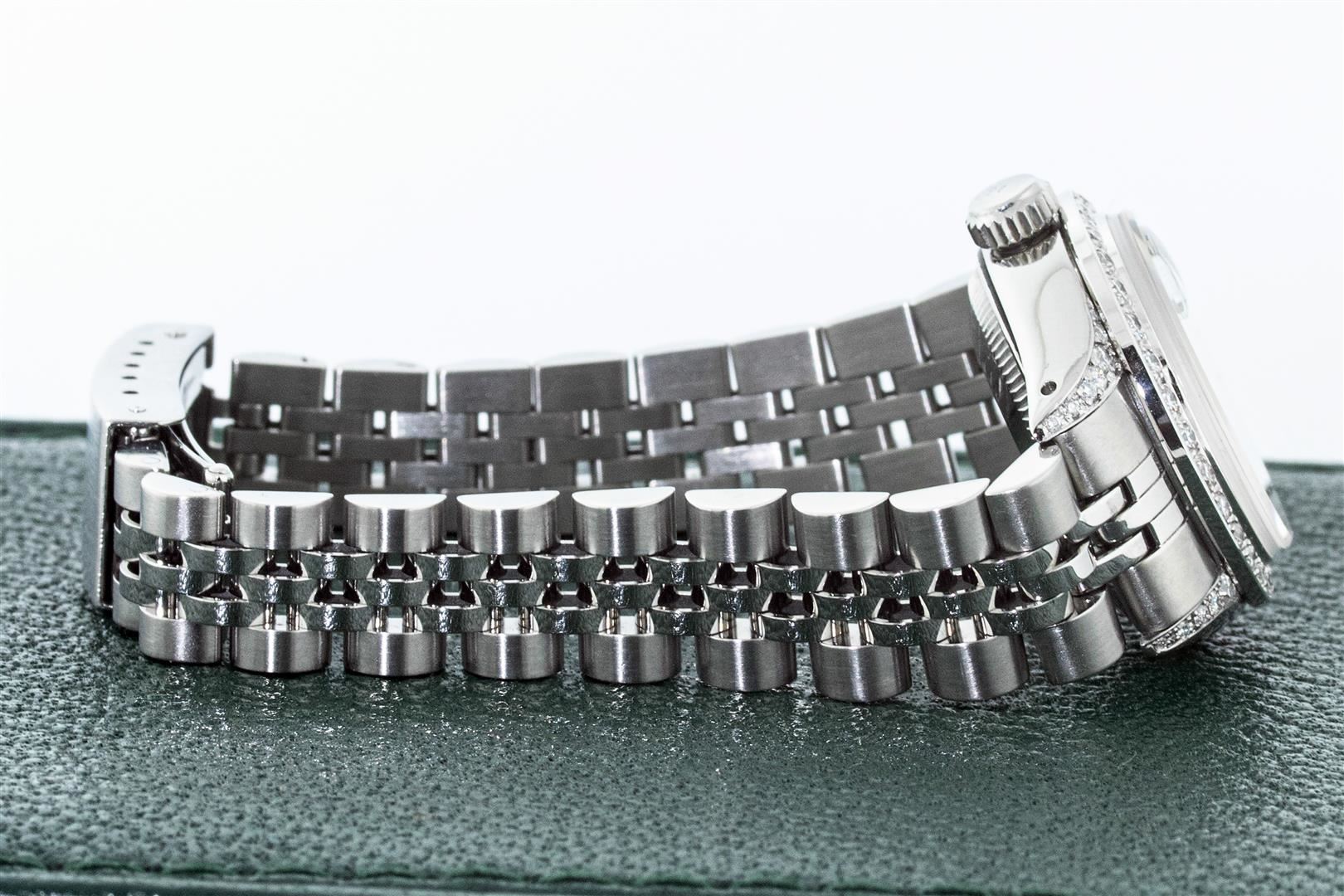 One Ladies Stainless Steel Rolex Datejust Polished Bright with Satin Finish, Serviced & Electronically Tested, Rolex Stainless Steel Case: 26mm, Rolex Stainless Steel Crown, Custom Diamond Lugs: 24 Diamonds On Lugs, Clarity: SI-VS, Color: G to H. Custom Bezel: New 18K White Gold Diamond Beadset Bezel, Diamond Count: 32 Diamonds, Total Weight .70 Carat, Clarity: SI-VS, Color: G to H. Custom Crystal: New Sapphire With Magnified Date Window. Custom Hands: New Luminescent Hands. Rolex Movement: Automatic Winding Movement. Custom Dial: Refinished To White With Added Diamonds, 10 Diamonds in Dial, G To H In Color, Clarity: SI-VS. Date Window: 3 O'clock Position Date Display, Model: Datejust Condition: G-6 Extra Fine. Rolex Bracelet: Stainless Steel Jubilee Band. Bright Polish & Satin Finish. 6.0 Inch Length, Adjustable. Standard Clasp, With Rolex Logo. This Pre Owned Watch Has Been Serviced Time Tested And Is In Excellent Condition It Is Free Of All Scratches And Dents. This Watch Comes With A Rolex Box.