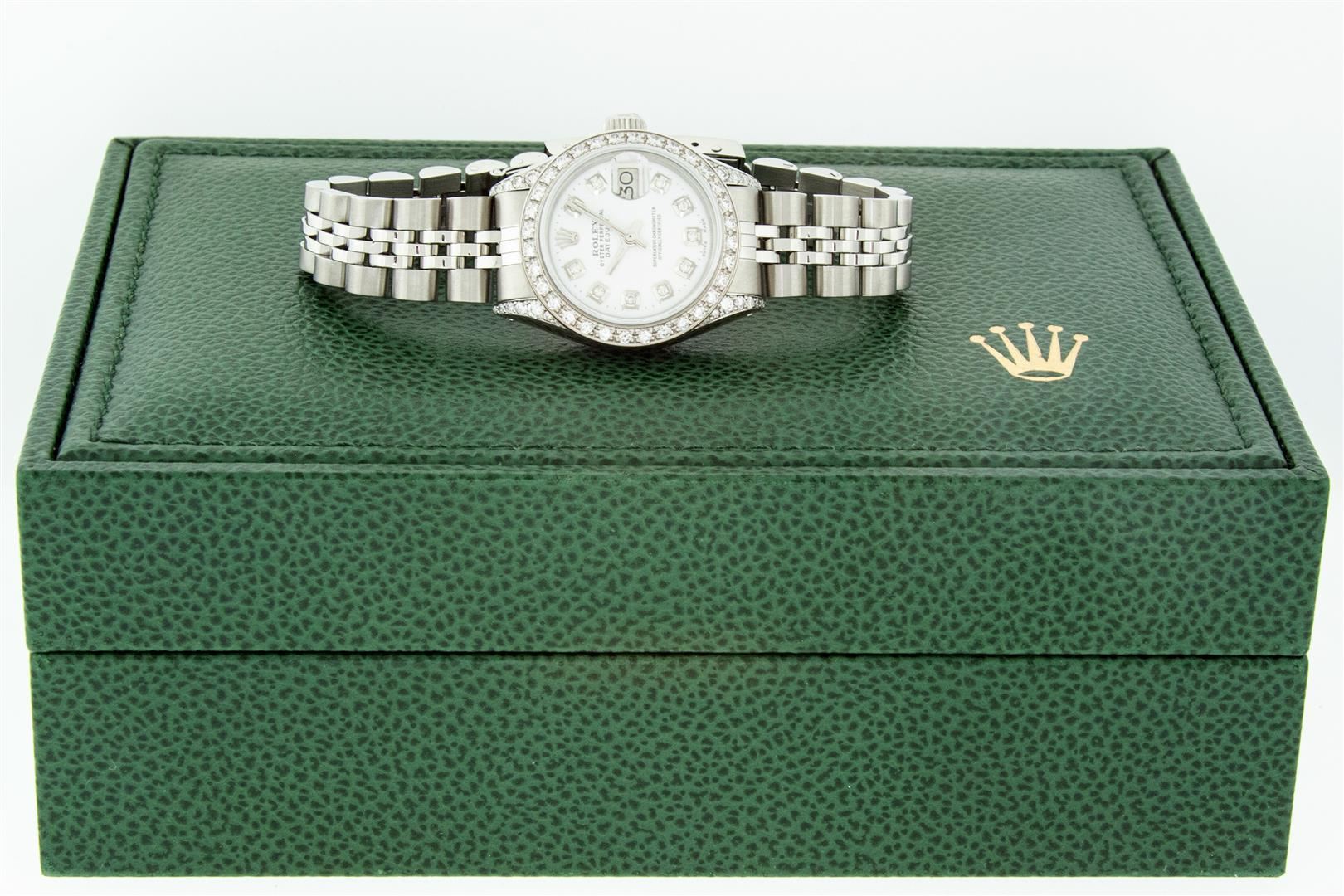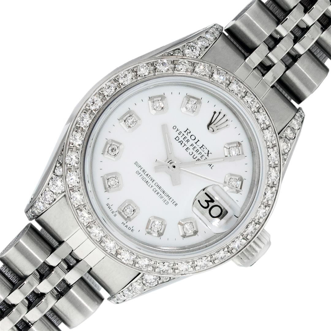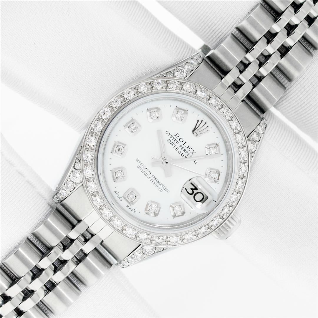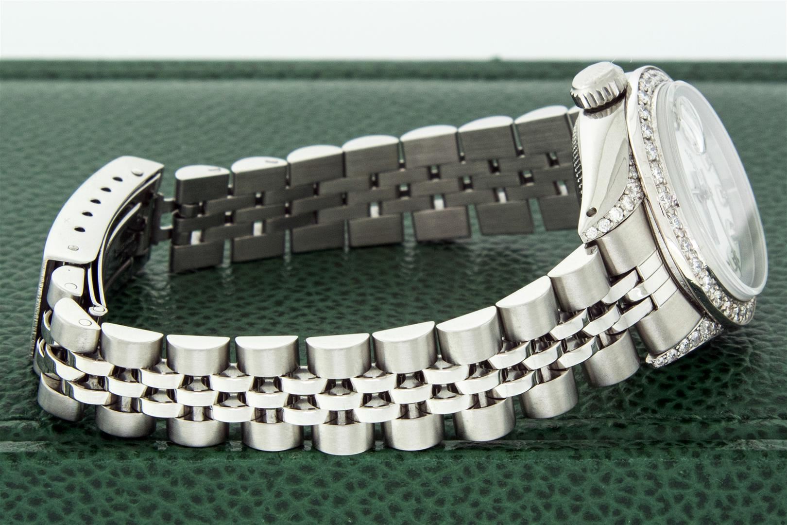 One Ladies Stainless Steel Rolex Datejust Polished Bright with Satin Finish, Serviced & Electronically Tested, Rolex Stainless Steel Case: 26mm, Rolex Stainless Steel Crown, Custom Diamond Lugs: 24 Diamonds On Lugs, Clarity: SI-VS, Color: G to H. Custom Bezel: New 18K White Gold Diamond Beadset Bezel, Diamond Count: 32 Diamonds, Total Weight .70 Carat, Clarity: SI-VS, Color: G to H. Custom Crystal: New Sapphire With Magnified Date Window. Custom Hands: New Luminescent Hands. Rolex Movement: Automatic Winding Movement. Custom Dial: Refinished To White With Custom Added Diamonds, 10 Diamonds in Dial, G To H In Color, Clarity: SI-VS. Date Window: 3 O'clock Position Date Display, Model: Datejust Condition: G-6 Extra Fine. Rolex Bracelet: Stainless Steel Jubilee Band. Bright Polish & Satin Finish. 6.0 Inch Length, Adjustable. Standard Clasp, With Rolex Logo. This Pre Owned Watch Has Been Serviced Time Tested And Is In Excellent Condition It Is Free Of All Scratches And Dents. This Watch Comes With A Rolex Box.