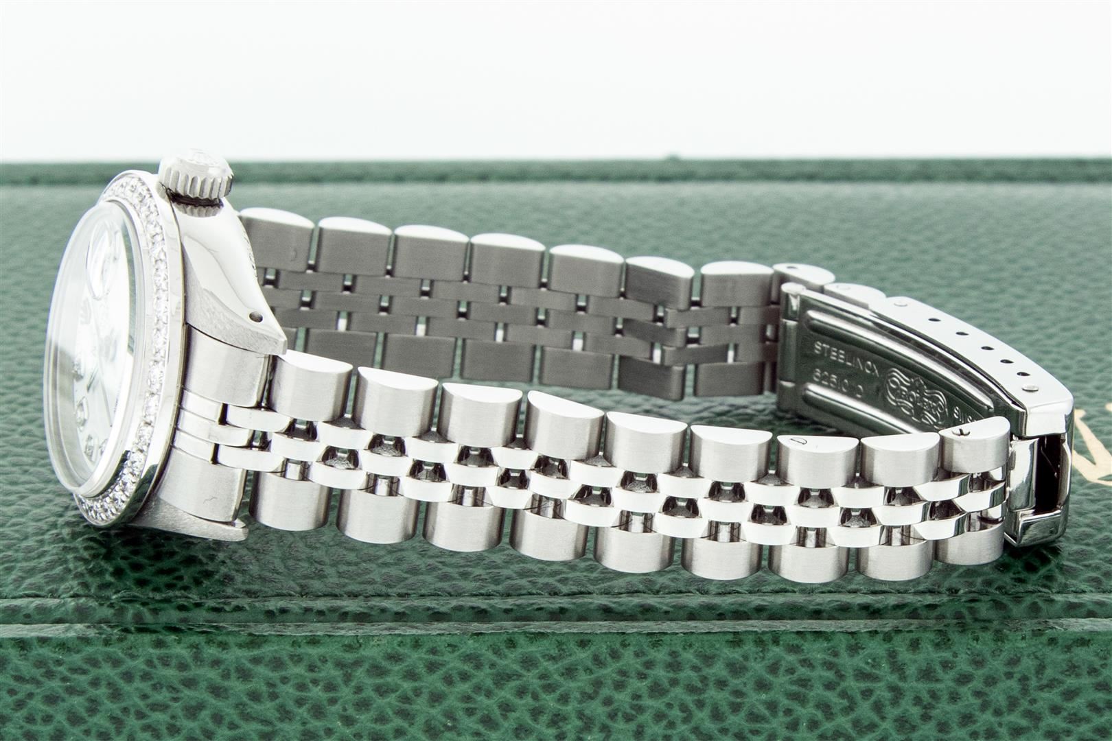 One Ladies Stainless Steel Rolex Datejust Polished Bright with Satin Finish, Serviced & Electronically Tested, Rolex Stainless Steel Case: 26mm, Rolex Stainless Steel Crown, Custom Bezel: New 18K White Gold Beadset Diamond Bezel, Diamond Count: 32 Diamonds, Total Weight .70 Carat, Clarity: SI-VS, Color: G to H. Custom Crystal: New Sapphire With Magnified Date Window. Custom Hands: New Luminescent Hands. Rolex Movement: Automatic Winding Movement. Custom Dial: White Diamond Dial, Diamond Count: 10 Diamonds In Dial, Color: G To H, Clarity: SI-VS. Date Window: 3 O'clock Position Date Display, Model: Datejust. Condition: G-6 Extra Fine. Bracelet: Stainless Steel Jubilee. Bright Polish & Satin Finish. 6.0 Inch Length, Adjustable. Standard Clasp, With Rolex Logo. This Pre Owned Watch Has Been Serviced Time Tested And Is In Excellent Condition It Is Free Of All Scratches And Dents. This Watch Comes With A Rolex Box.