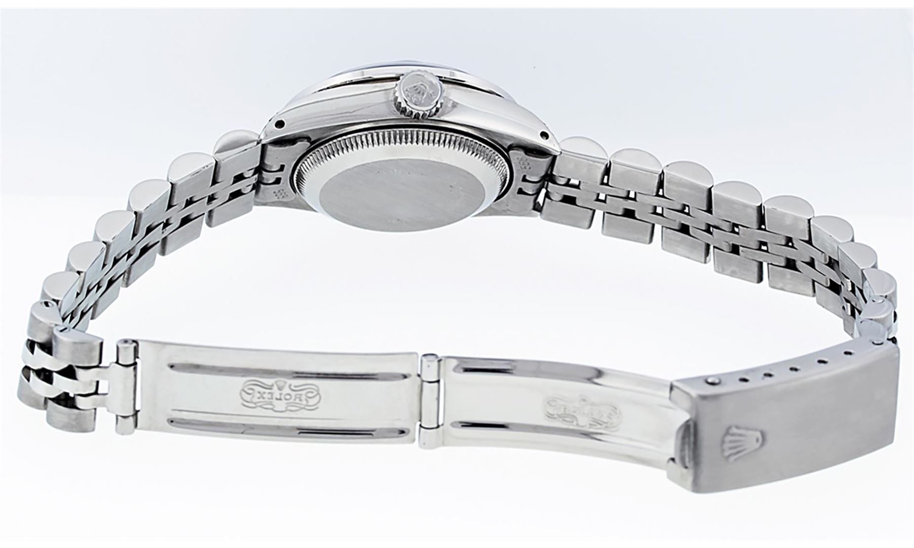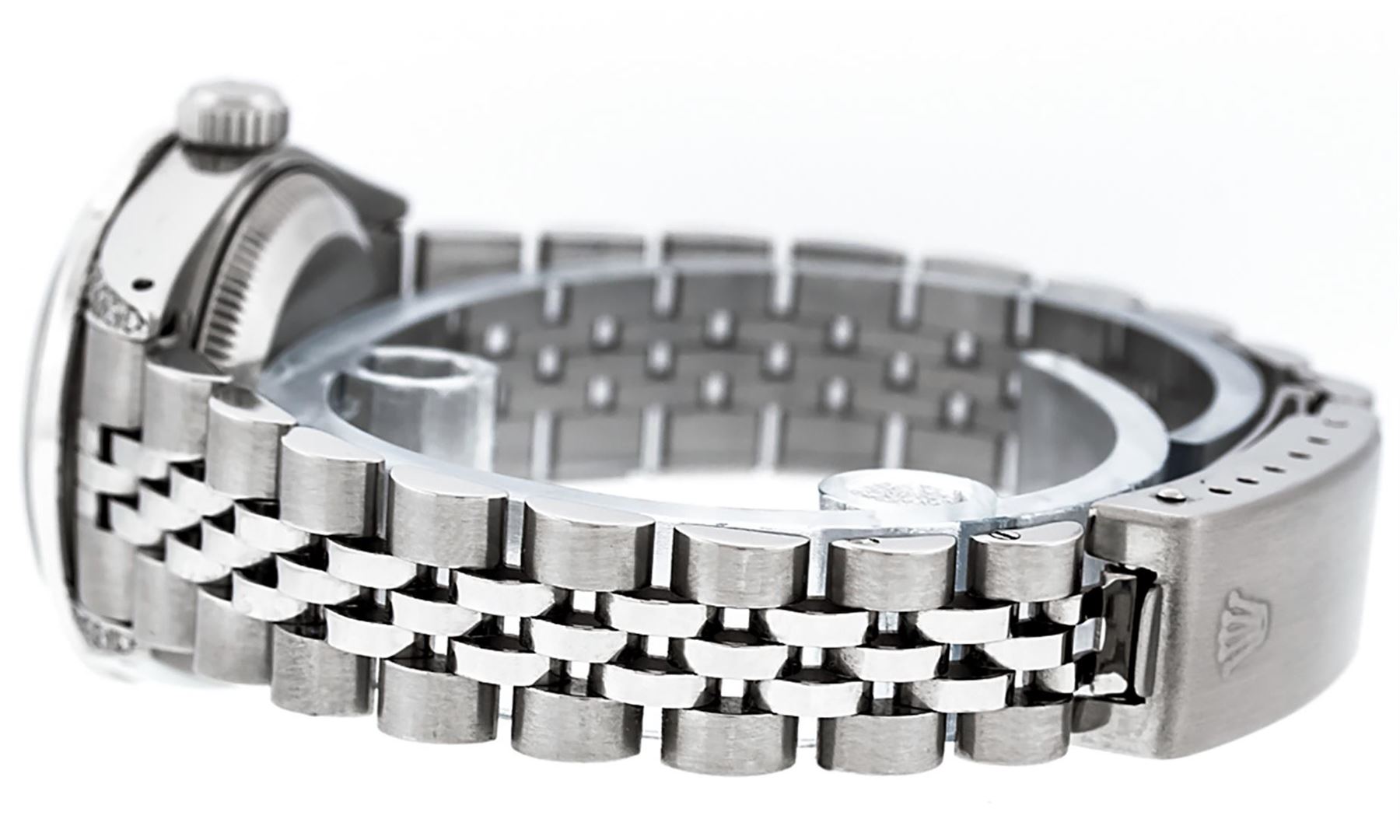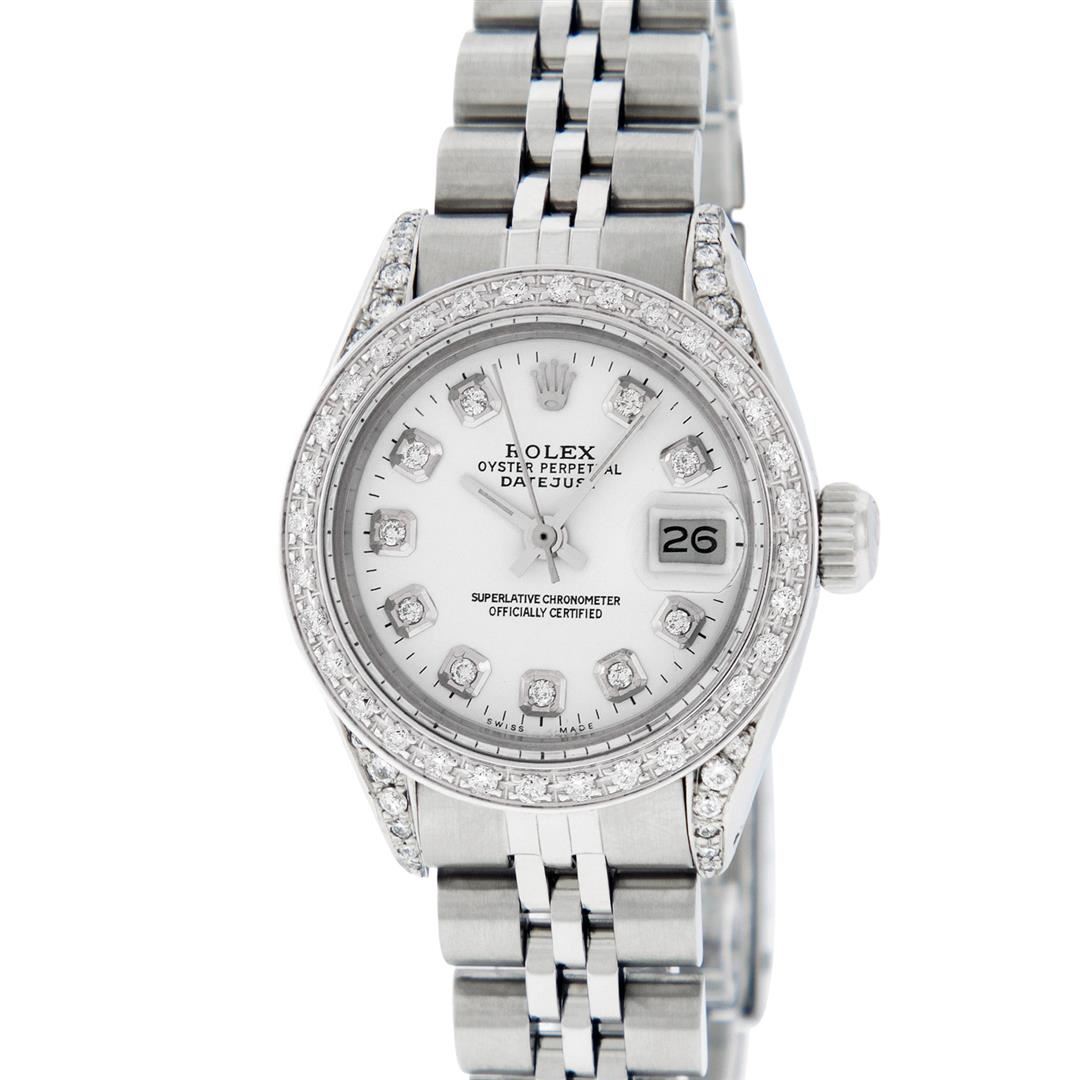 One Ladies Stainless Steel Rolex Datejust Polished Bright with Satin Finish, Serviced & Electronically Tested, Stainless Steel Case: 26mm, Stainless Steel Crown, Diamond Lugs: 24 Diamonds On Lugs, Clarity: SI-VS, Color: G to H. Custom Bezel: New 18K White Gold Diamond Beadset Bezel, Diamond Count: 32 Diamonds, Total Weight .70 Carat, Clarity: SI-VS, Color: G to H. Custom Crystal: New Scratch Resistant Synthetic Sapphire Cyclops Lens. Custom Hands: New Luminescent Hands. Movement: Automatic Winding Movement Caliber 2030. Custom Dial: Refinished White Diamond Dial With Dash Track, 10 Diamonds in Dial, G To H In Color, Clarity: SI-VS. Date Window: 3 O'Clock Position Date Display, Model: Datejust Condition: G-6 Extra Fine. Bracelet: Stainless Steel Jubilee Band. Bright Polish & Satin Finish. 6.0 Inch Length, Adjustable. Standard Clasp, With Rolex Logo. This Watch Has Been Serviced Time Tested And Is In Excellent Condition It Is Free Of All Scratches And Dents.