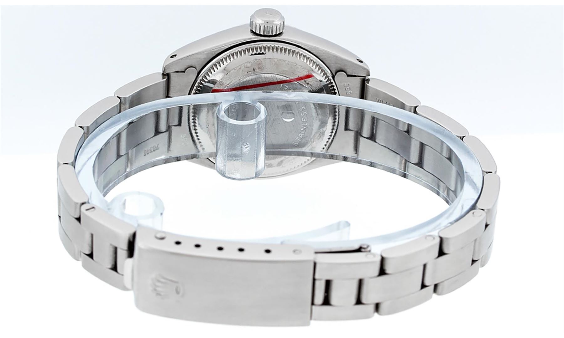 One Ladies Stainless Steel Rolex Datejust Polished Bright with Satin Finish, Serviced & Electronically Tested, Stainless Steel Case: 26mm, Stainless Steel Crown, Bezel: 14K White Gold Bezel. Custom Crystal: New Acrylic Cyclops Lens. Custom Hands: New Luminescent Hands. Movement: Automatic Winding Movement. Dial: White Diamond Dial, Diamond Count: 10 Diamonds In Dial, Color: G to H, Clarity: SI-VS. Date Window: 3 O'Clock Position Date Display, Model: Datejust. Condition: G-6 Extra Fine. Bracelet: Stainless Steel Oyster Band. Bright Polish & Satin Finish. 6.0 Inch Length, Adjustable. Standard Clasp, With Rolex Logo. This Watch Has Been Serviced Time Tested And Is In Excellent Condition It Is Free Of All Scratches And Dents.