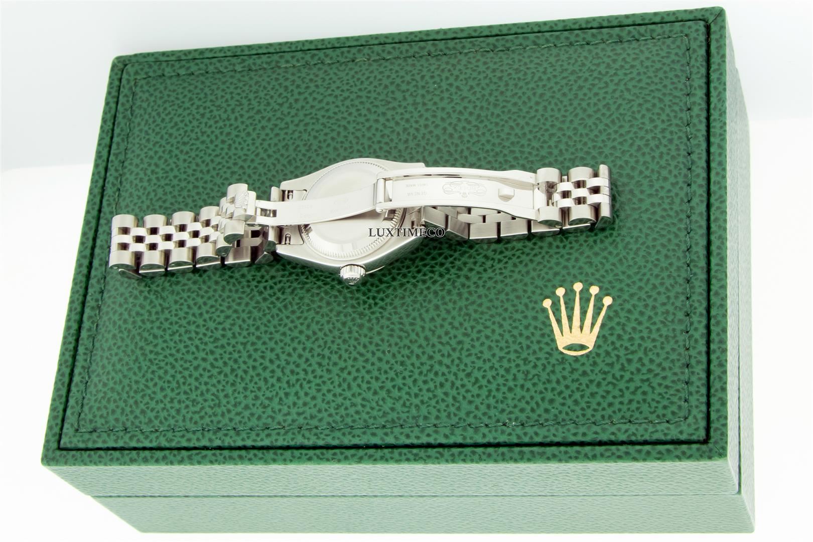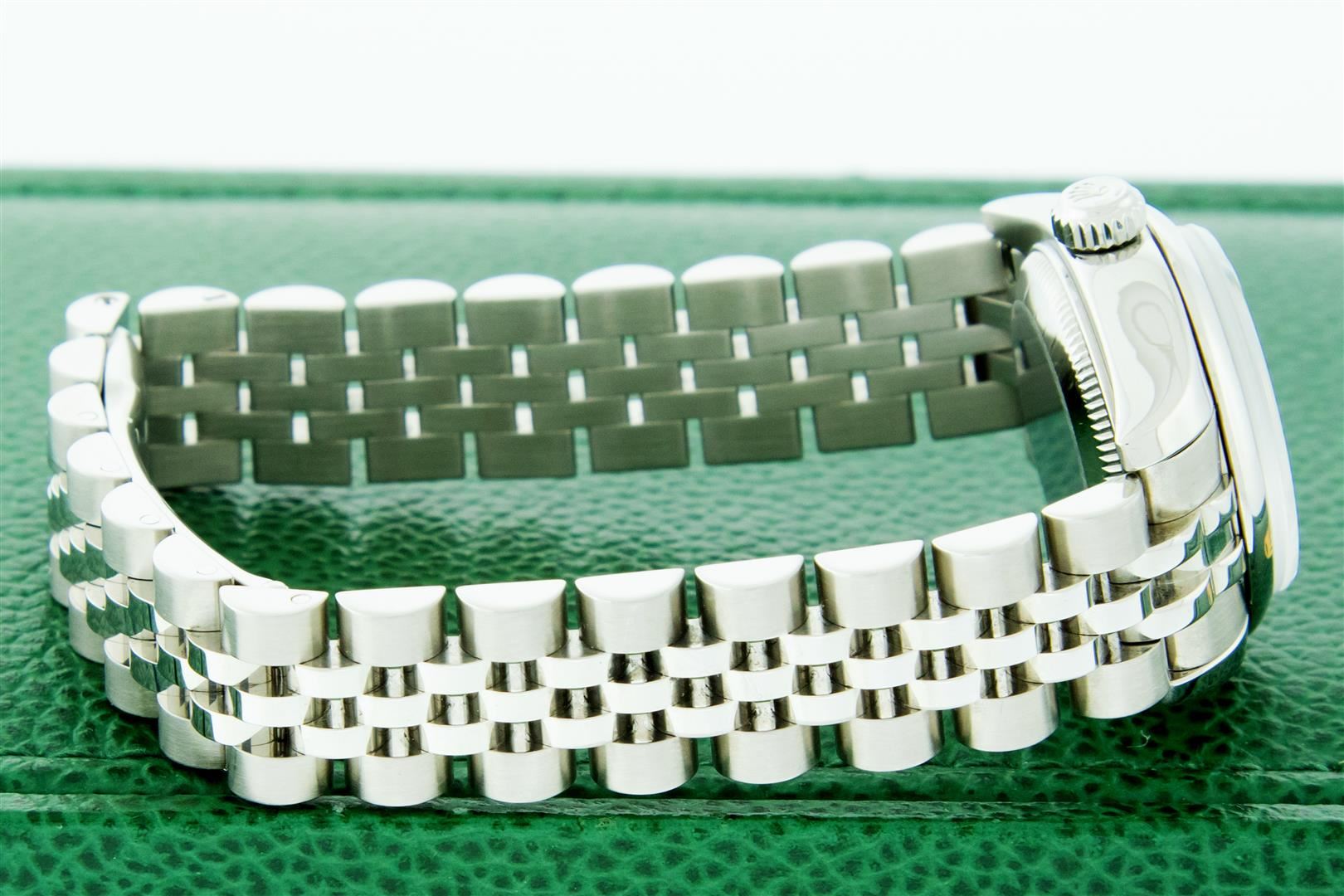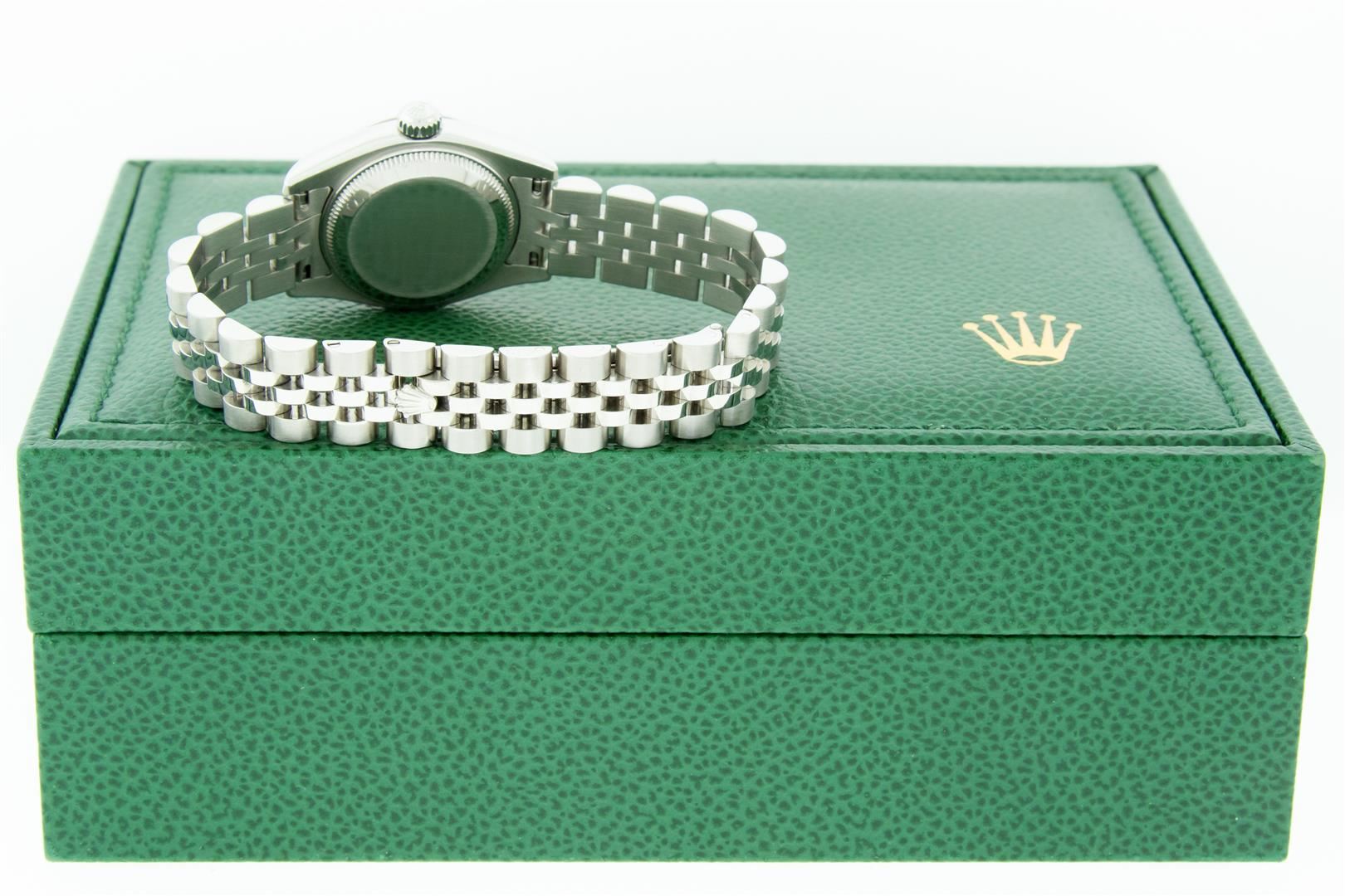 One Ladies Pre Owned Quickset Stainless Steel Rolex Datejust Polished Bright with Satin Finish, Serviced & Electronically Tested, Rolex Stainless Steel Case: 26mm, Rolex Stainless Steel Crown, Rolex Bezel: Stainless Steel Smooth Bezel. Rolex Crystal: Scratch Resistant Sapphire Cyclops Lens. Rolex Hands: Luminescent Hands. Rolex Movement: Automatic Winding Movement. Custom Dial: Refinished To White With Custom Added Genuine Single Cut VS Diamonds, Diamond Count: 10 Single Cut Diamonds In Dial, Color: G to H, Clarity: VS. Date Window: 3 O'clock Position Date Display, Model: Quickset Datejust. Condition: G-6 Extra Fine. Rolex Bracelet: Stainless Steel Jubilee Band. Bright Polish & Satin Finish. 6.0 Inch Length, Adjustable. Standard Clasp, With Rolex Logo. This Watch Has Been Serviced Time Tested And Is In Excellent Condition It Is Free Of All Scratches And Dents. This Watch Includes A Rolex Box.