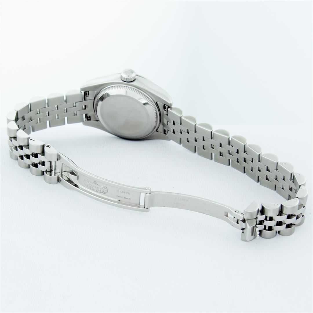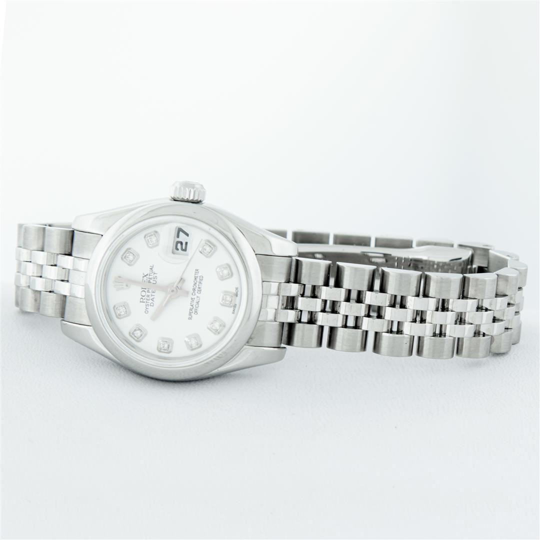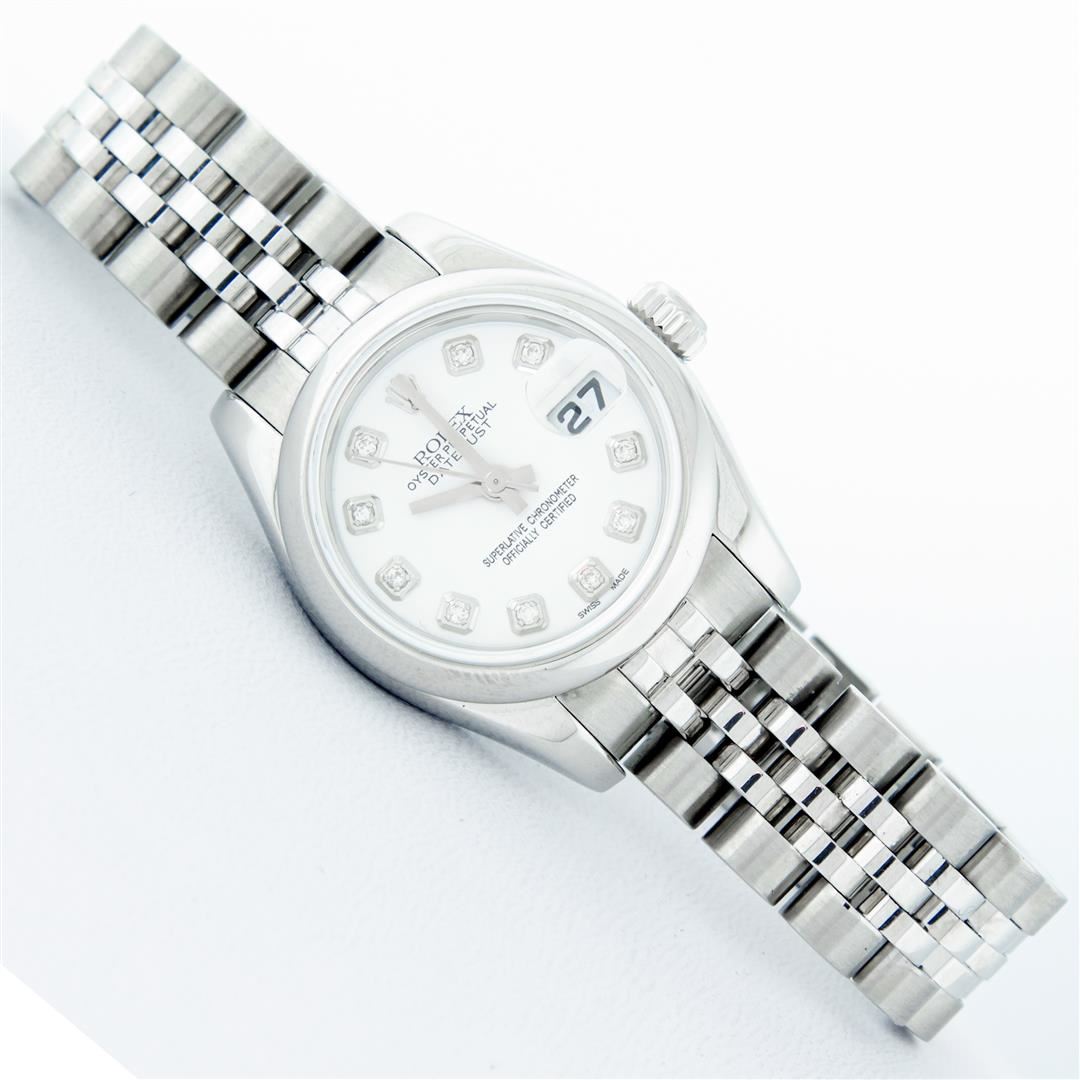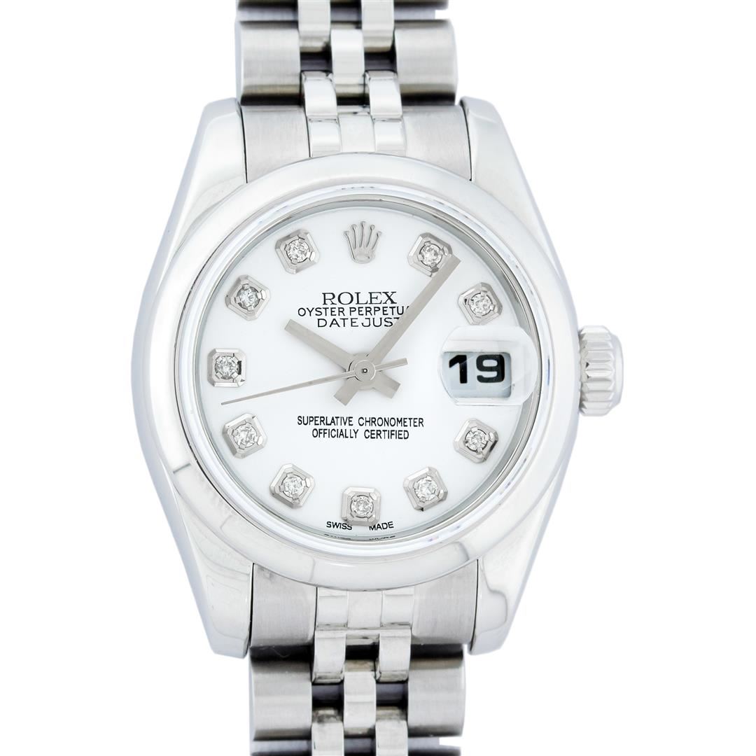 One Ladies Pre Owned Quickset Stainless Steel Rolex Datejust Polished Bright with Satin Finish, Serviced & Electronically Tested, Rolex Stainless Steel Case: 26mm, Rolex Stainless Steel Crown, Rolex Bezel: Stainless Steel Smooth Bezel. Rolex Crystal: Scratch Resistant Sapphire Cyclops Lens. Rolex Hands: Luminescent Hands. Rolex Movement: Automatic Winding Movement. Custom Dial: Refinished To White With Custom Added Single Cut VS Diamonds, Diamond Count: 10 Single Cut Diamonds In Dial, Color: G to H, Clarity: VS. Date Window: 3 O'Clock Position Date Display, Model: Quickset Datejust. Condition: G-6 Extra Fine. Bracelet: Stainless Steel Jubilee Band. Bright Polish & Satin Finish. 6.0 Inch Length, Adjustable. Standard Clasp, With Rolex Logo. This Watch Has Been Serviced Time Tested And Is In Excellent Condition It Is Free Of All Scratches And Dents.