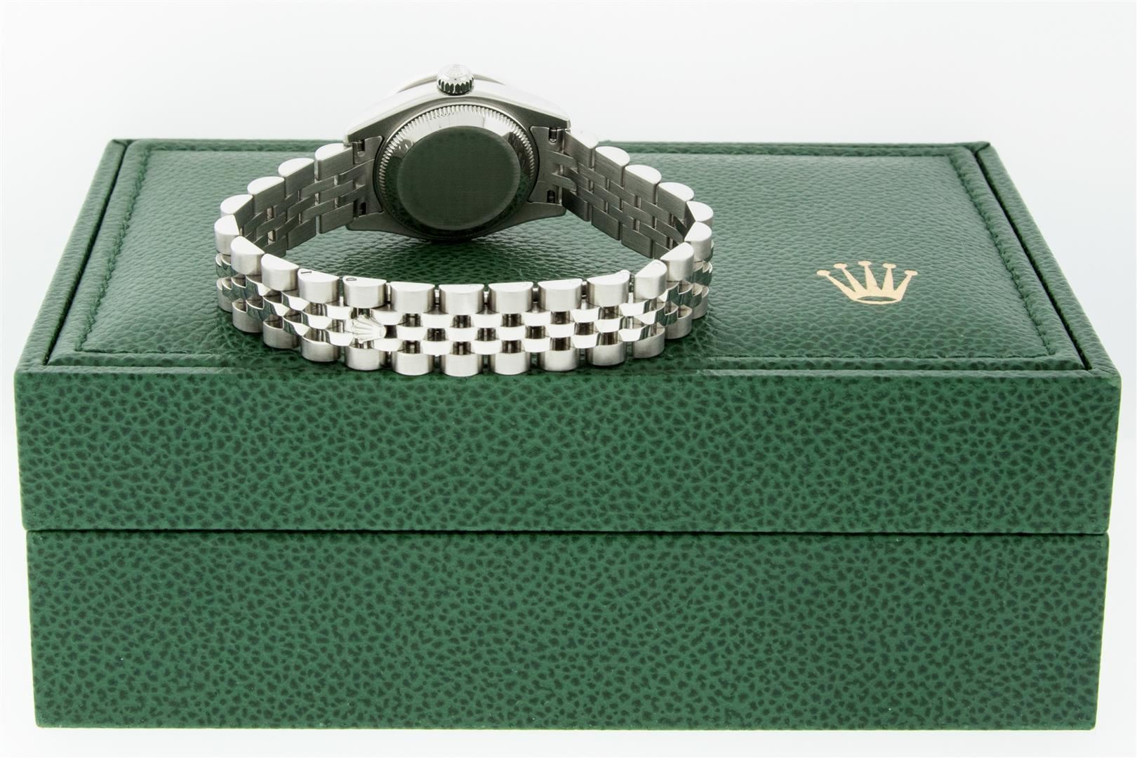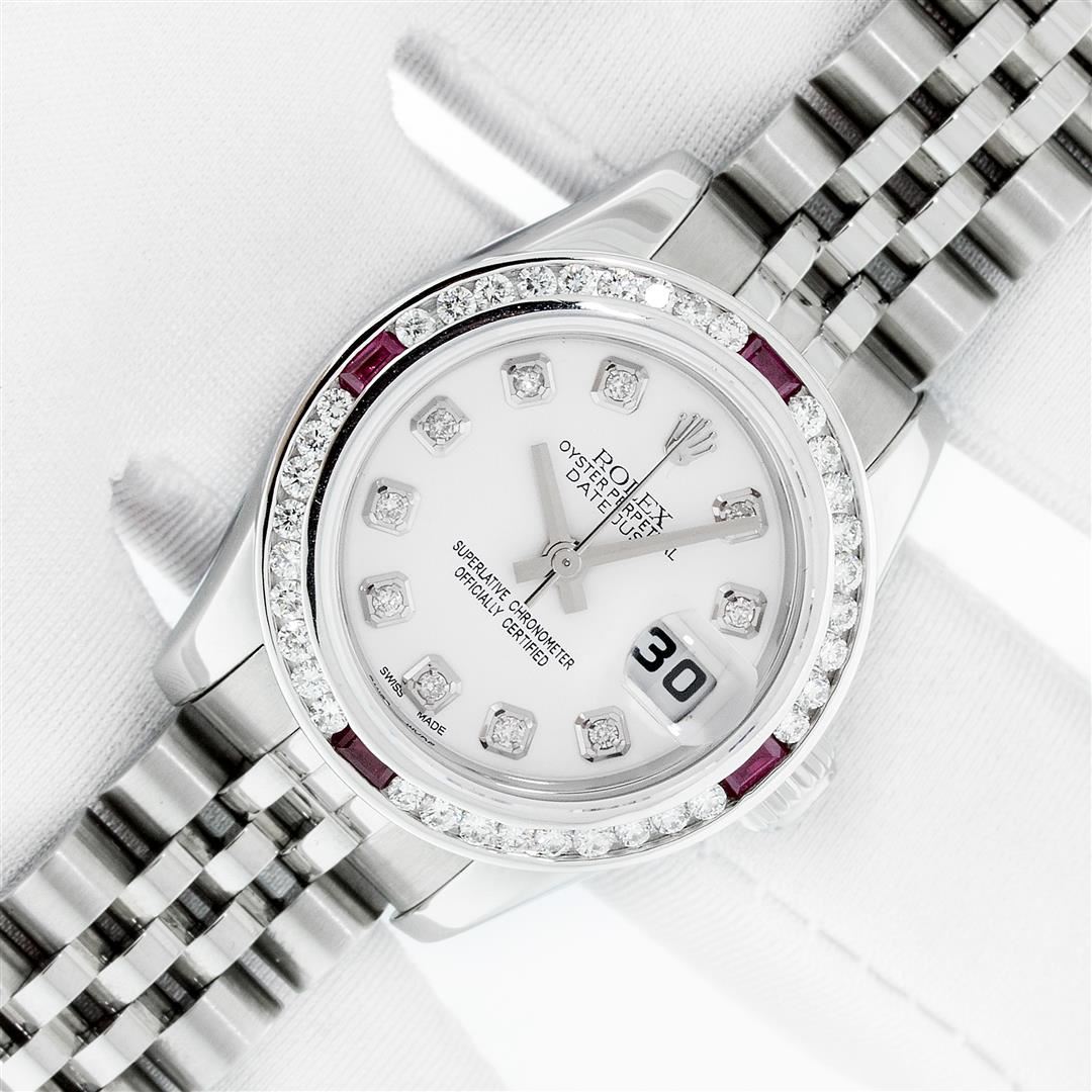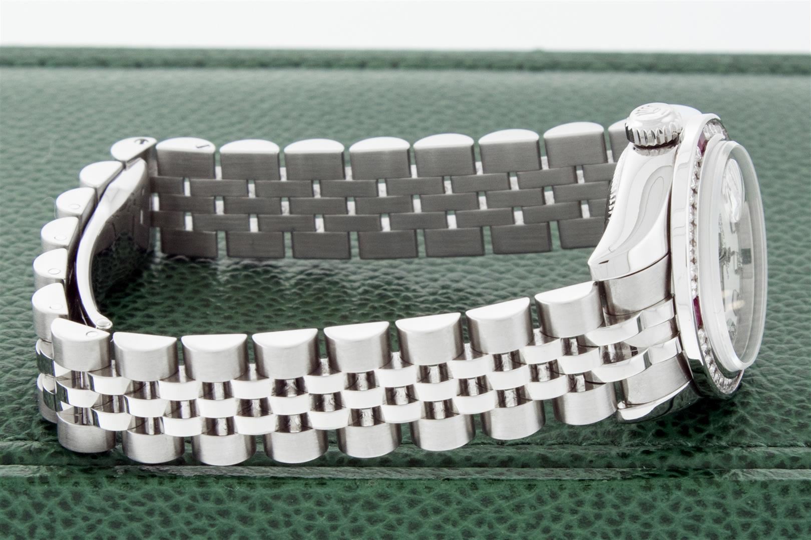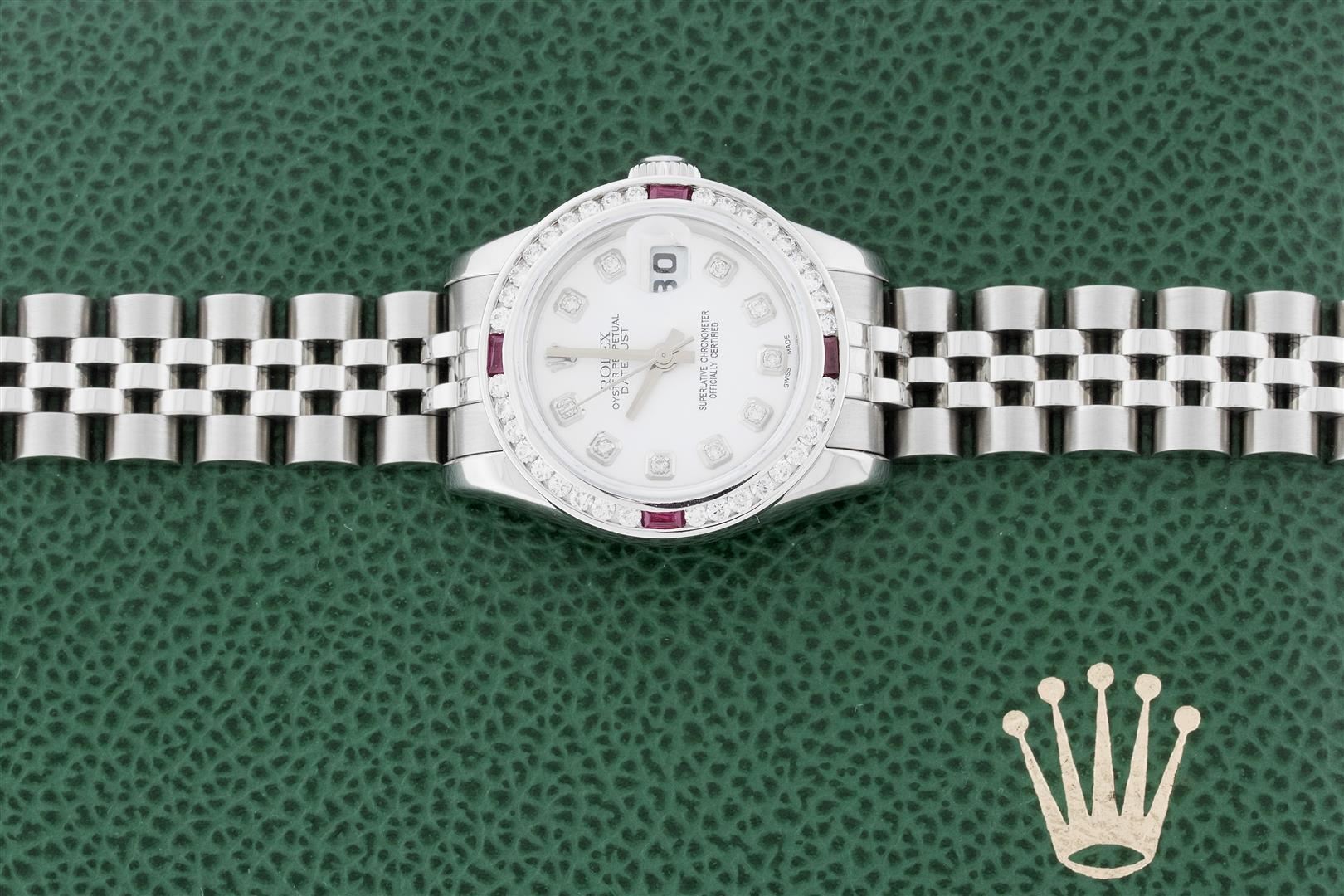 One Ladies Stainless Steel Rolex Datejust Polished Bright with Satin Finish, Serviced & Electronically Tested, Stainless Steel Case: 26mm, Rolex Stainless Steel Crown, Custom Bezel: New 18K White Gold Sapphire Channel Set Diamond Bezel, Diamond + Gem Count: 36 Diamonds + 4 Rubies Total Weight 1.00 Carat, Clarity: SI-VS, Color: G to H. Custom Crystal: New Sapphire With Magnified Date Window. Custom Hands: New Luminescent Hands. Rolex Movement: Automatic Winding Movement. Custom Dial: Refinished To White With Custom Added Diamond Hour Markers. Date Window: 3 O'clock Position Date Display, Model: Datejust. Condition: G-6 Extra Fine. Rolex Bracelet: Stainless Steel Jubilee Band. Bright Polish & Satin Finish. 6.0 Inch Length, Adjustable. Standard Clasp, With Rolex Logo. This Pre Owned Watch Has Been Serviced Time Tested And Is In Excellent Condition It Is Free Of All Scratches And Dents. This Watch Comes With A Rolex Box.
