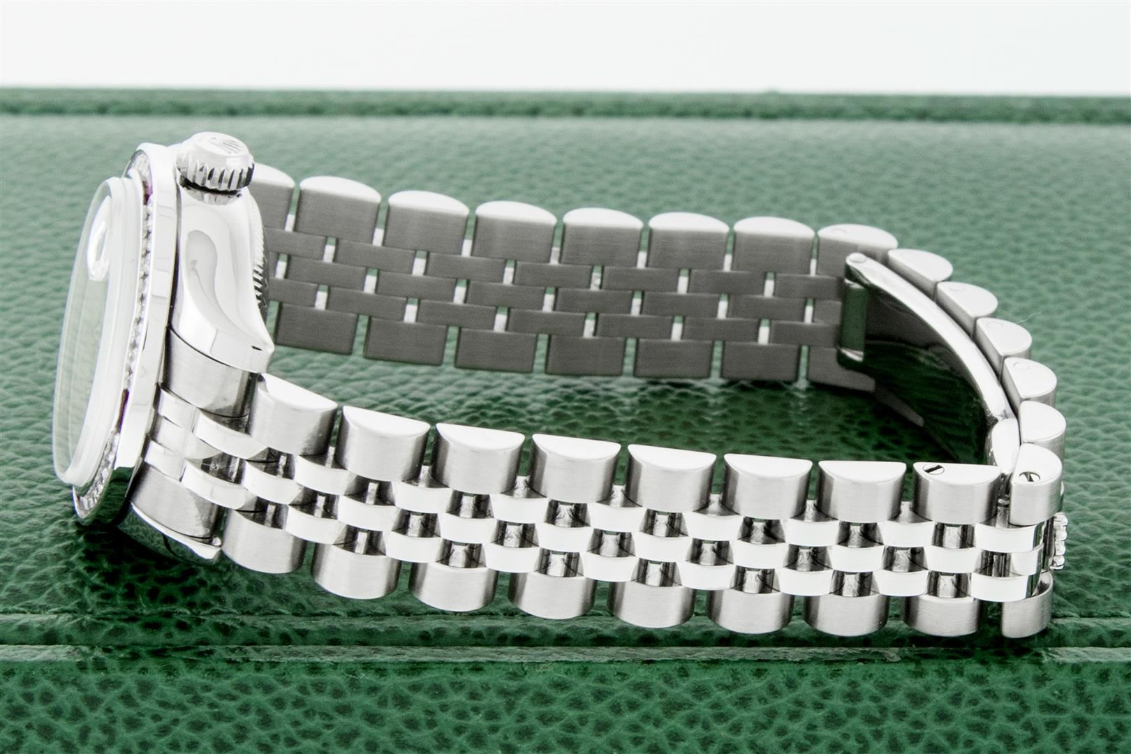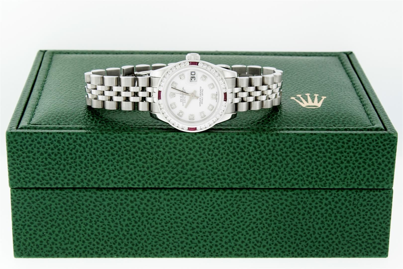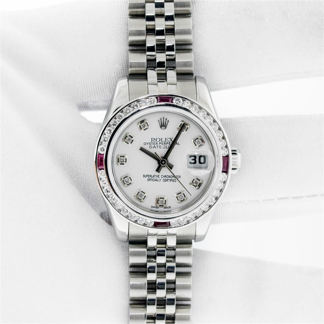 One Ladies Stainless Steel Rolex Datejust Polished Bright with Satin Finish, Serviced & Electronically Tested, Stainless Steel Case: 26mm, Rolex Stainless Steel Crown, Custom Bezel: New 18K White Gold Sapphire Channel Set Diamond Bezel, Diamond + Gem Count: 36 Diamonds + 4 Rubies Total Weight 1.00 Carat, Clarity: SI-VS, Color: G to H. Custom Crystal: New Sapphire With Magnified Date Window. Custom Hands: New Luminescent Hands. Rolex Movement: Automatic Winding Movement. Custom Dial: Refinished To White With Custom Added Diamond Hour Markers. Date Window: 3 O'clock Position Date Display, Model: Datejust. Condition: G-6 Extra Fine. Rolex Bracelet: Stainless Steel Jubilee Band. Bright Polish & Satin Finish. 6.0 Inch Length, Adjustable. Standard Clasp, With Rolex Logo. This Pre Owned Watch Has Been Serviced Time Tested And Is In Excellent Condition It Is Free Of All Scratches And Dents. This Watch Comes With A Rolex Box.