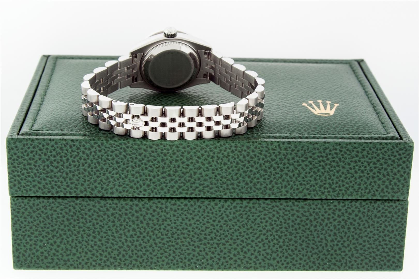 One Ladies Stainless Steel Rolex Datejust Polished Bright with Satin Finish, Serviced & Electronically Tested, Stainless Steel Case: 26mm, Rolex Stainless Steel Crown, Custom Bezel: New 18K White Gold Sapphire Channel Set Diamond Bezel, Diamond + Gem Count: 36 Diamonds + 4 Rubies Total Weight 1.00 Carat, Clarity: SI-VS, Color: G to H. Custom Crystal: New Sapphire With Magnified Date Window. Custom Hands: New Luminescent Hands. Rolex Movement: Automatic Winding Movement. Custom Dial: Refinished To White With Custom Added Diamond Hour Markers. Date Window: 3 O'clock Position Date Display, Model: Datejust. Condition: G-6 Extra Fine. Rolex Bracelet: Stainless Steel Jubilee Band. Bright Polish & Satin Finish. 6.0 Inch Length, Adjustable. Standard Clasp, With Rolex Logo. This Pre Owned Watch Has Been Serviced Time Tested And Is In Excellent Condition It Is Free Of All Scratches And Dents. This Watch Comes With A Rolex Box.