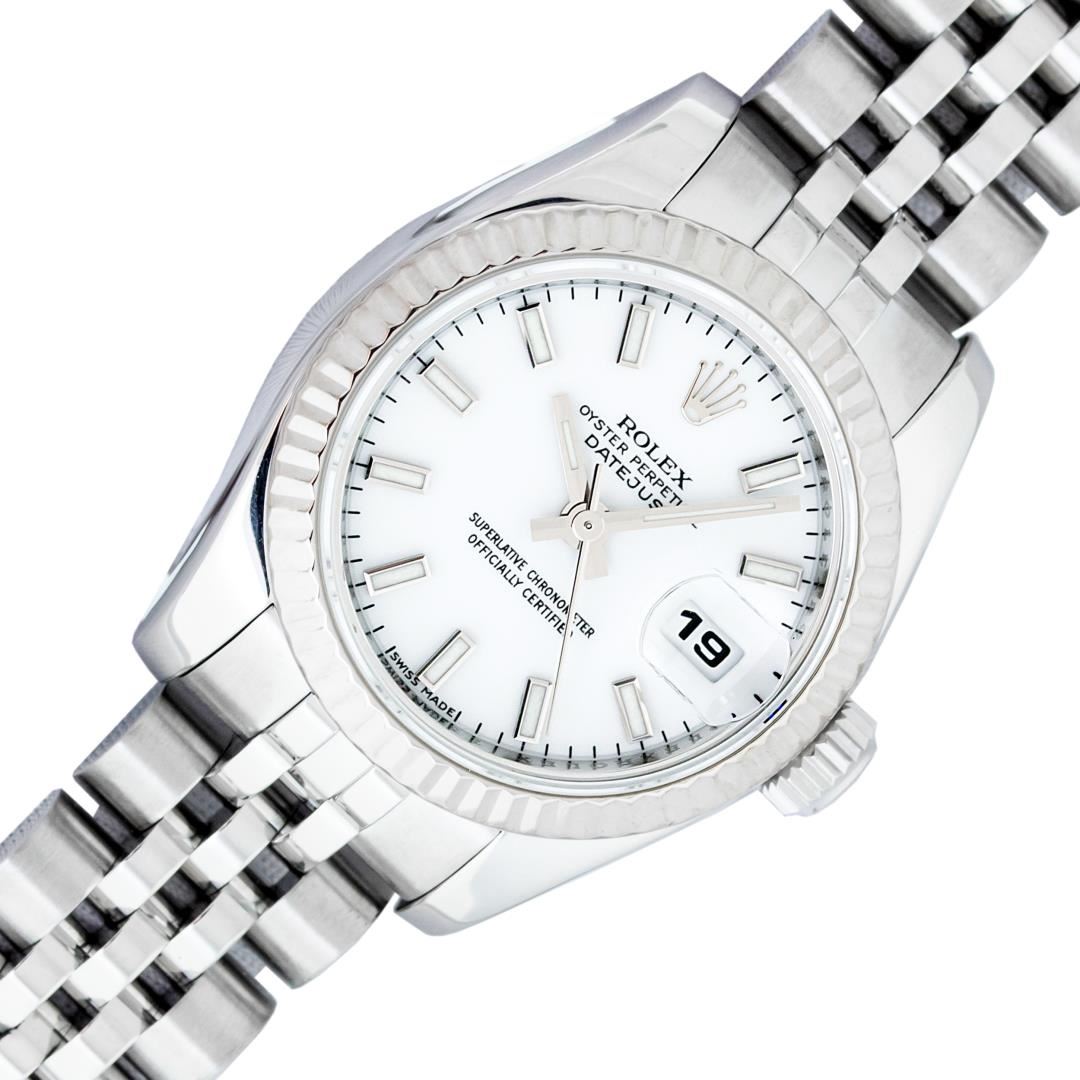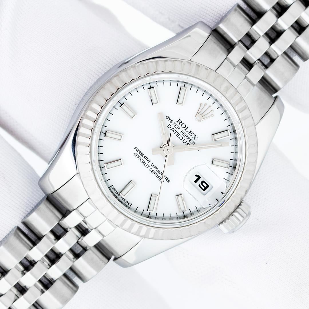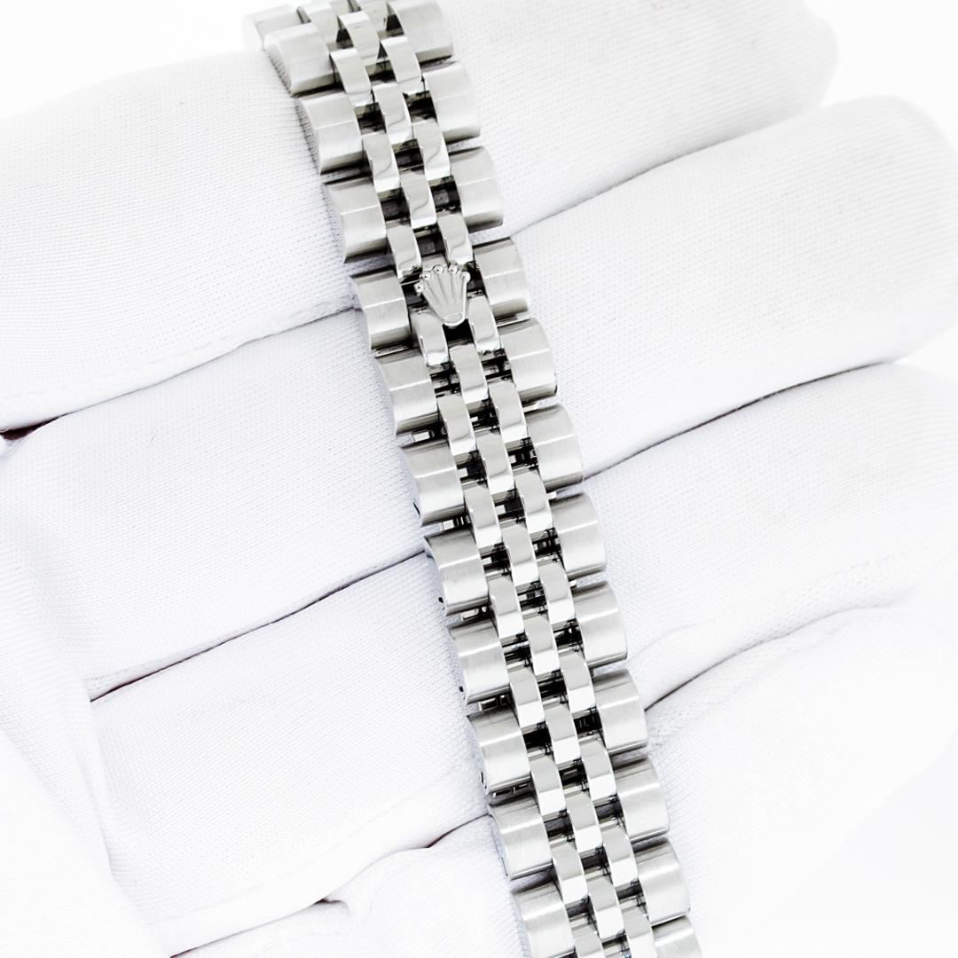 One Ladies Pre Owned Quickset Sapphire Stainless Steel Rolex Datejust Polished Bright with Satin Finish, Serviced & Electronically Tested, Rolex Stainless Steel Case: 26mm, Rolex Stainless Steel Crown, Rolex Bezel: 18K White Gold Fluted Bezel. Crystal: Sapphire With Magnified Date Window. Hands: Luminescent Hands. Rolex Movement: Automatic Winding Movement 2235. Rolex Dial: White Index With Dash Track. Date Window: 3 O'Clock Position Date Display, Model: Sapphire Quickset Datejust. Condition: G-6 Extra Fine. Rolex Bracelet: Stainless Steel Jubilee Band. Bright Polish & Satin Finish. 6.0 Inch Length, Adjustable. Hidden Clap, With Rolex Logo. This Watch Has Been Serviced Time Tested And Is In Excellent Condition It Is Free Of All Scratches And Dents.