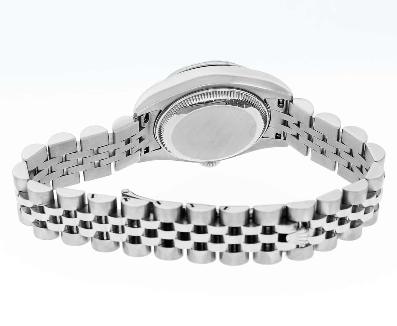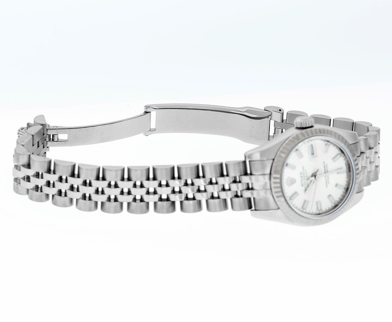 One New Style Ladies Pre Owned Quickset Stainless Steel Rolex Datejust Polished Bright with Satin Finish, Serviced & Electronically Tested, Rolex Stainless Steel Case: 26mm. Rolex Stainless Steel Crown, Rolex Bezel: 18K White Gold Fluted Bezel. Crystal: Sapphire With Magnified Date Window. Hands: Lumi Hands. Rolex Movement: Quickset Automatic Winding Movement 2235. Rolex Dial: White Index With Dash Track. Date Window: 3 O'Clock Position Date Display, Model: Sapphire Quickset Datejust. Condition: G-6 Extra Fine. Rolex Bracelet: Stainless Steel Jubilee Band With Hidden Clasp. Bright Polish & Satin Finish. 6.0 Inch Length, Adjustable. Hidden Clasp, With Rolex Logo. This Watch Has Been Serviced Time Tested And Is In Excellent Condition It Is Free Of All Scratches And Dents.