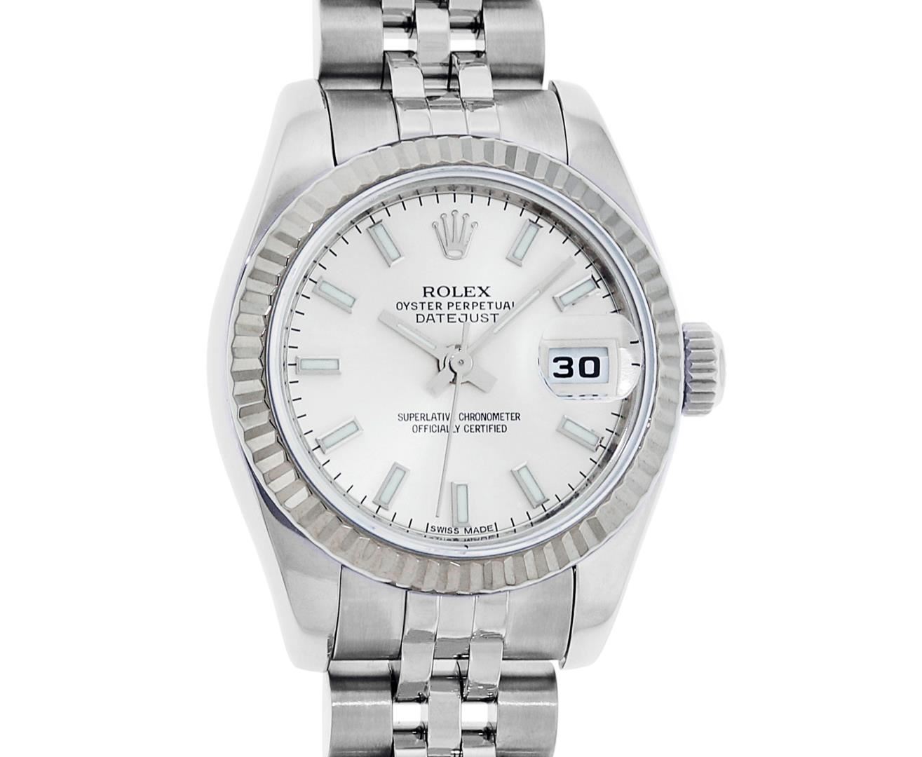 One New Style Ladies Pre Owned Quickset Stainless Steel Rolex Datejust Polished Bright with Satin Finish, Serviced & Electronically Tested, Rolex Stainless Steel Case: 26mm. Rolex Stainless Steel Crown, Rolex Bezel: 18K White Gold Fluted Bezel. Crystal: Sapphire With Magnified Date Window. Hands: Lumi Hands. Rolex Movement: Quickset Automatic Winding Movement 2235. Rolex Dial: White Index With Dash Track. Date Window: 3 O'Clock Position Date Display, Model: Sapphire Quickset Datejust. Condition: G-6 Extra Fine. Rolex Bracelet: Stainless Steel Jubilee Band With Hidden Clasp. Bright Polish & Satin Finish. 6.0 Inch Length, Adjustable. Hidden Clasp, With Rolex Logo. This Watch Has Been Serviced Time Tested And Is In Excellent Condition It Is Free Of All Scratches And Dents.