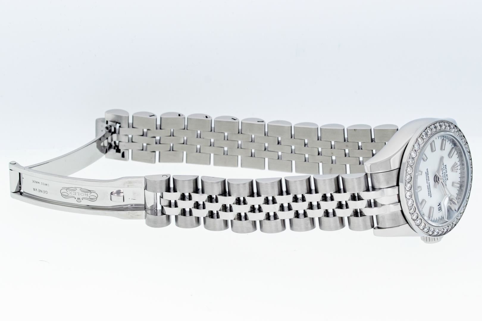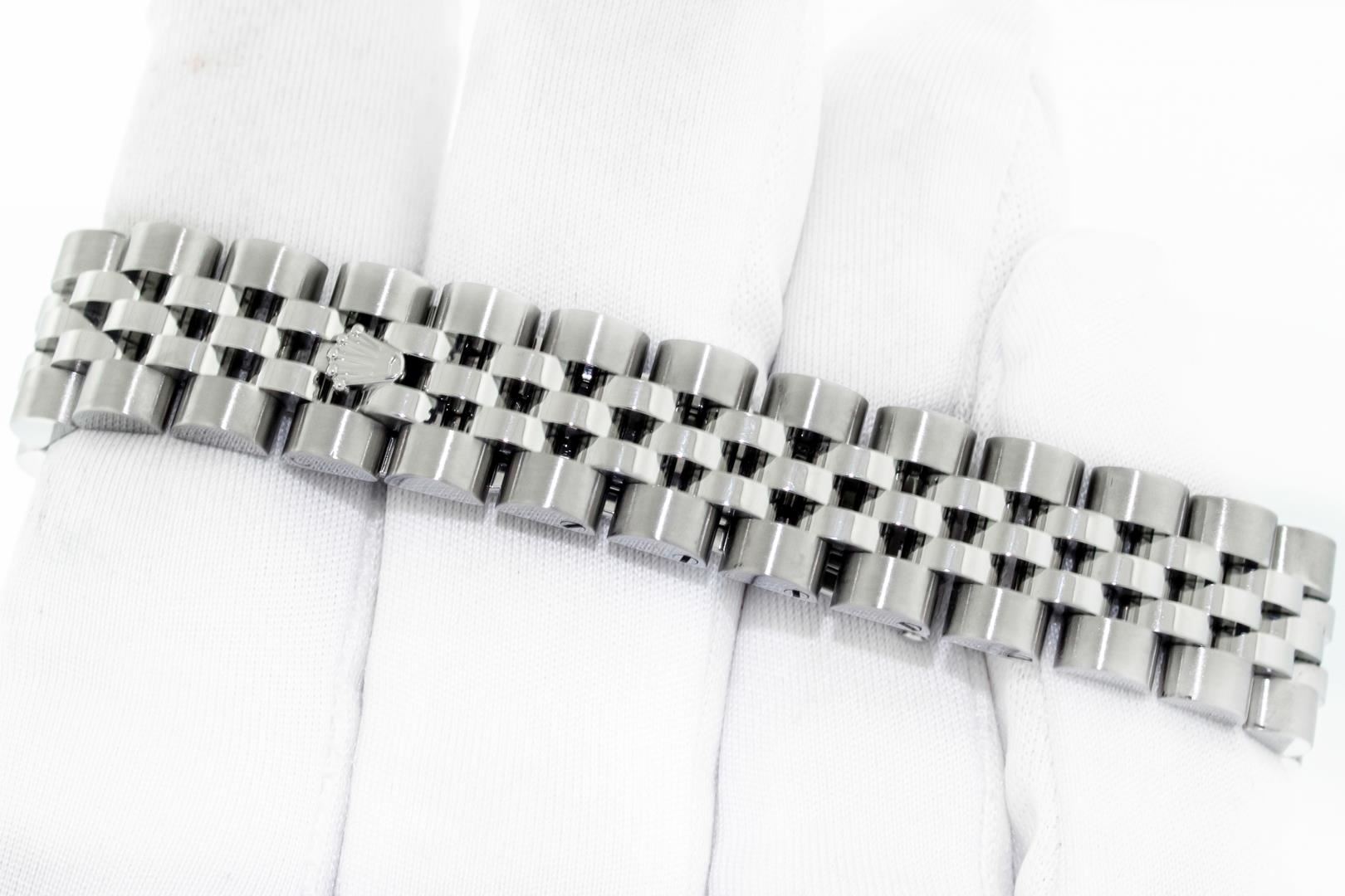 One Ladies Pre Owned Sapphire Quickset Stainless Steel Rolex Datejust Polished Bright with Satin Finish, Serviced & Electronically Tested, Rolex Stainless Steel Case: 26mm, Rolex Stainless Steel Crown, Custom Bezel: New Stainless Steel Beadset Diamond Bezel, Diamond Count: 40 Diamonds On Bezel. Crystal: Sapphire With Magnified Date Window. Hands: Luminescent Hands. Rolex Movement: Automatic Winding Movement 2235. Rolex Dial: White Index With Dash Track. Date Window: 3 O'Clock Position Date Display, Model: Quickset Datejust. Condition: G-6 Extra Fine. Rolex Bracelet: Stainless Steel Jubilee Band. Bright Polish & Satin Finish. 6.0 Inch Length, Adjustable. Hidden Clap, With Rolex Logo. This Watch Has Been Serviced Time Tested And Is In Excellent Condition It Is Free Of All Scratches And Dents.