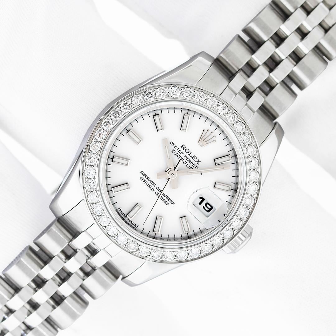 One Ladies Pre Owned Sapphire Quickset Stainless Steel Rolex Datejust Polished Bright with Satin Finish, Serviced & Electronically Tested, Rolex Stainless Steel Case: 26mm, Rolex Stainless Steel Crown, Custom Bezel: New Stainless Steel Beadset Diamond Bezel, Diamond Count: 40 Diamonds On Bezel. Crystal: Sapphire With Magnified Date Window. Hands: Luminescent Hands. Rolex Movement: Automatic Winding Movement 2235. Rolex Dial: White Index With Dash Track. Date Window: 3 O'Clock Position Date Display, Model: Quickset Datejust. Condition: G-6 Extra Fine. Rolex Bracelet: Stainless Steel Jubilee Band. Bright Polish & Satin Finish. 6.0 Inch Length, Adjustable. Hidden Clap, With Rolex Logo. This Watch Has Been Serviced Time Tested And Is In Excellent Condition It Is Free Of All Scratches And Dents.