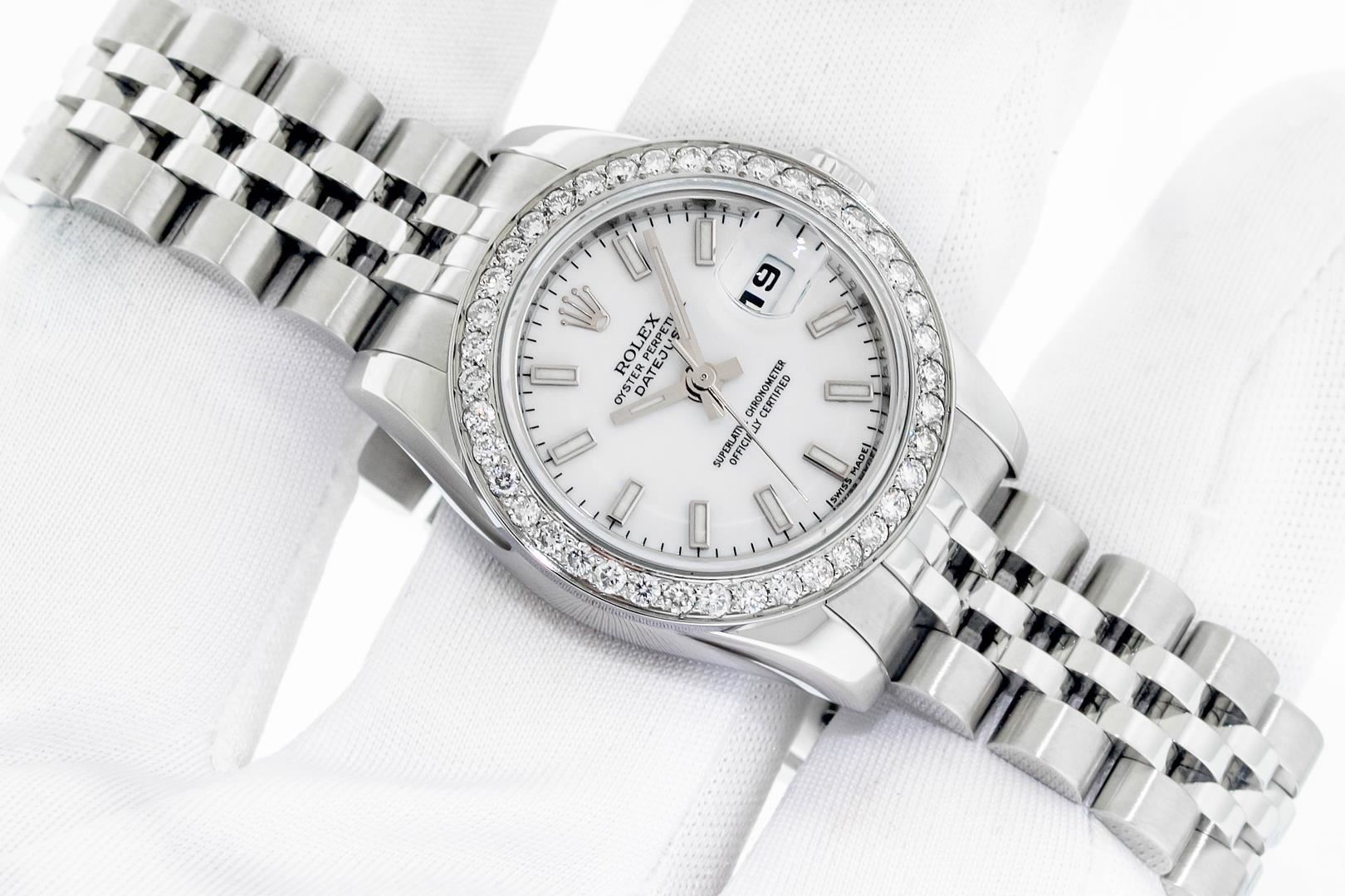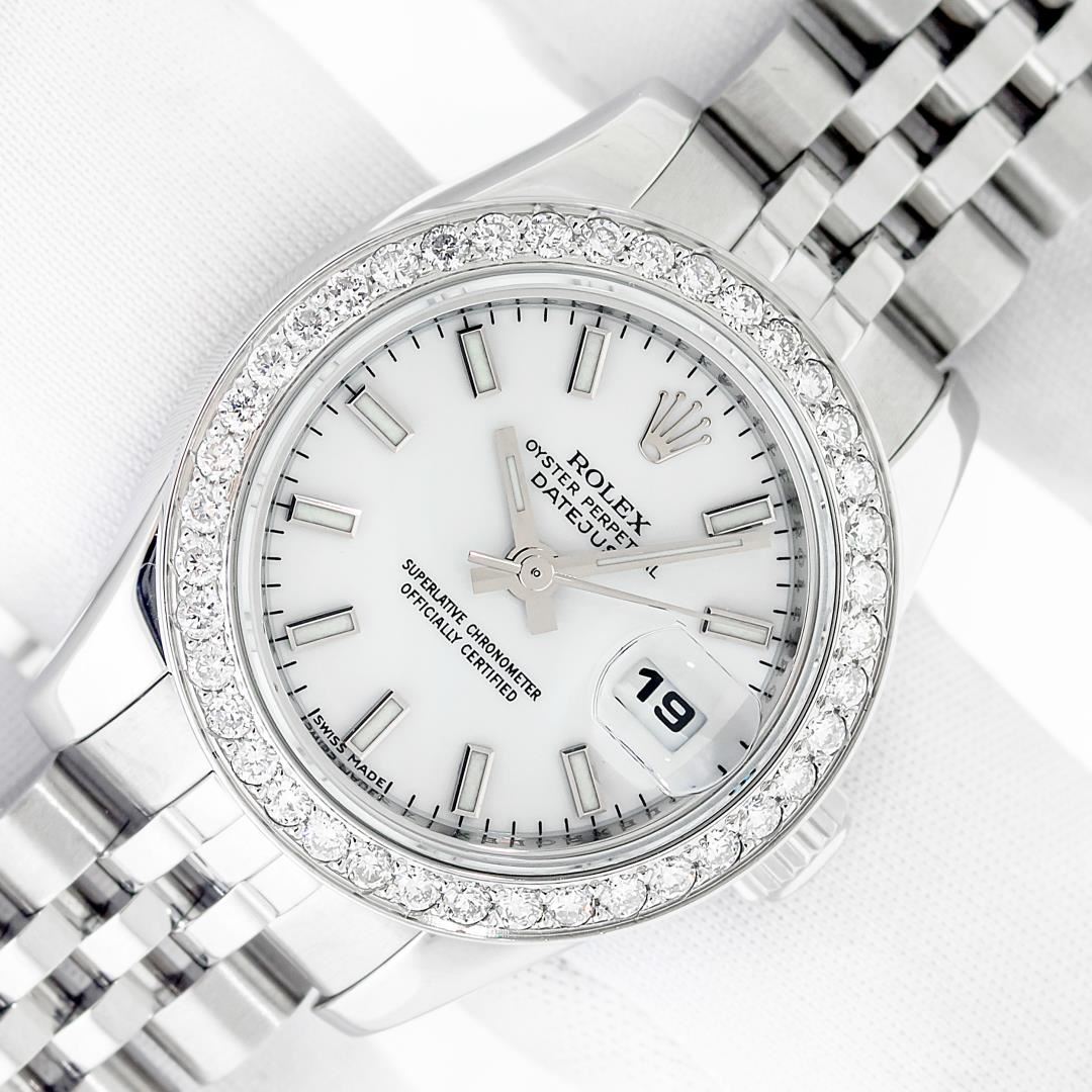 One Ladies Pre Owned Sapphire Quickset Stainless Steel Rolex Datejust Polished Bright with Satin Finish, Serviced & Electronically Tested, Rolex Stainless Steel Case: 26mm, Rolex Stainless Steel Crown, Custom Bezel: New Stainless Steel Beadset Diamond Bezel, Diamond Count: 40 Diamonds On Bezel. Crystal: Sapphire With Magnified Date Window. Hands: Luminescent Hands. Rolex Movement: Automatic Winding Movement 2235. Rolex Dial: White Index With Dash Track. Date Window: 3 O'Clock Position Date Display, Model: Quickset Datejust. Condition: G-6 Extra Fine. Rolex Bracelet: Stainless Steel Jubilee Band. Bright Polish & Satin Finish. 6.0 Inch Length, Adjustable. Hidden Clap, With Rolex Logo. This Watch Has Been Serviced Time Tested And Is In Excellent Condition It Is Free Of All Scratches And Dents.