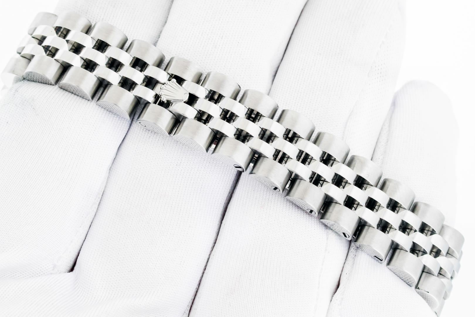 One Ladies Pre Owned Quickset Sapphire Stainless Steel Rolex Datejust Polished Bright with Satin Finish, Serviced & Electronically Tested, Rolex Stainless Steel Case: 26mm, Rolex Stainless Steel Crown, Custom Bezel: New 18K White Gold Diamond & Emerald Bezel, Stone Count: 28 Diamonds + 4 Emeralds. Crystal: Sapphire With Magnified Date Window. Hands: Luminescent Hands. Rolex Movement: Automatic Winding Movement 2235. Rolex Dial: White Index With Dash Track. Date Window: 3 O'Clock Position Date Display, Model: Quickset Datejust. Condition: G-6 Extra Fine. Rolex Bracelet: Stainless Steel Jubilee Band. Bright Polish & Satin Finish. 6.0 Inch Length, Adjustable. Hidden Clap, With Rolex Logo. This Watch Has Been Serviced Time Tested And Is In Excellent Condition It Is Free Of All Scratches And Dents.