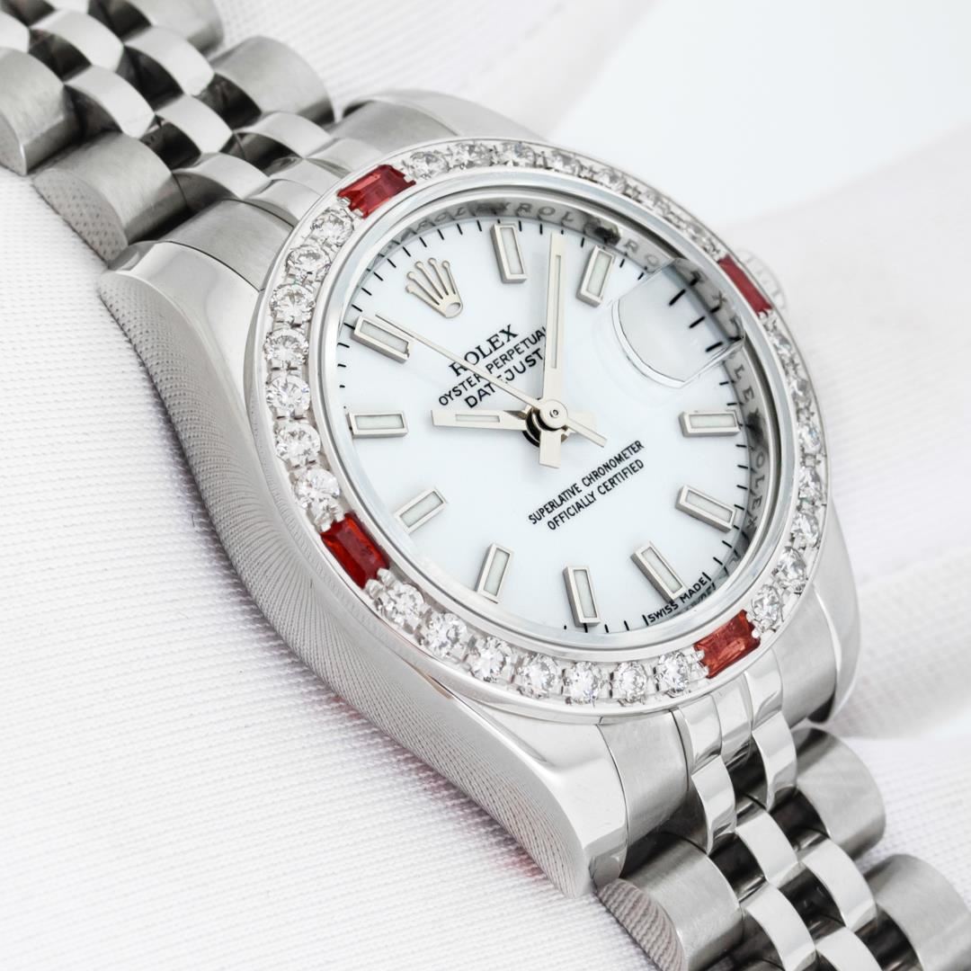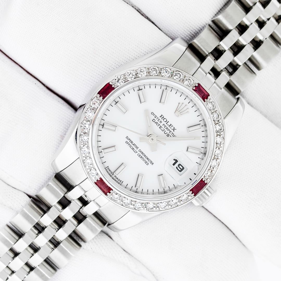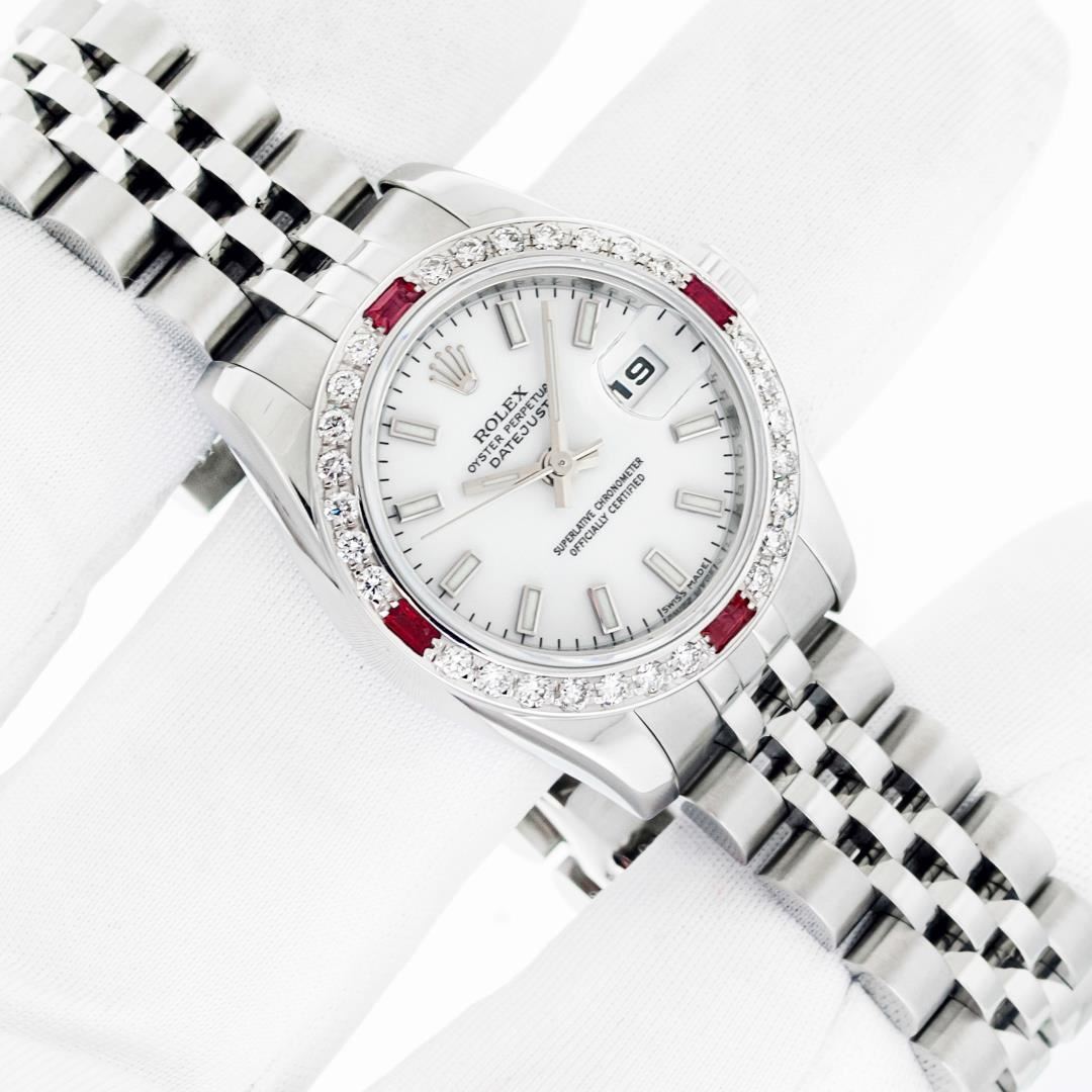 One Ladies Pre Owned Quickset Sapphire Stainless Steel Rolex Datejust Polished Bright with Satin Finish, Serviced & Electronically Tested, Rolex Stainless Steel Case: 26mm, Rolex Stainless Steel Crown, Custom Bezel: New 18K White Gold Diamond & Ruby Bezel, Stone Count: 28 Diamonds + 4 Rubies. Crystal: Sapphire With Magnified Date Window. Hands: Luminescent Hands. Rolex Movement: Automatic Winding Movement 2235. Rolex Dial: White Index With Dash Track. Date Window: 3 O'Clock Position Date Display, Model: Quickset Datejust. Condition: G-6 Extra Fine. Rolex Bracelet: Stainless Steel Jubilee Band. Bright Polish & Satin Finish. 6.0 Inch Length, Adjustable. Hidden Clap, With Rolex Logo. This Watch Has Been Serviced Time Tested And Is In Excellent Condition It Is Free Of All Scratches And Dents.