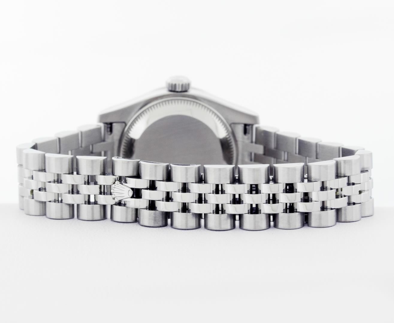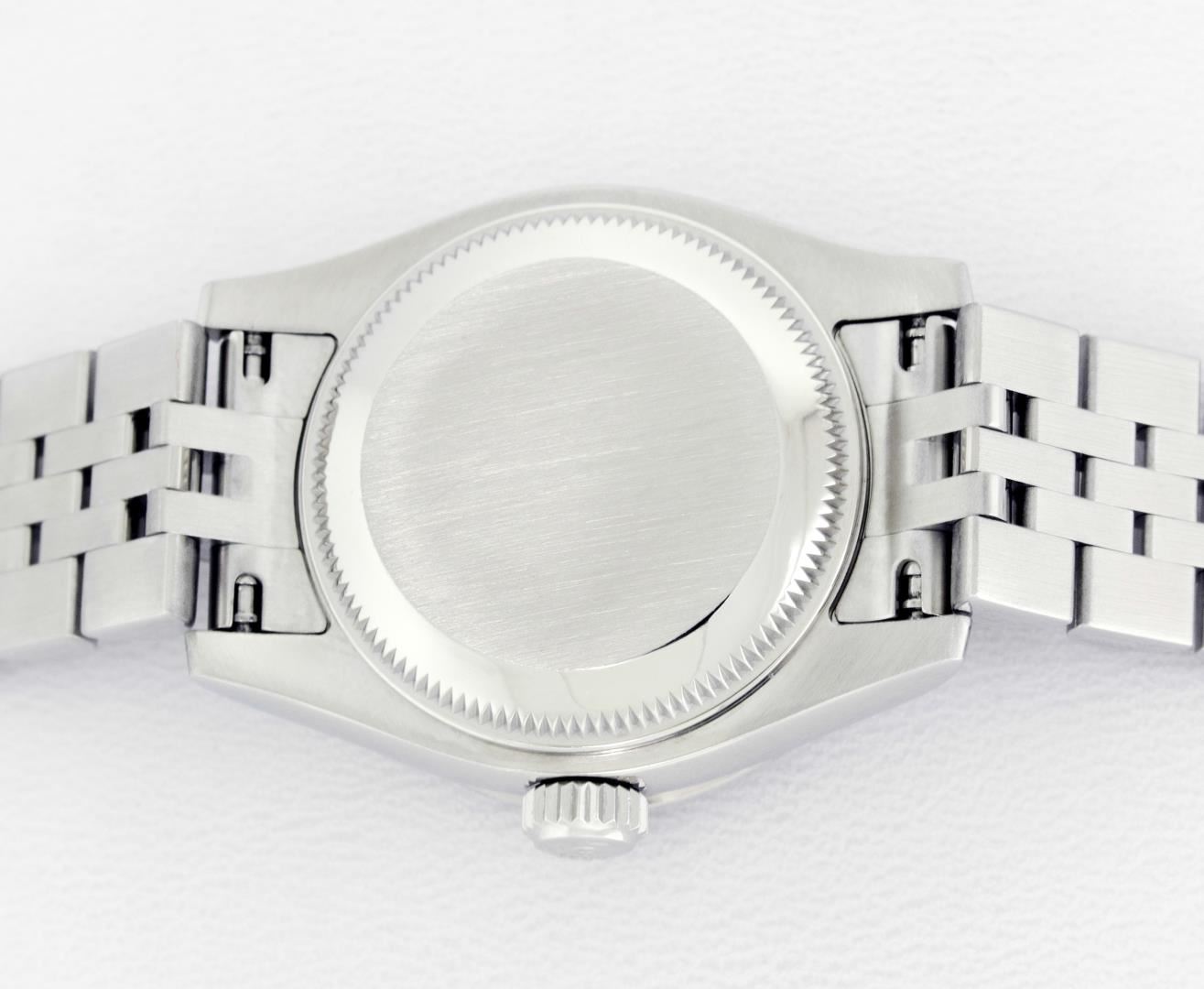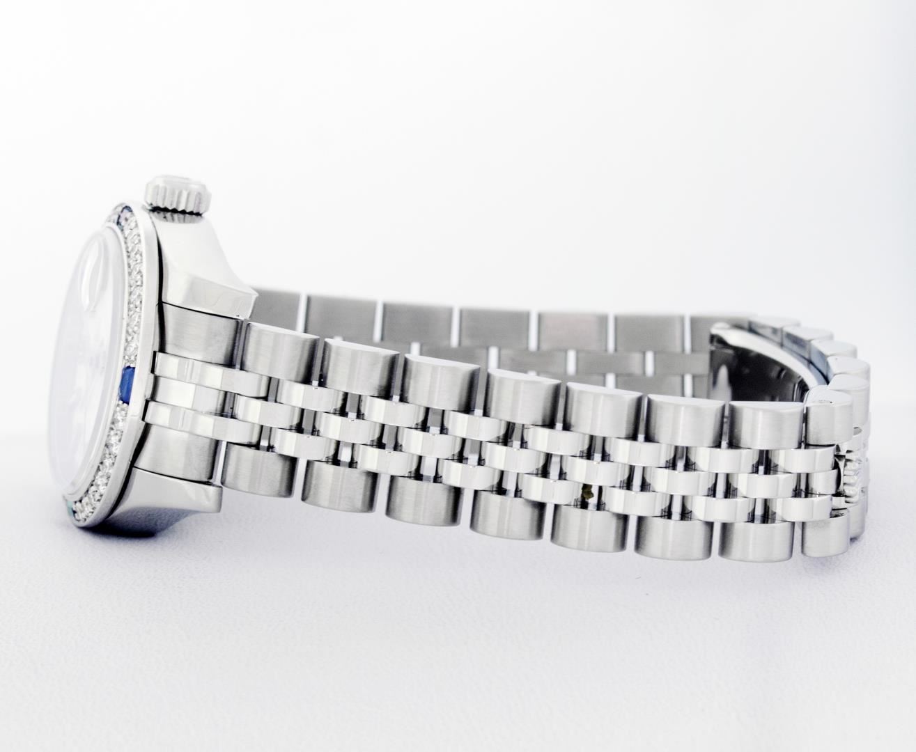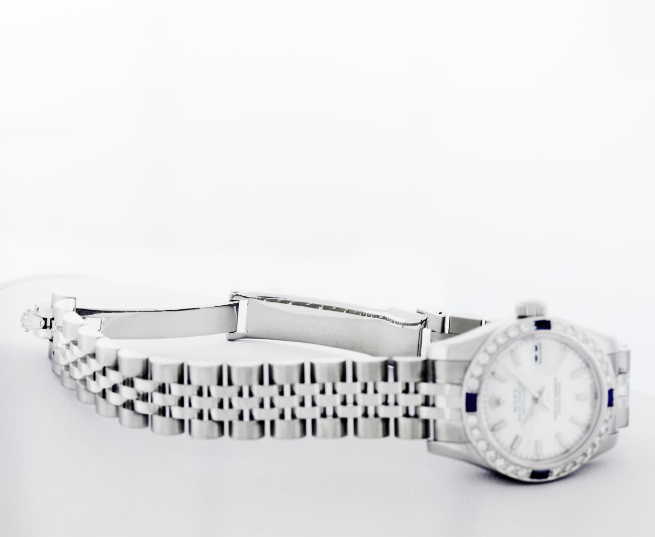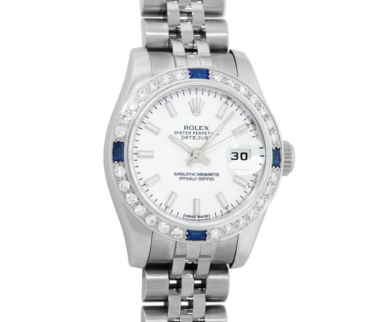One New Style Ladies Rolex Pre Owned Quickset Stainless Steel Datejust Polished Bright with Satin Finish, Serviced & Electronically Tested, Rolex Stainless Steel Case: 26mm. Rolex Stainless Steel Crown, Custom Bezel: New 18K White Gold Beadset And Sapphire Bezel, Stone Count: 28 Diamonds + 4 Sapphires, Diamond Color: G To H, Clarity: SI-VS. Crystal: Sapphire With Magnified Date Window. Hands: Lumi Hands. Rolex Movement: Quickset Automatic Winding Movement 2235. Rolex Dial: White Index With Dash Track. Date Window: 3 O'Clock Position Date Display, Model: Sapphire Quickset Datejust. Condition: G-6 Extra Fine. Rolex Bracelet: Stainless Steel Jubilee Band With Hidden Clasp. Bright Polish & Satin Finish. 6.0 Inch Length, Adjustable. Hidden Clasp, With Rolex Logo. This Watch Has Been Serviced Time Tested And Is In Excellent Condition It Is Free Of All Scratches And Dents.