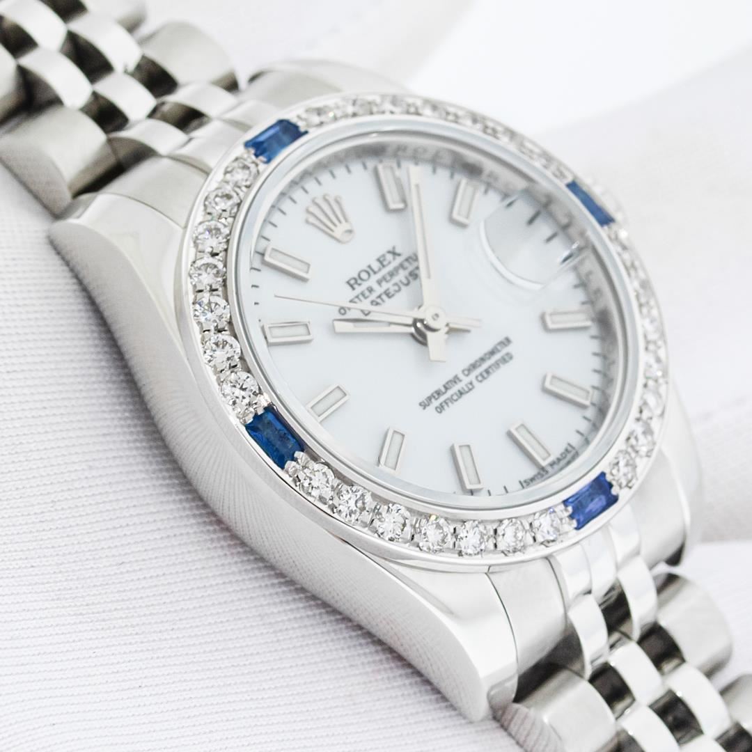 One Ladies Pre Owned Quickset Sapphire Stainless Steel Rolex Datejust Polished Bright with Satin Finish, Serviced & Electronically Tested, Rolex Stainless Steel Case: 26mm, Rolex Stainless Steel Crown, Custom Bezel: New 18K White Gold Diamond & Sapphire Bezel, Stone Count: 28 Diamonds + 4 Sapphires. Crystal: Sapphire With Magnified Date Window. Hands: Luminescent Hands. Rolex Movement: Automatic Winding Movement 2235. Rolex Dial: White Index With Dash Track. Date Window: 3 O'Clock Position Date Display, Model: Quickset Datejust. Condition: G-6 Extra Fine. Rolex Bracelet: Stainless Steel Jubilee Band. Bright Polish & Satin Finish. 6.0 Inch Length, Adjustable. Hidden Clap, With Rolex Logo. This Watch Has Been Serviced Time Tested And Is In Excellent Condition It Is Free Of All Scratches And Dents.