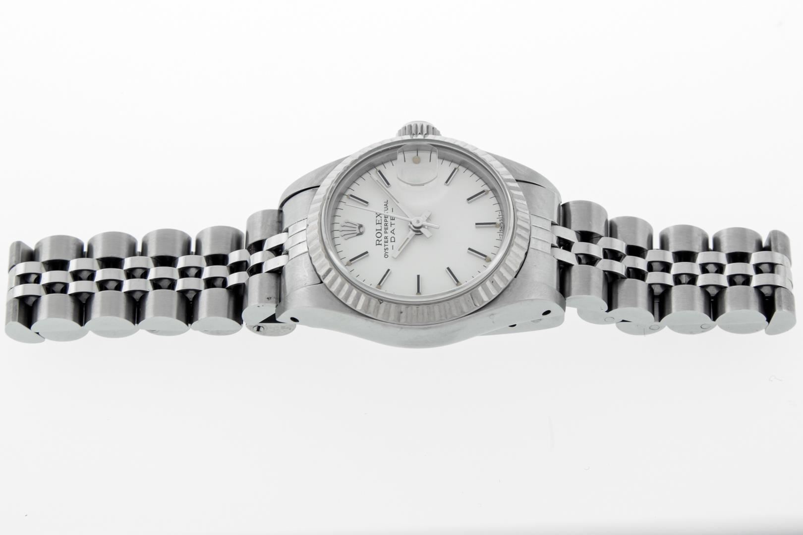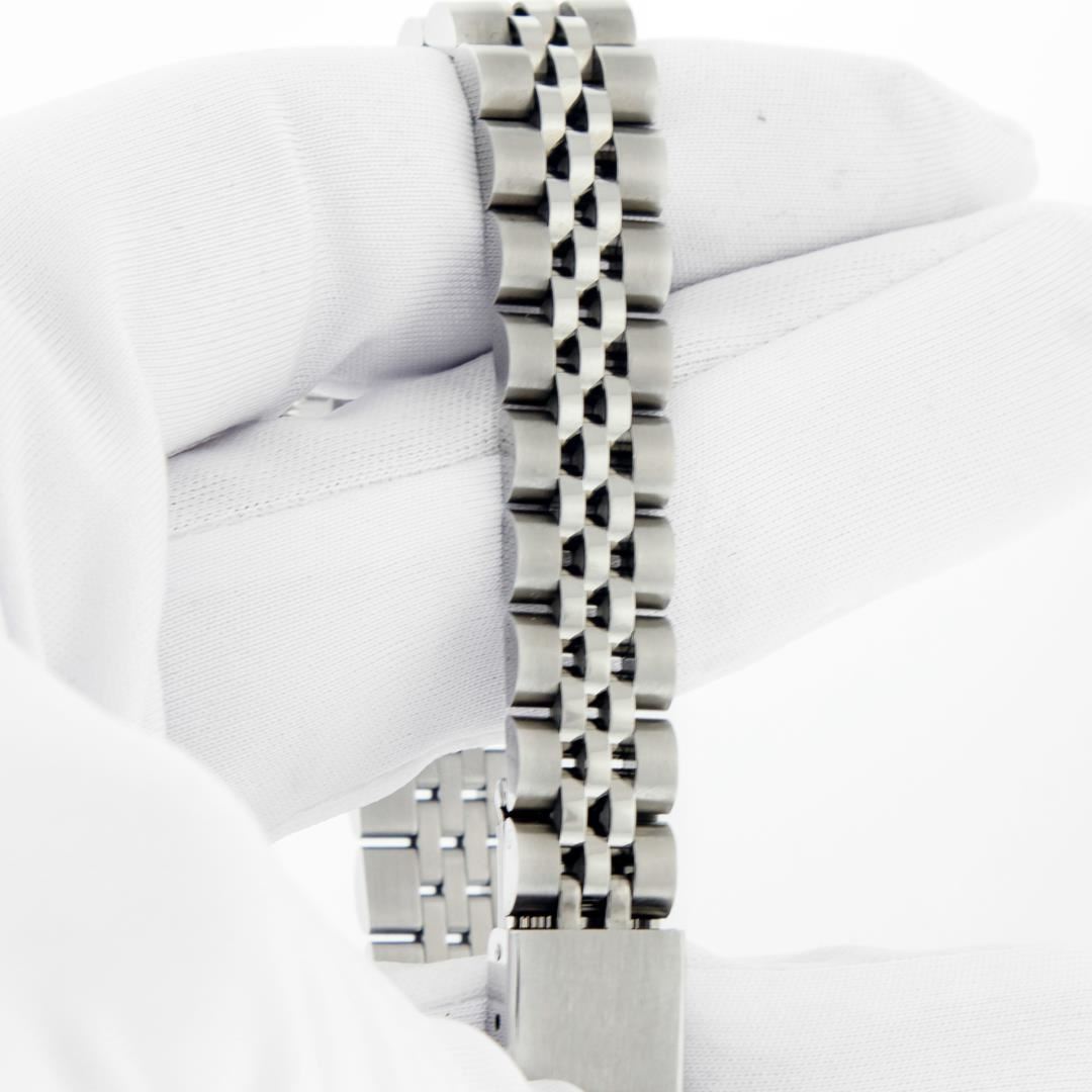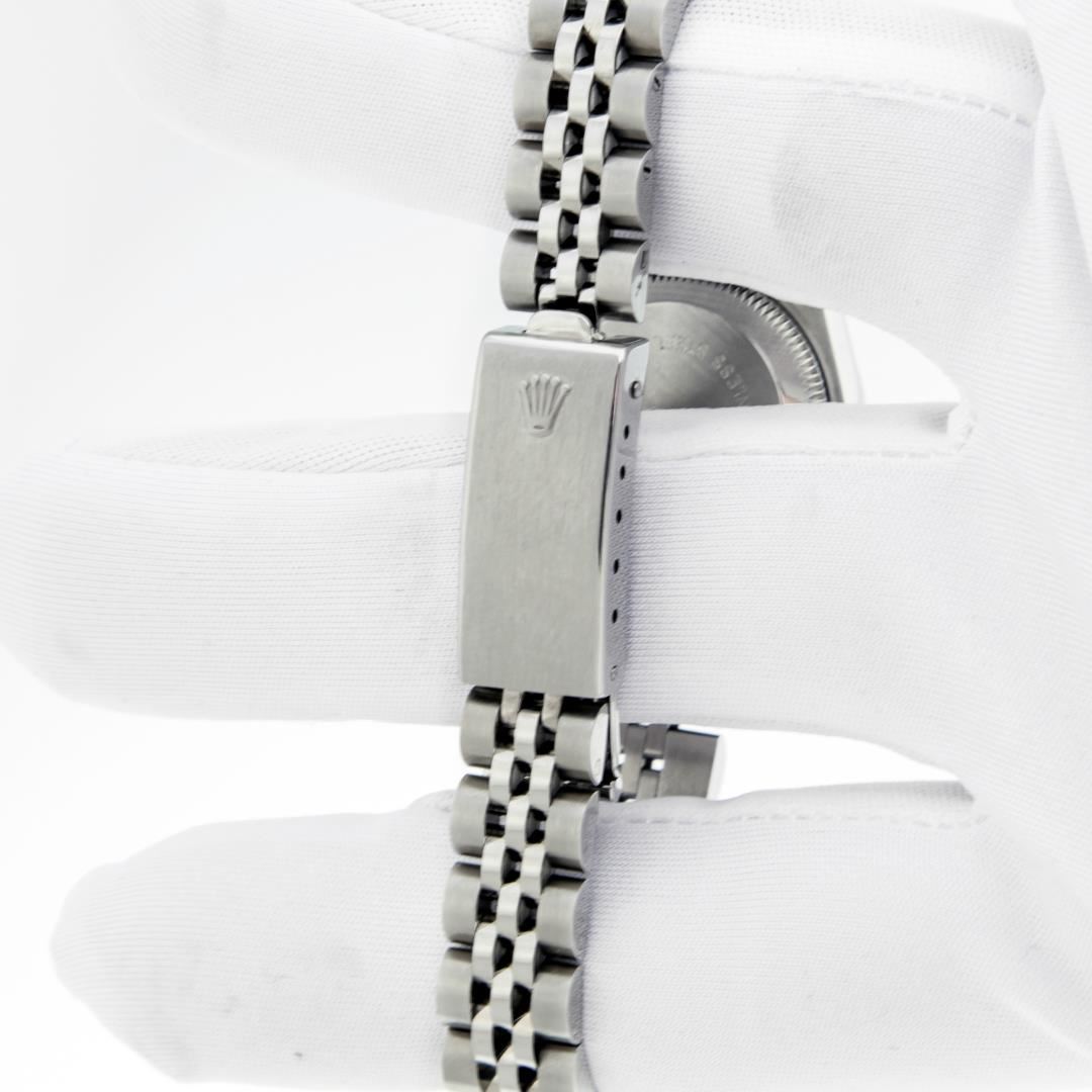 One Ladies Pre Owned Stainless Steel Rolex Date Polished Bright with Satin Finish, Serviced & Electronically Tested, Rolex Stainless Steel Case: 26mm, Rolex Stainless Steel Crown, Rolex Bezel: 14K White Gold Fluted Bezel, Custom Crystal: New With Magnifying Date Window. Hands: Luminescent Hands. Rolex Movement: Automatic Winding Movement. Rolex Dial: White Factory Dial With Index Hour Markers And Lumi Dots. Date Window: 3 O'Clock Position Date Display, Model: Datejust. Condition: G-6 Extra Fine. Rolex Bracelet: Stainless Steel Jubilee Band. Bright Polish & Satin Finish. 6.0 Inch Length, Adjustable. Standard Clasp, With Rolex Logo. This Pre Owned Watch Has Been Serviced Time Tested And Is In Excellent Condition It Is Free Of All Scratches And Dents.
