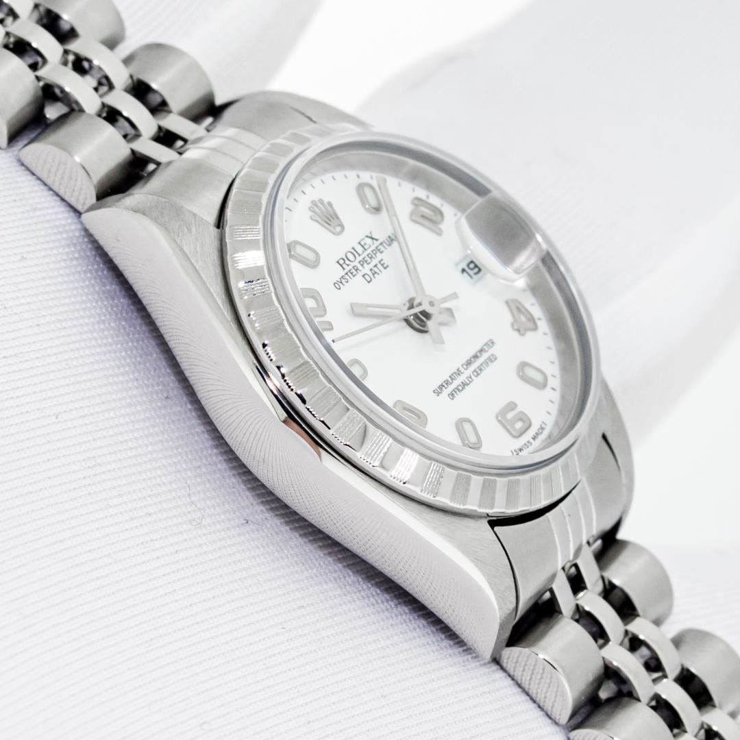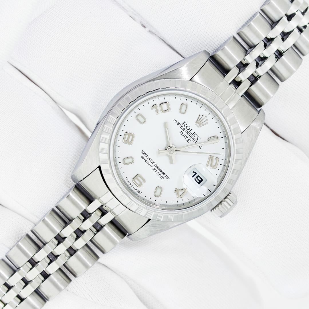 One Quickset Pre Owned Ladies Stainless Steel Rolex Date Polished Bright with Satin Finish, Serviced & Electronically Tested, Rolex Stainless Steel Case: 26mm, Rolex Stainless Steel Crown, Rolex Bezel: Stainless Steel Engine Turn Bezel, Crystal: Sapphire With Date Window. Hands: Luminescent Hands. Rolex Movement: Automatic Winding Movement 2235. Rolex Dial: White Arabic With Dash Track, Date Window: 3 O'Clock Position Date Display, Model: Quickset 2235 Datejust. Condition: G-6 Extra Fine. Rolex Bracelet: Stainless Steel Jubilee Band. Bright Polish & Satin Finish. 6.0 Inch Length, Adjustable. Standard Clasp, With Rolex Logo. This Watch Has Been Serviced Time Tested And Is In Excellent Condition It Is Free Of All Scratches And Dents.