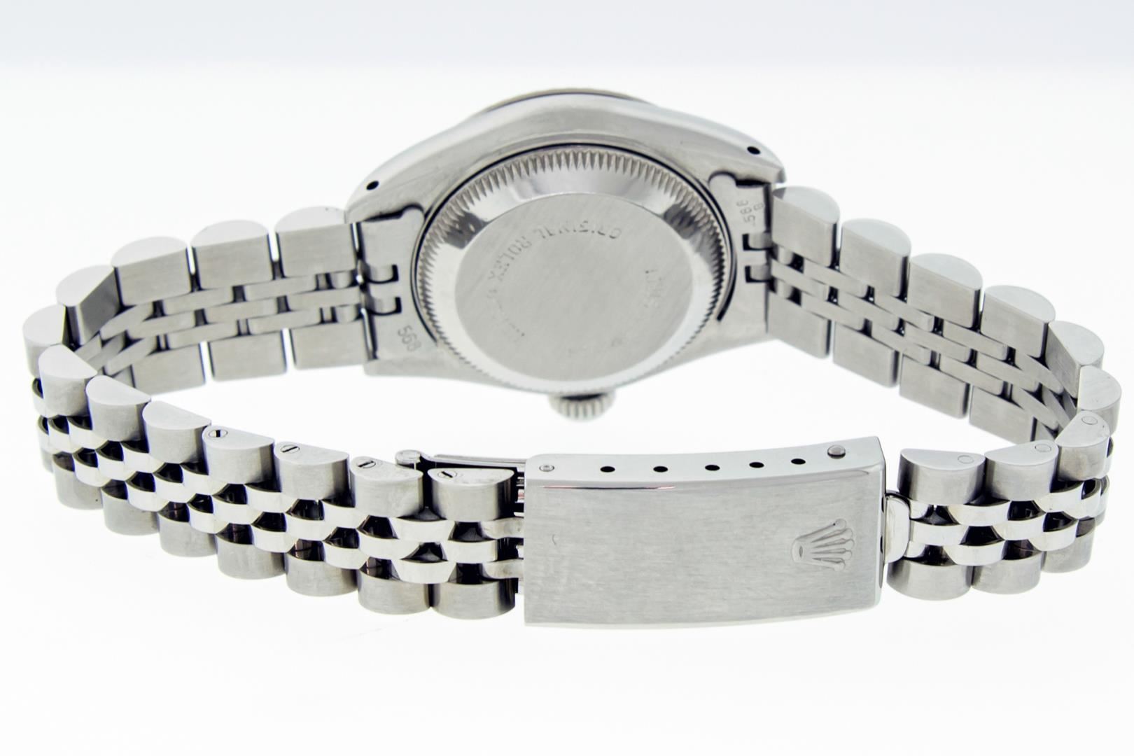 One Ladies Pre Owned Stainless Steel Rolex Date Polished Bright with Satin Finish, Serviced & Electronically Tested, Rolex Stainless Steel Case: 26mm, Rolex Stainless Steel Crown, Rolex Bezel: 14K White Gold Fluted Bezel, Custom Crystal: New With Magnifying Date Window. Hands: Luminescent Hands. Rolex Movement: Automatic Winding Movement. Rolex Dial: White Factory Dial With Index Hour Markers And Lumi Dots. Date Window: 3 O'Clock Position Date Display, Model: Datejust. Condition: G-6 Extra Fine. Rolex Bracelet: Stainless Steel Jubilee Band. Bright Polish & Satin Finish. 6.0 Inch Length, Adjustable. Standard Clasp, With Rolex Logo. This Pre Owned Watch Has Been Serviced Time Tested And Is In Excellent Condition It Is Free Of All Scratches And Dents.