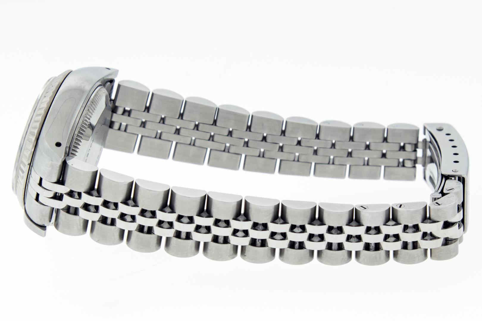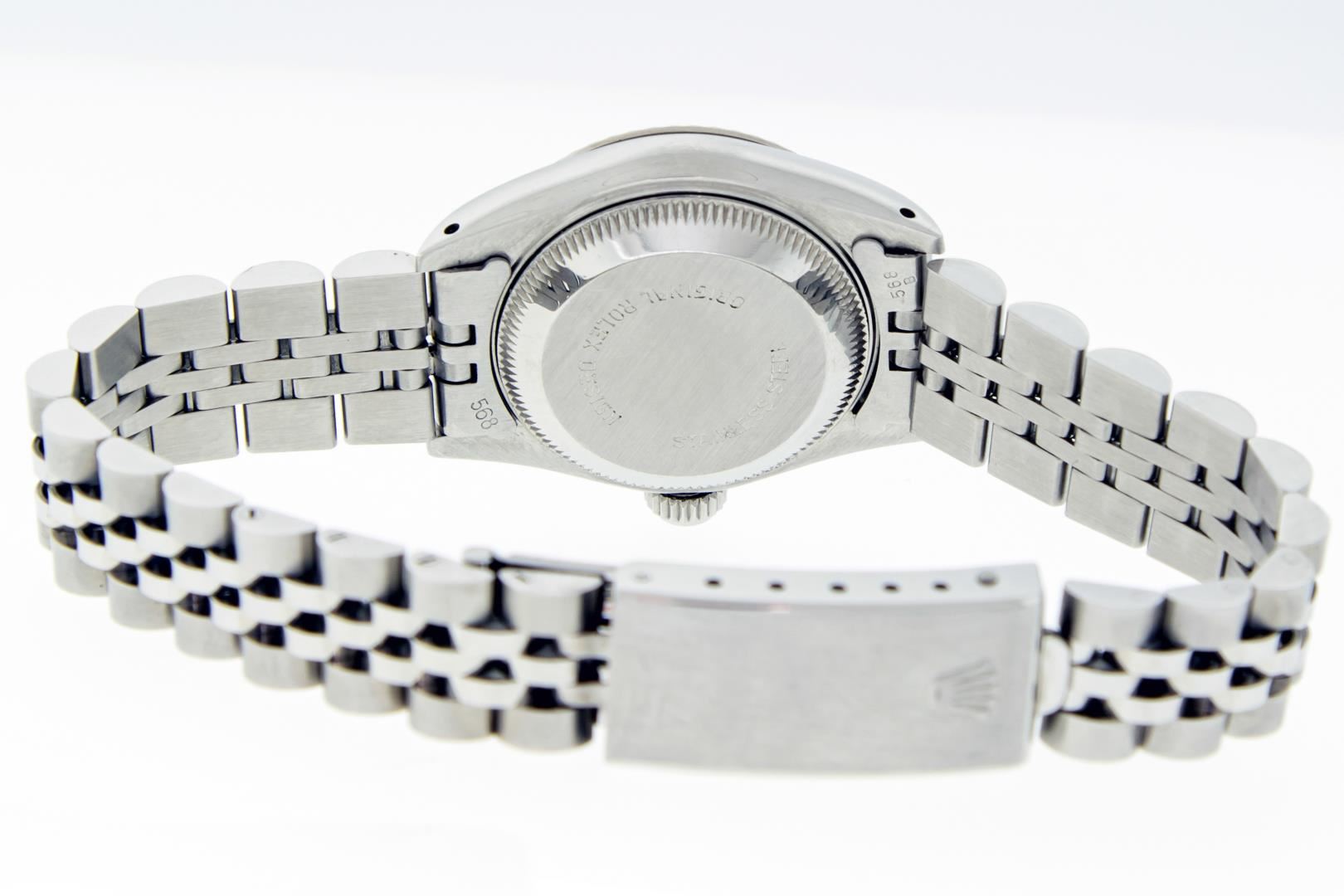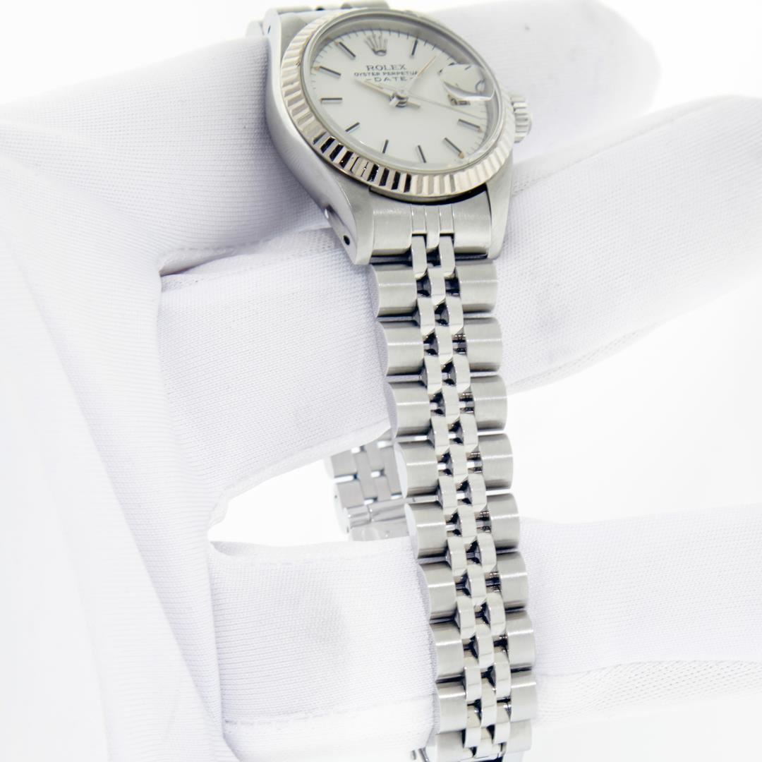 One Ladies Pre Owned Stainless Steel Rolex Date Polished Bright with Satin Finish, Serviced & Electronically Tested, Rolex Stainless Steel Case: 26mm, Rolex Stainless Steel Crown, Rolex Bezel: 14K White Gold Fluted Bezel, Custom Crystal: New With Magnifying Date Window. Hands: Luminescent Hands. Rolex Movement: Automatic Winding Movement. Rolex Dial: White Factory Dial With Index Hour Markers And Lumi Dots. Date Window: 3 O'Clock Position Date Display, Model: Datejust. Condition: G-6 Extra Fine. Rolex Bracelet: Stainless Steel Jubilee Band. Bright Polish & Satin Finish. 6.0 Inch Length, Adjustable. Standard Clasp, With Rolex Logo. This Pre Owned Watch Has Been Serviced Time Tested And Is In Excellent Condition It Is Free Of All Scratches And Dents.