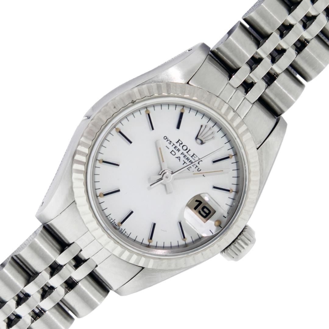 One Ladies Pre Owned Stainless Steel Rolex Date Polished Bright with Satin Finish, Serviced & Electronically Tested, Rolex Stainless Steel Case: 26mm, Rolex Stainless Steel Crown, Rolex Bezel: 14K White Gold Fluted Bezel, Custom Crystal: New With Magnifying Date Window. Hands: Luminescent Hands. Rolex Movement: Automatic Winding Movement. Rolex Dial: White Factory Dial With Index Hour Markers And Lumi Dots. Date Window: 3 O'Clock Position Date Display, Model: Datejust. Condition: G-6 Extra Fine. Rolex Bracelet: Stainless Steel Jubilee Band. Bright Polish & Satin Finish. 6.0 Inch Length, Adjustable. Standard Clasp, With Rolex Logo. This Pre Owned Watch Has Been Serviced Time Tested And Is In Excellent Condition It Is Free Of All Scratches And Dents.