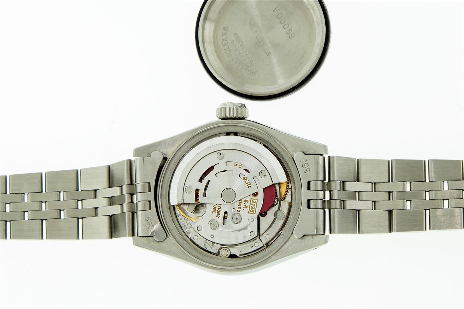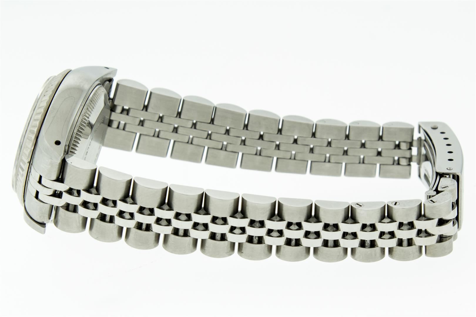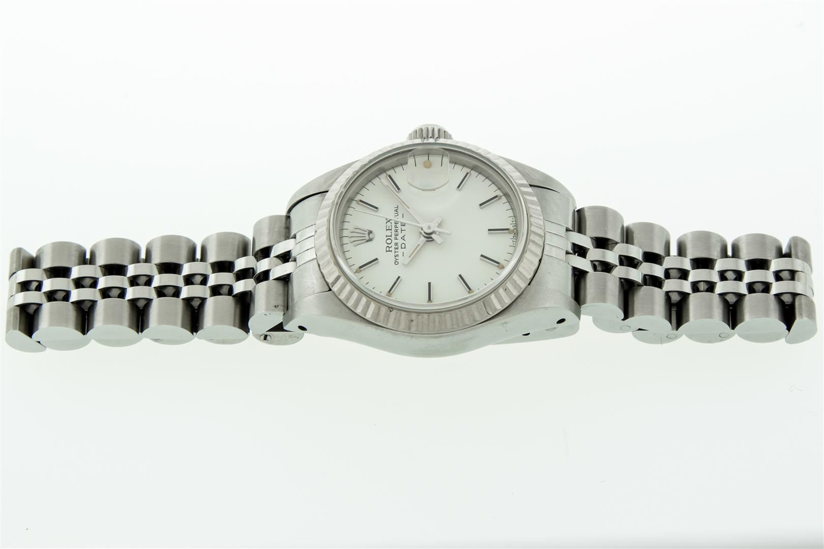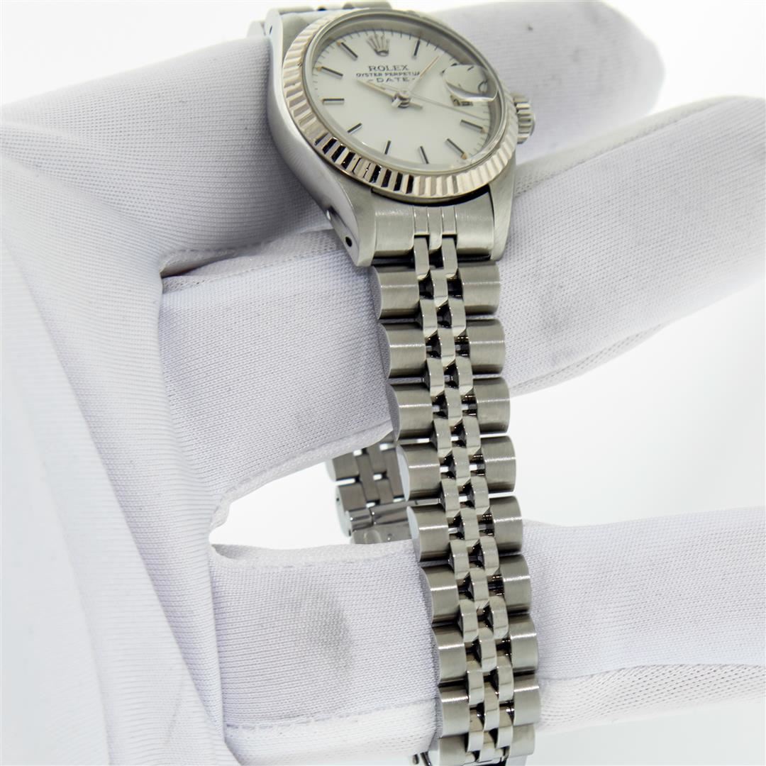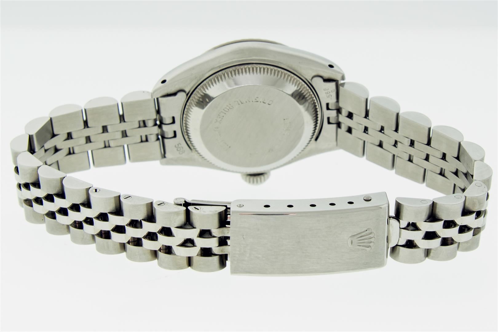 One Ladies Pre Owned Stainless Steel Rolex Datejust Polished Bright with Satin Finish, Serviced & Electronically Tested, Rolex Stainless Steel Case: 26mm, Rolex Stainless Steel Crown, Rolex Bezel: White Gold Fluted Bezel, Custom Crystal: New With Magnifying Date Window. Rolex Hands: Luminescent Hands. Rolex Movement: Automatic Winding Movement. Rolex Dial: White Dial With Index Hour Markers And Lumi Dots. Date Window: 3 O'Clock Position Date Display, Model: Datejust. Condition: G-6 Extra Fine. Rolex Bracelet: Stainless Steel Jubilee Band. Bright Polish & Satin Finish. 6.0 Inch Length, Adjustable. Standard Clasp, With Rolex Logo. This Watch Has Been Serviced Time Tested And Is In Excellent Condition It Is Free Of All Scratches And Dents.
