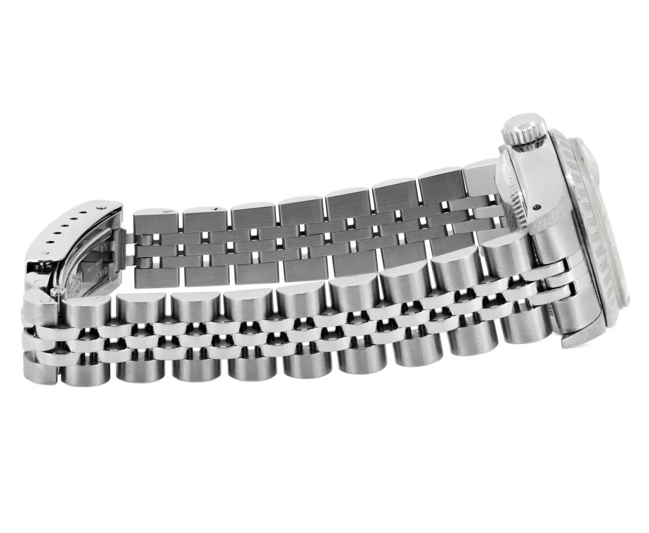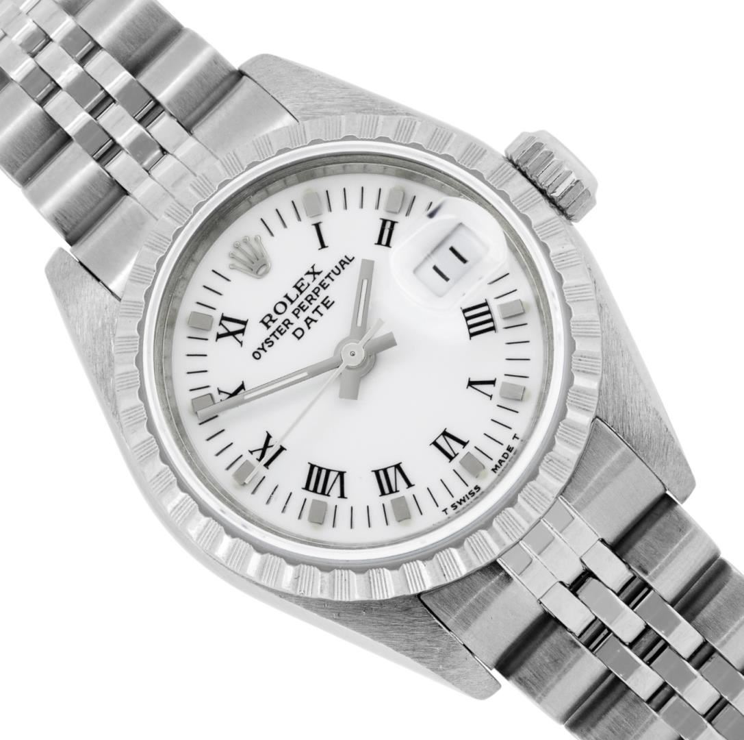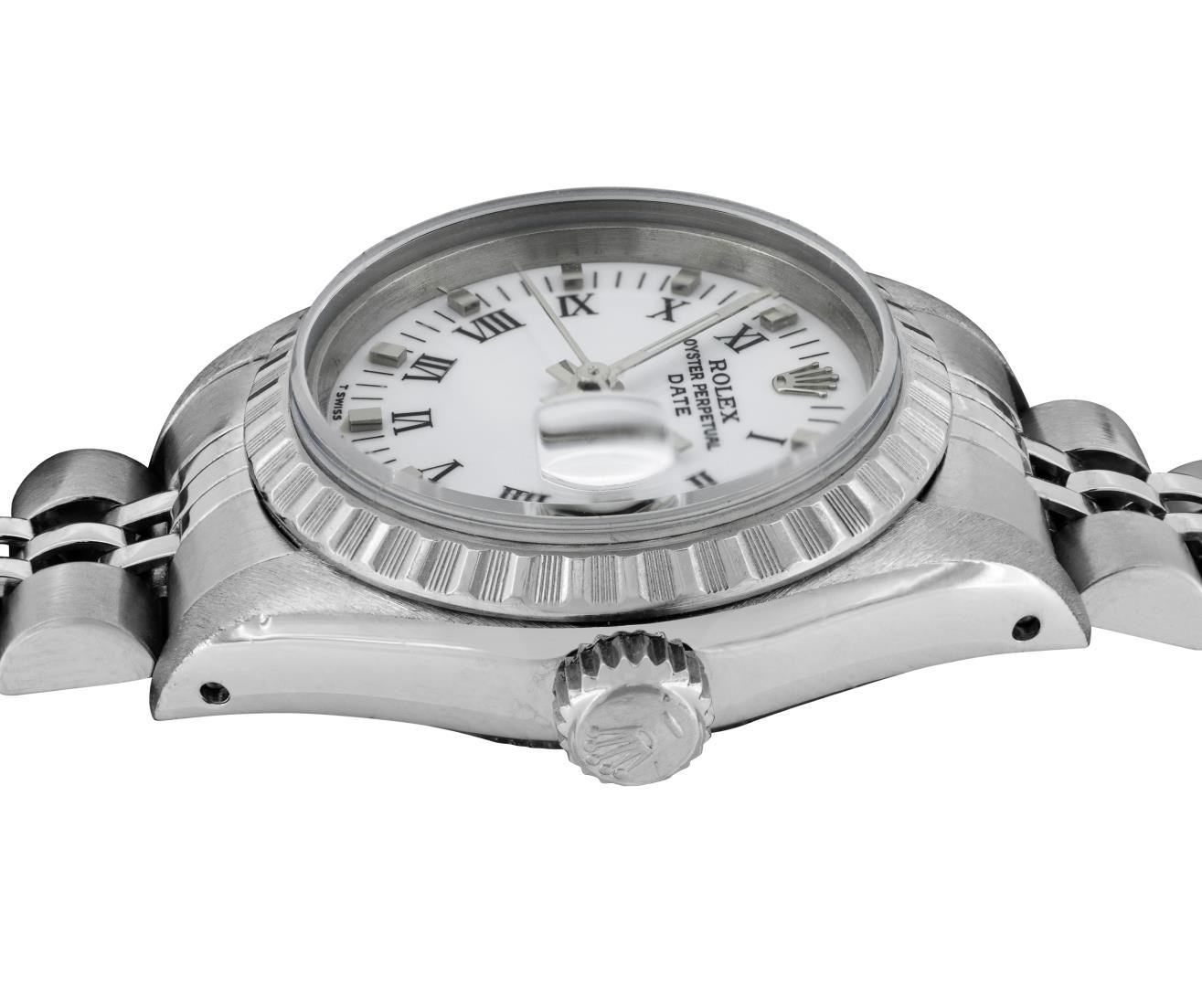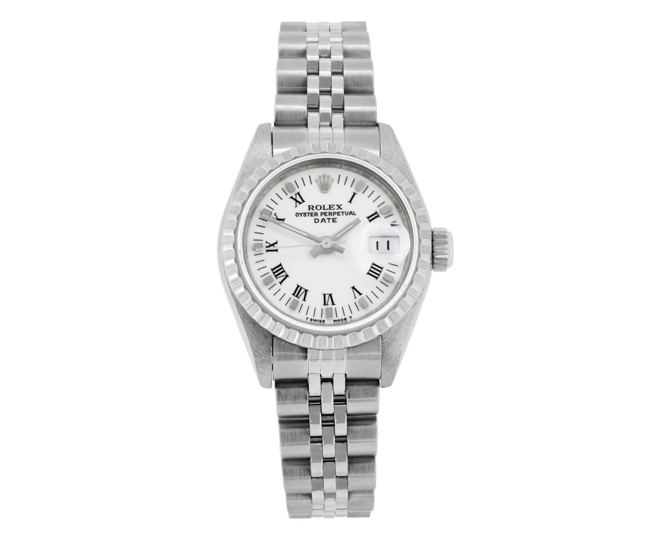 One Rolex Ladies Pre Owned Stainless Steel Date Wristwatch Polished Bright with Satin Finish, Serviced & Electronically Tested, Stainless Steel Case: 26mm, Stainless Steel Crown, Rolex Stainless Steel Engine Turn bezel. Custom Crystal: New Sapphire With Magnified Date Window. Custom Hands: New Luminescent Hands. Rolex Movement: 2135 Automatic Winding Movement. Rolex Dial: Factory White Dial With Roman Hour Markers and Index Markers And Lumi Dots and Dash Tracks. Date Window: 3 O'clock Position Date Display, Model: Quickset Date. Condition: G-6 Extra Fine. Rolex Bracelet: Stainless Steel Jubilee Band. Bright Polish & Satin Finish. 6.0 Inch Length, Adjustable. Standard Clasp, With Rolex Logo. This Watch Has Been Serviced And Time Tested. It Is In Excellent Condition, Free Of All Scratches And Dents. This Watch Comes With A Rolex Box.