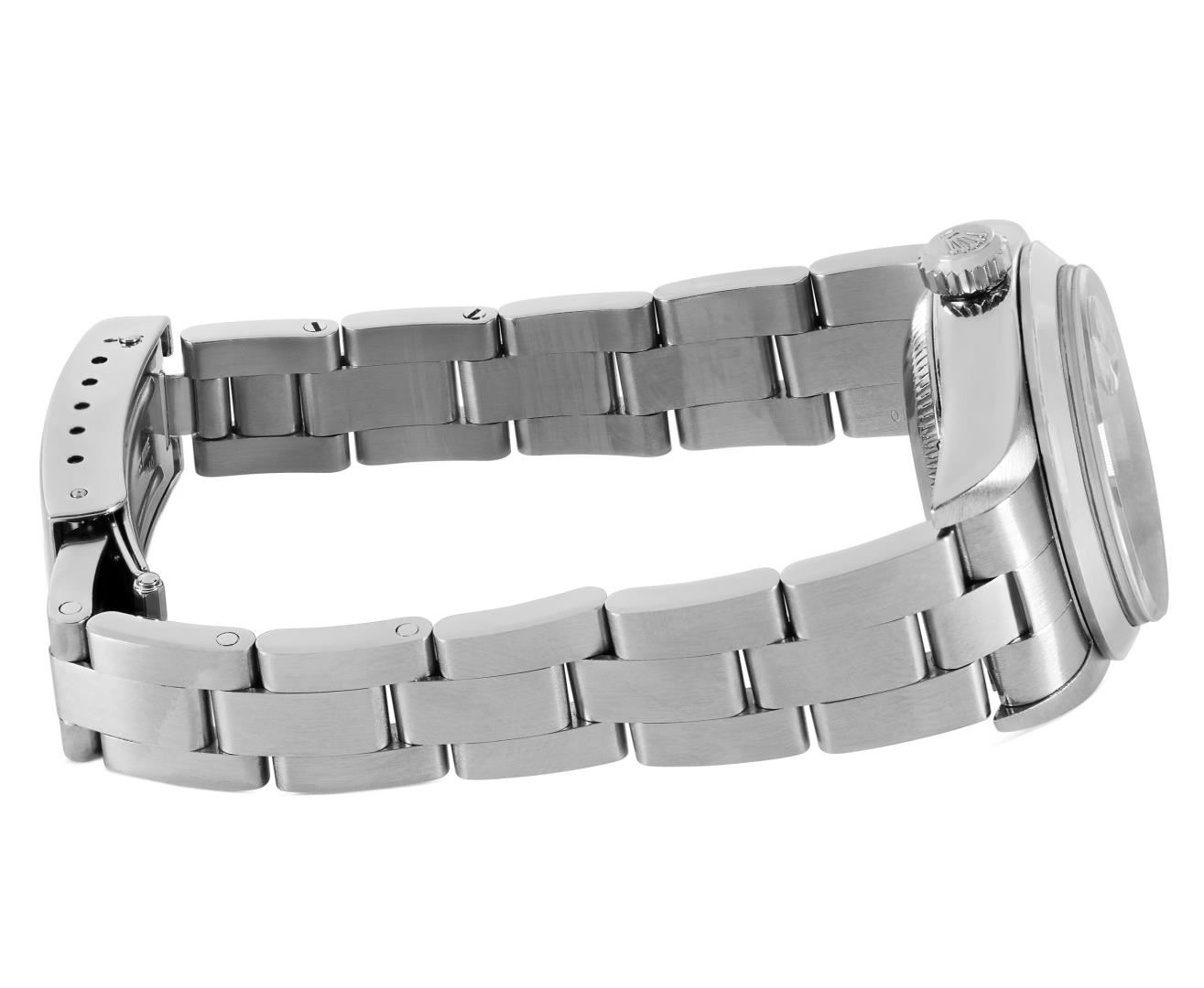 One Rolex Ladies Pre Owned Quickset Stainless Steel Date Wristwatch Polished Bright with Satin Finish, Serviced & Electronically Tested, Stainless Steel Case: 26mm, Stainless Steel Crown, Rolex Stainless Steel Smooth bezel. Crystal: Sapphire With Magnified Date Window. Hands: Luminescent Hands. Rolex Movement: 2235 Automatic Winding Movement. Rolex Dial: Factory White With Roman Hour Markers, Square Track. Date Window: 3 O'clock Position Date Display, Model: Quickset Date. Condition: G-6 Extra Fine. Rolex Bracelet: Stainless Steel Oyster Band. Bright Polish And Satin Finish. 6.0 Inch Length, Adjustable. Standard Clasp, With Rolex Logo. This Watch Has Been Serviced And Time Tested. It Is In Excellent Condition, Free Of All Scratches And Dents.