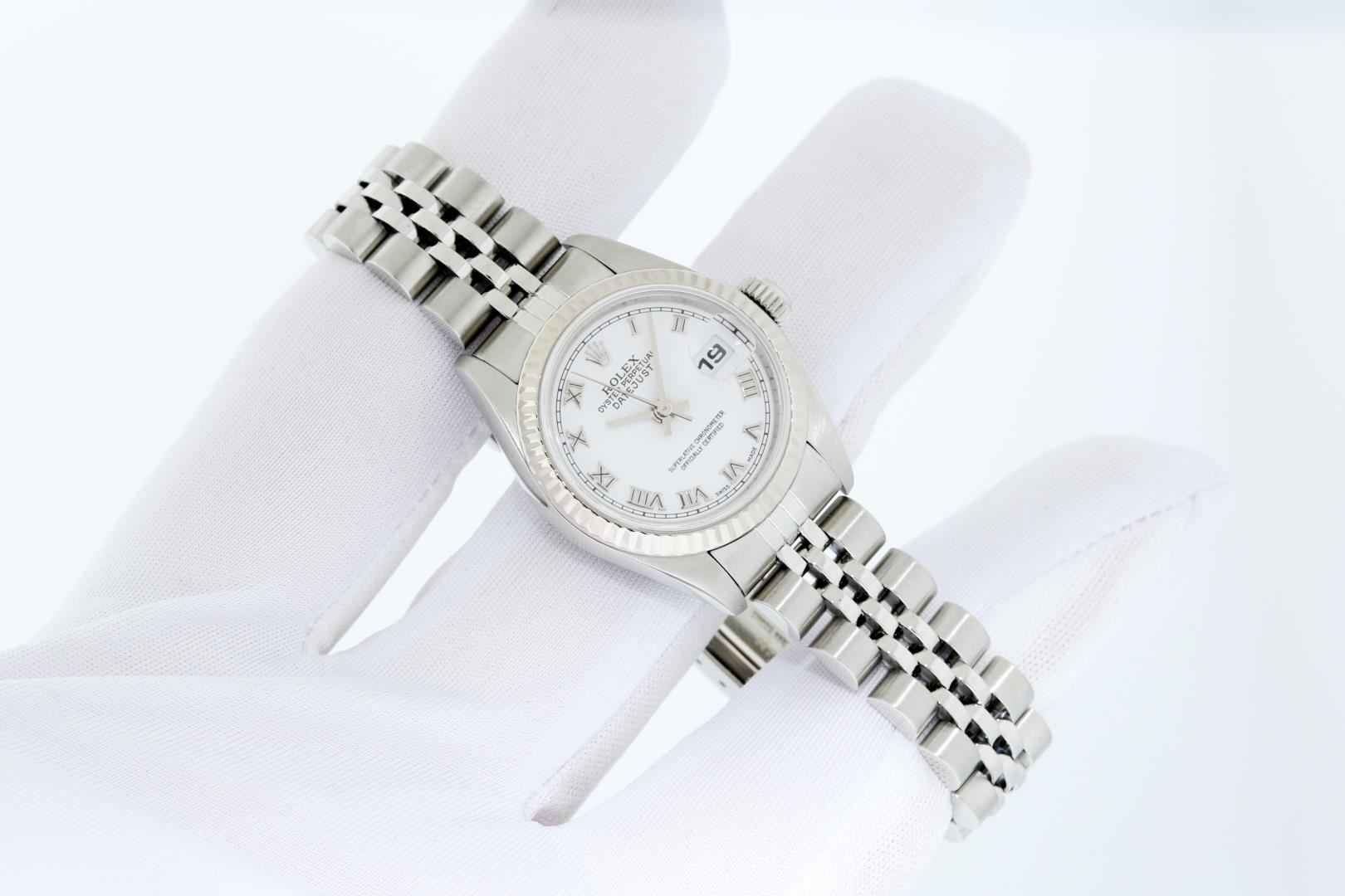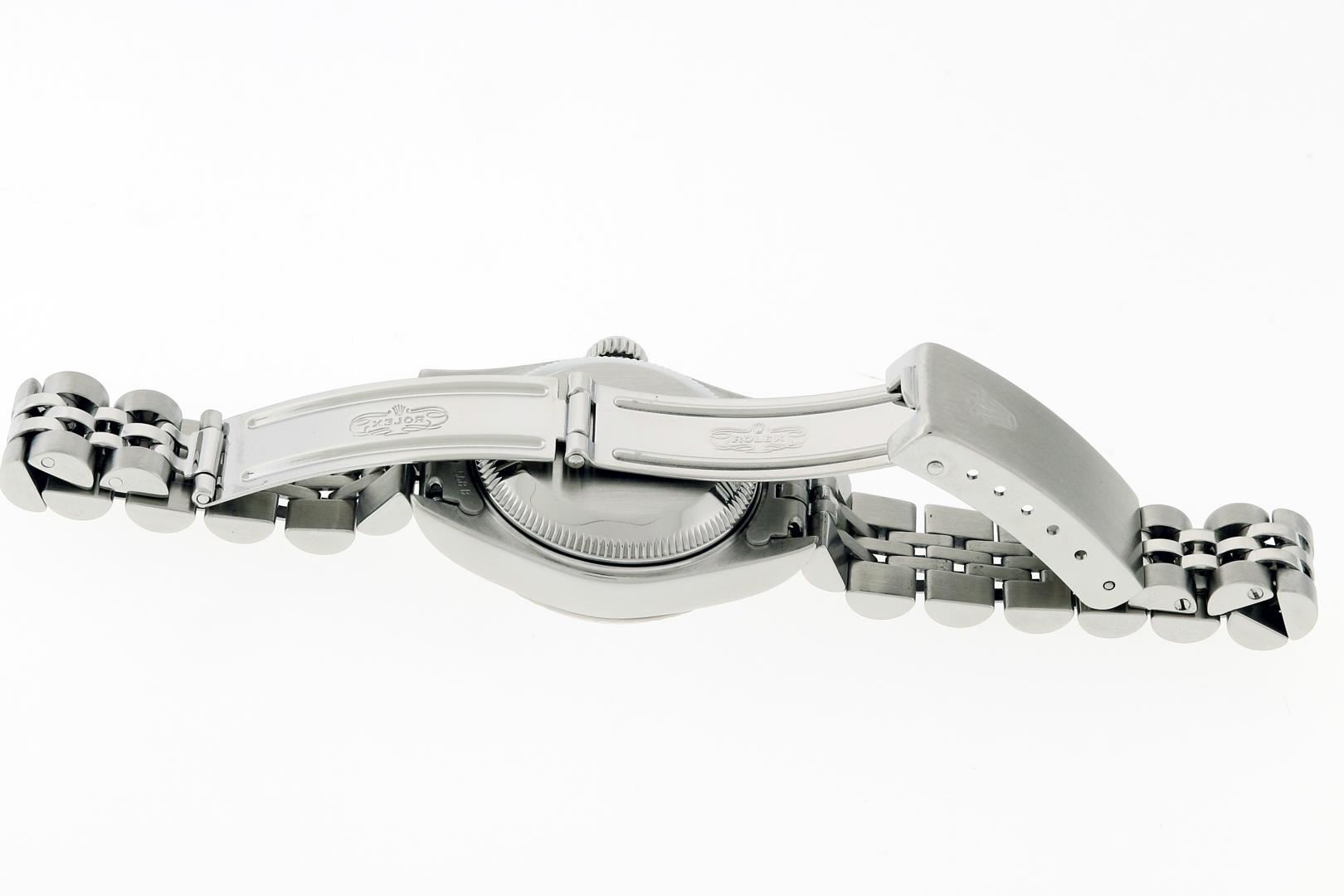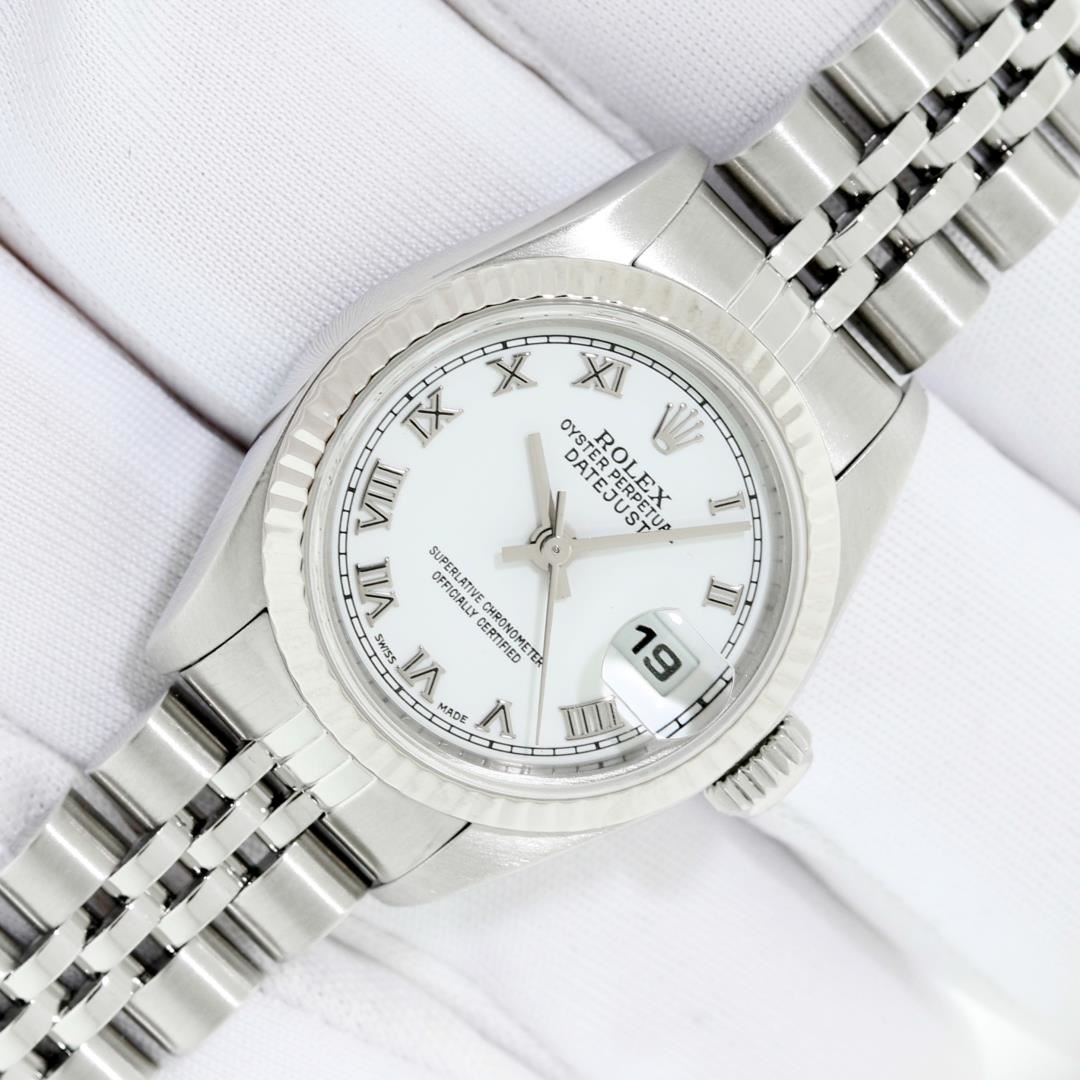 One Quickset Sapphire Pre Owned Ladies Stainless Steel Rolex Datejust Polished Bright with Satin Finish, Serviced & Electronically Tested, Rolex Stainless Steel Case: 26mm, Rolex Stainless Steel Crown, Rolex Bezel: 18K White Gold Fluted Bezel, Crystal: Sapphire With Date Window. Custom Hands: New Hands. Rolex Movement: Automatic Winding Movement 2235. Rolex Dial: White Roman With Square Track, Date Window: 3 O'Clock Position Date Display, Model: Quickset Datejust. Condition: G-6 Extra Fine. Rolex Bracelet: Stainless Steel Jubilee Band. Bright Polish & Satin Finish. 6.0 Inch Length, Adjustable. Standard Clasp, With Rolex Logo. This Watch Has Been Serviced Time Tested And Is In Excellent Condition It Is Free Of All Scratches And Dents. This Watch Comes With A Rolex Box, Rolex Booklets, And Rolex Wallet.