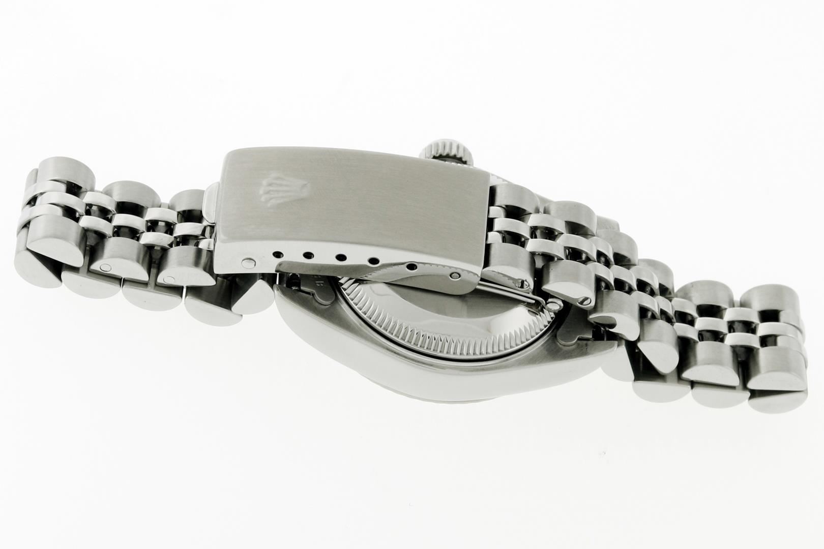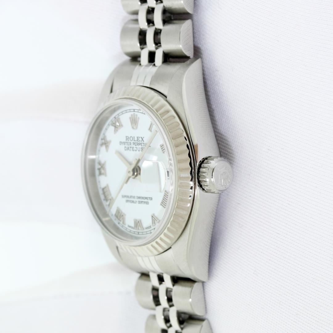 One Quickset Sapphire Pre Owned Ladies Stainless Steel Rolex Datejust Polished Bright with Satin Finish, Serviced & Electronically Tested, Rolex Stainless Steel Case: 26mm, Rolex Stainless Steel Crown, Rolex Bezel: 18K White Gold Fluted Bezel, Crystal: Sapphire With Date Window. Custom Hands: New Hands. Rolex Movement: Automatic Winding Movement 2235. Rolex Dial: White Roman With Square Track, Date Window: 3 O'Clock Position Date Display, Model: Quickset Datejust. Condition: G-6 Extra Fine. Rolex Bracelet: Stainless Steel Jubilee Band. Bright Polish & Satin Finish. 6.0 Inch Length, Adjustable. Standard Clasp, With Rolex Logo. This Watch Has Been Serviced Time Tested And Is In Excellent Condition It Is Free Of All Scratches And Dents. This Watch Comes With A Rolex Box, Rolex Booklets, And Rolex Wallet.