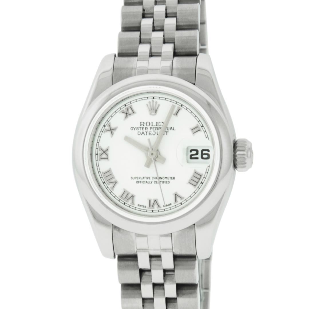 One New Style Ladies Pre Owned Quickset Stainless Steel Rolex Polished Bright with Satin Finish, Serviced & Electronically Tested, Rolex Stainless Steel Case: 26mm, Rolex Stainless Steel Crown, Rolex Bezel: Stainless Steel Smooth Bezel. Crystal: Sapphire With Magnified Date Window. Hands: Solid Hands. Rolex Movement: Automatic Winding Movement 2235. Rolex Dial: White Roman Dial With Square Track. Date Window: 3 O'Clock Position Date Display, Model: Quickset 179160. Condition: G-6 Extra Fine. Rolex Bracelet: Stainless Steel Jubilee Band. Bright Polish & Satin Finish. 6.0 Inch Length, Adjustable. Hidden Clasp, With Rolex Logo. This Watch Has Been Serviced Time Tested And Is In Excellent Condition It Is Free Of All Scratches And Dents.