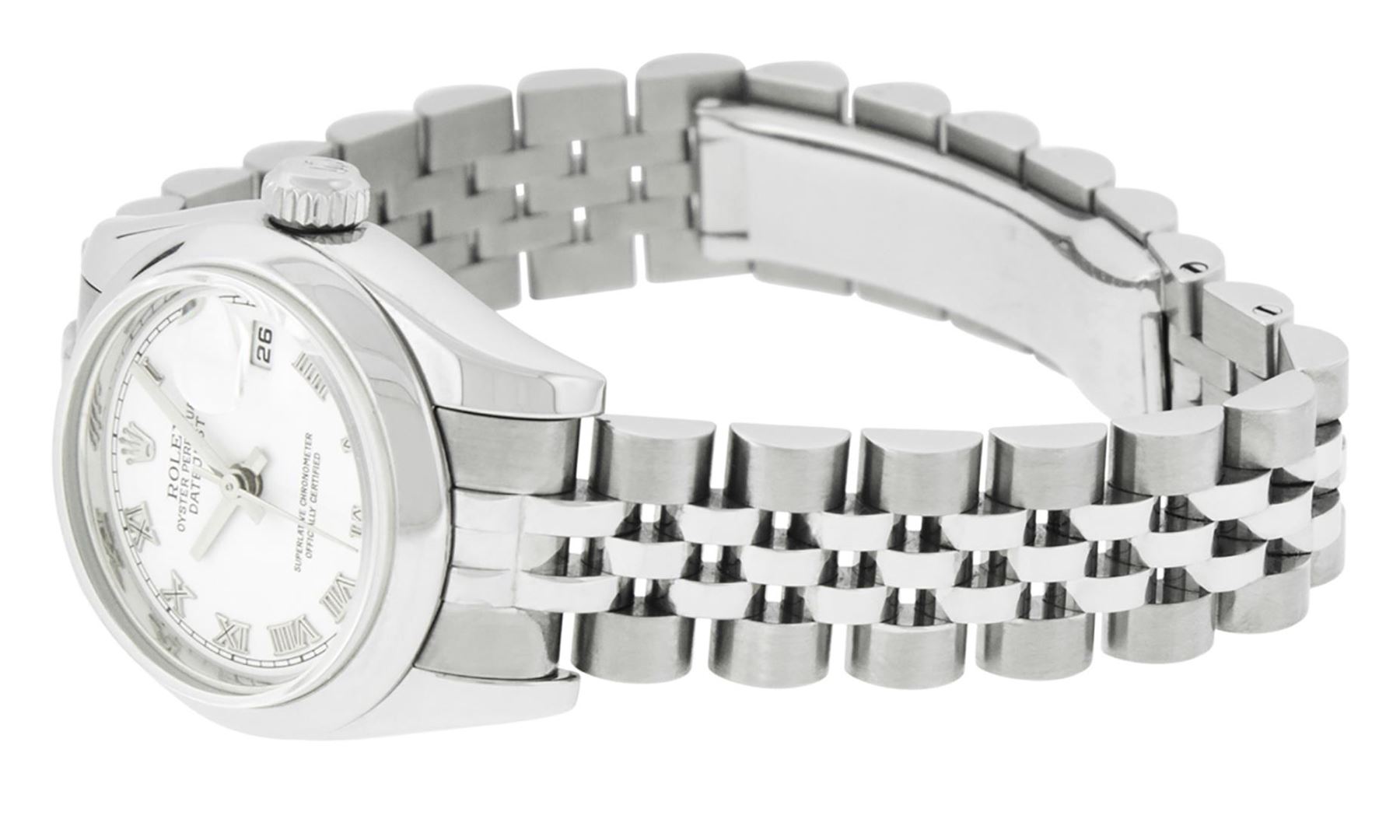 One New Style Ladies Pre Owned Quickset Stainless Steel Rolex Polished Bright with Satin Finish, Serviced & Electronically Tested, Rolex Stainless Steel Case: 26mm, Rolex Stainless Steel Crown, Rolex Bezel: Stainless Steel Smooth Bezel. Crystal: Sapphire With Magnified Date Window. Hands: Solid Hands. Rolex Movement: Automatic Winding Movement 2235. Rolex Dial: White Roman Dial With Square Track. Date Window: 3 O'Clock Position Date Display, Model: Quickset 179160. Condition: G-6 Extra Fine. Rolex Bracelet: Stainless Steel Jubilee Band. Bright Polish & Satin Finish. 6.0 Inch Length, Adjustable. Hidden Clasp, With Rolex Logo. This Watch Has Been Serviced Time Tested And Is In Excellent Condition It Is Free Of All Scratches And Dents.