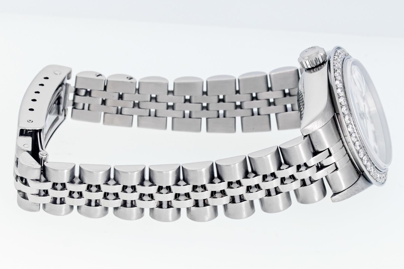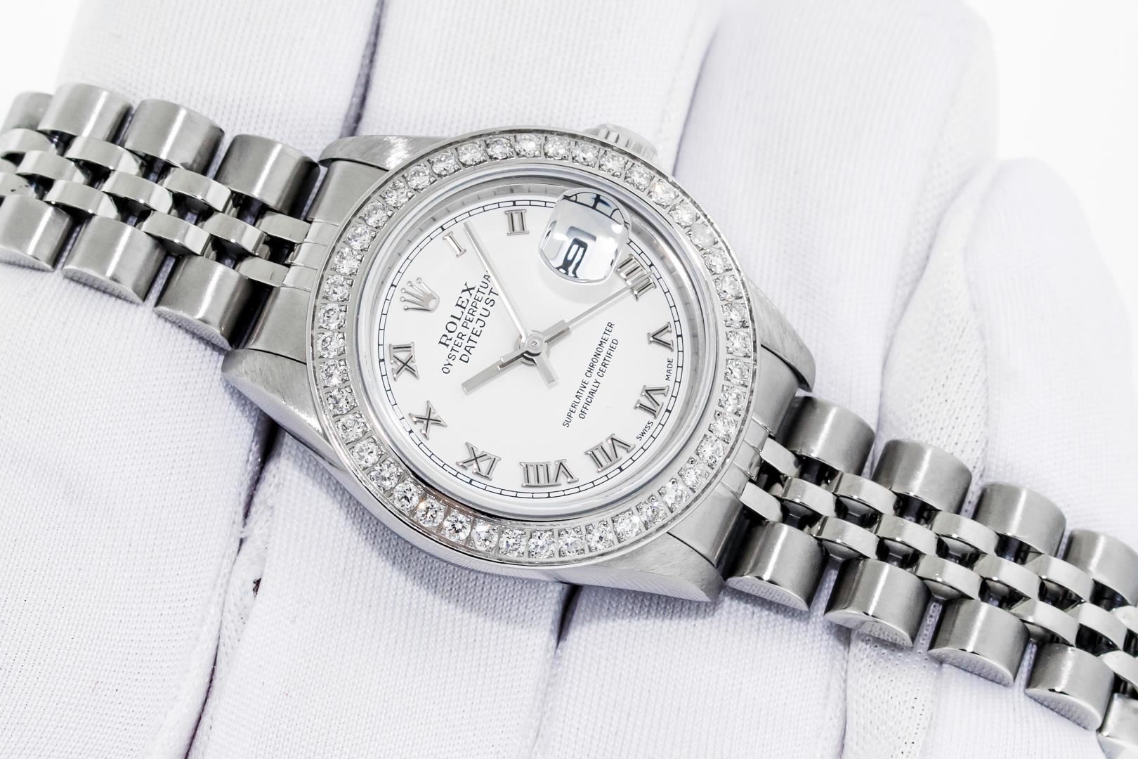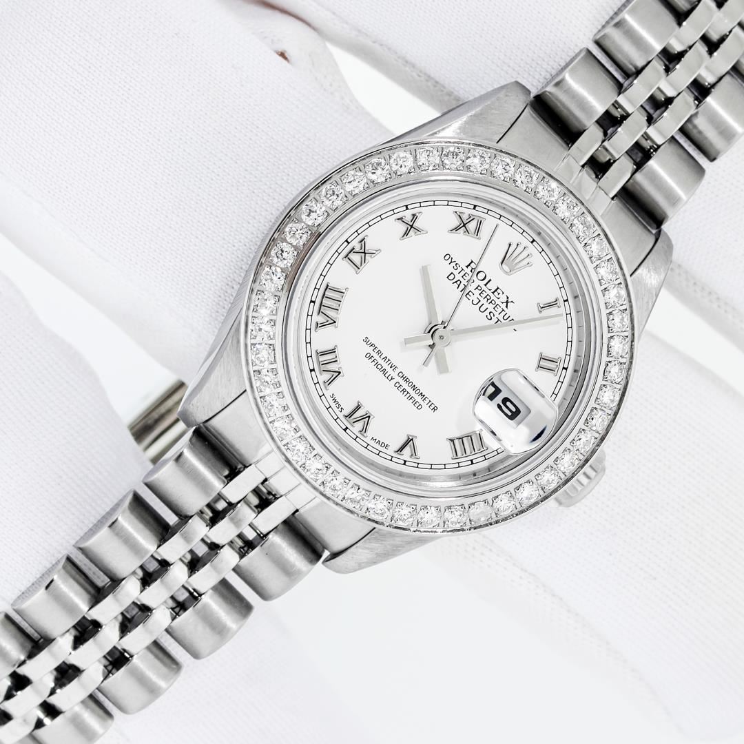 One Ladies Pre Owned Quickset Stainless Steel Rolex Datejust Polished Bright with Satin Finish, Serviced & Electronically Tested, Stainless Steel Case: 26mm, Rolex Stainless Steel Crown, Custom Bezel: New Stainless Steel Diamond Bezel, Diamond Count: 40 Diamonds On Bezel. Custom Crystal: New Sapphire With Magnified Date Window. Custom Hands: New Hands. Rolex Movement: Automatic Winding Quickset Movement 2235. Rolex Dial: White Roman With Square Track. Date Window: 3 O'Clock Position Date Display, Model: Quickset Datejust. Condition: G-6 Extra Fine. Rolex Bracelet: Stainless Steel Jubilee Band. Bright Polish & Satin Finish. 6.0 Inch Length, Adjustable. Standard Clasp, With Rolex Logo. This Watch Has Been Serviced Time Tested And Is In Excellent Condition It Is Free Of All Scratches And Dents.