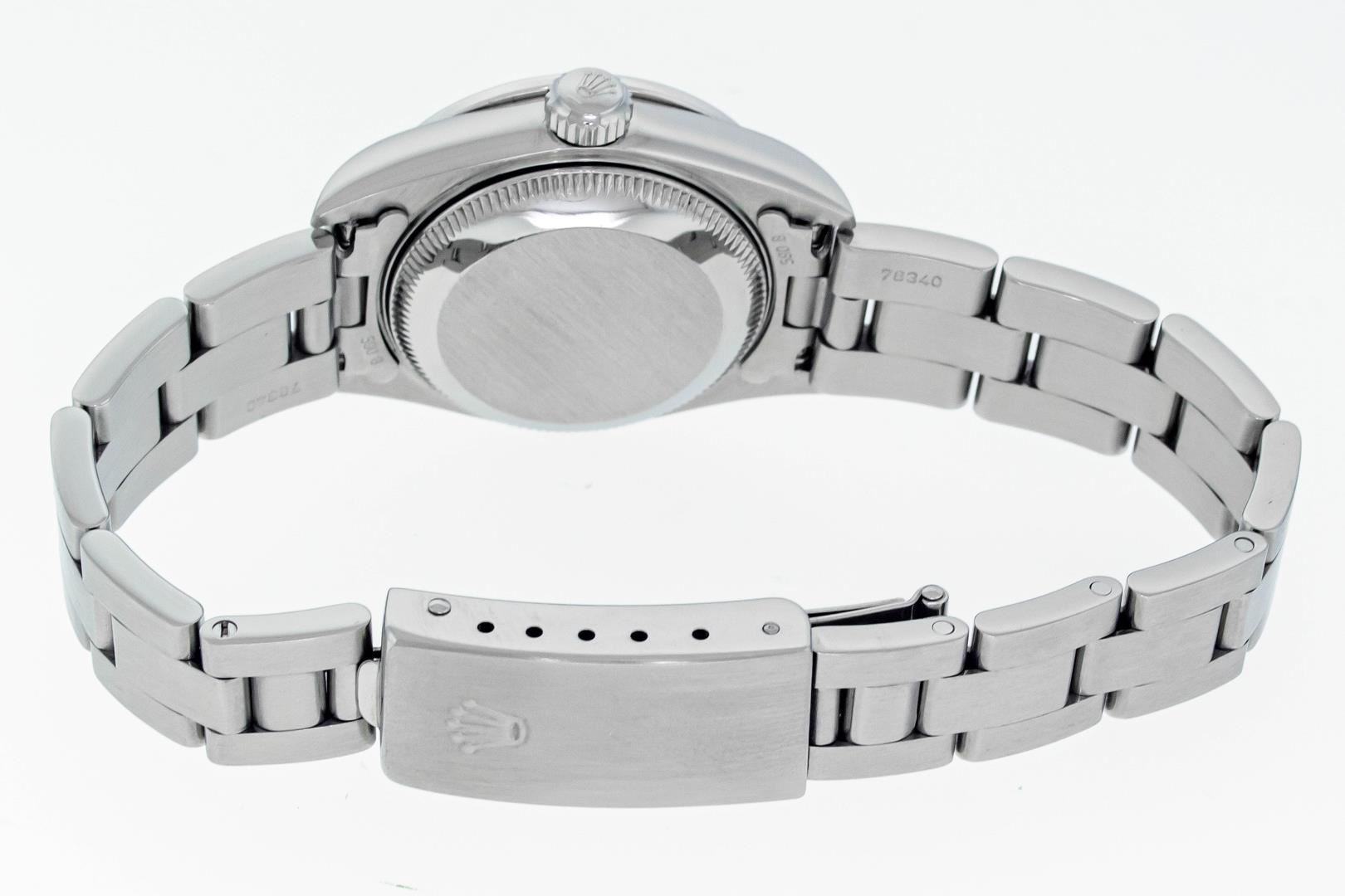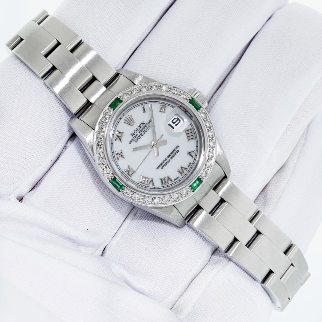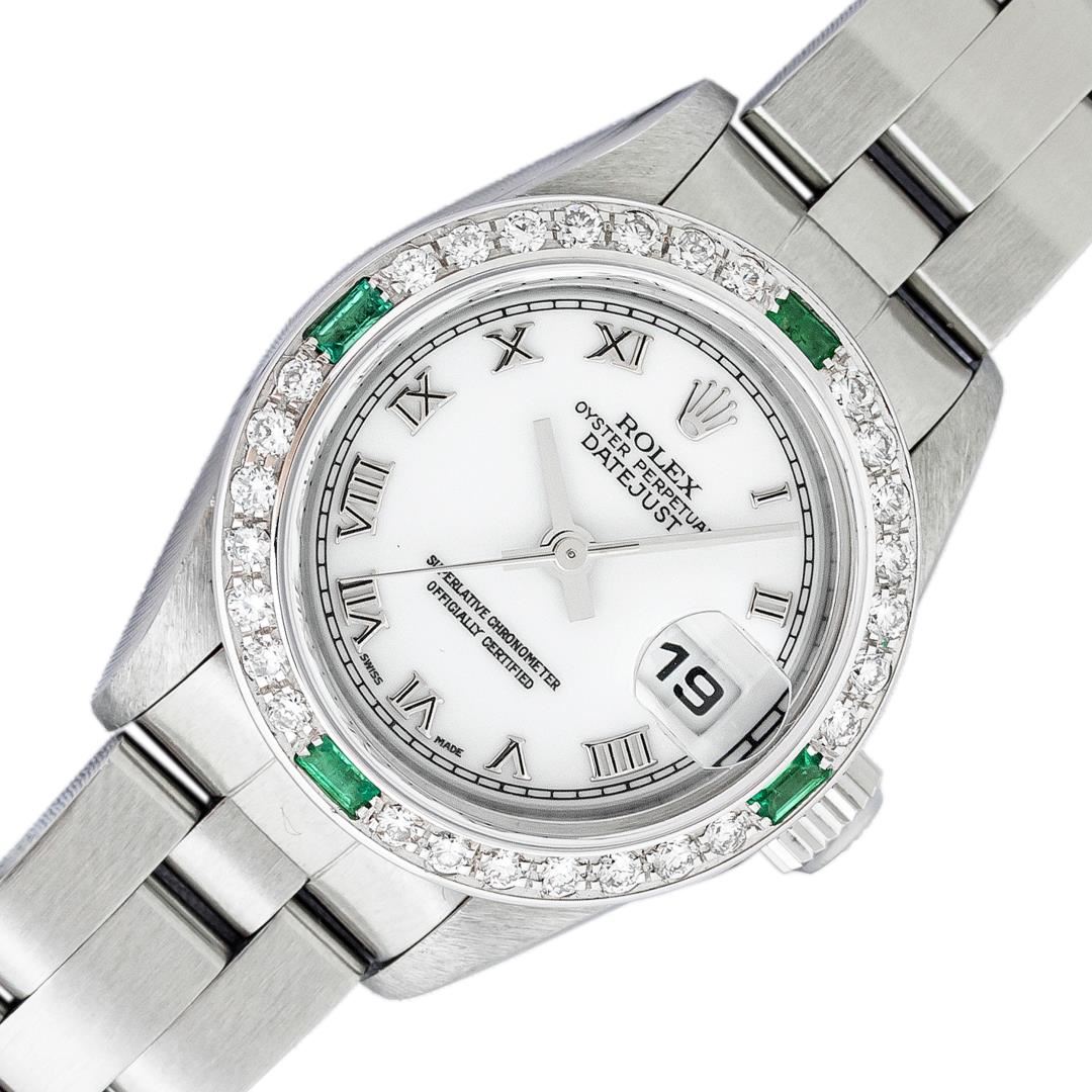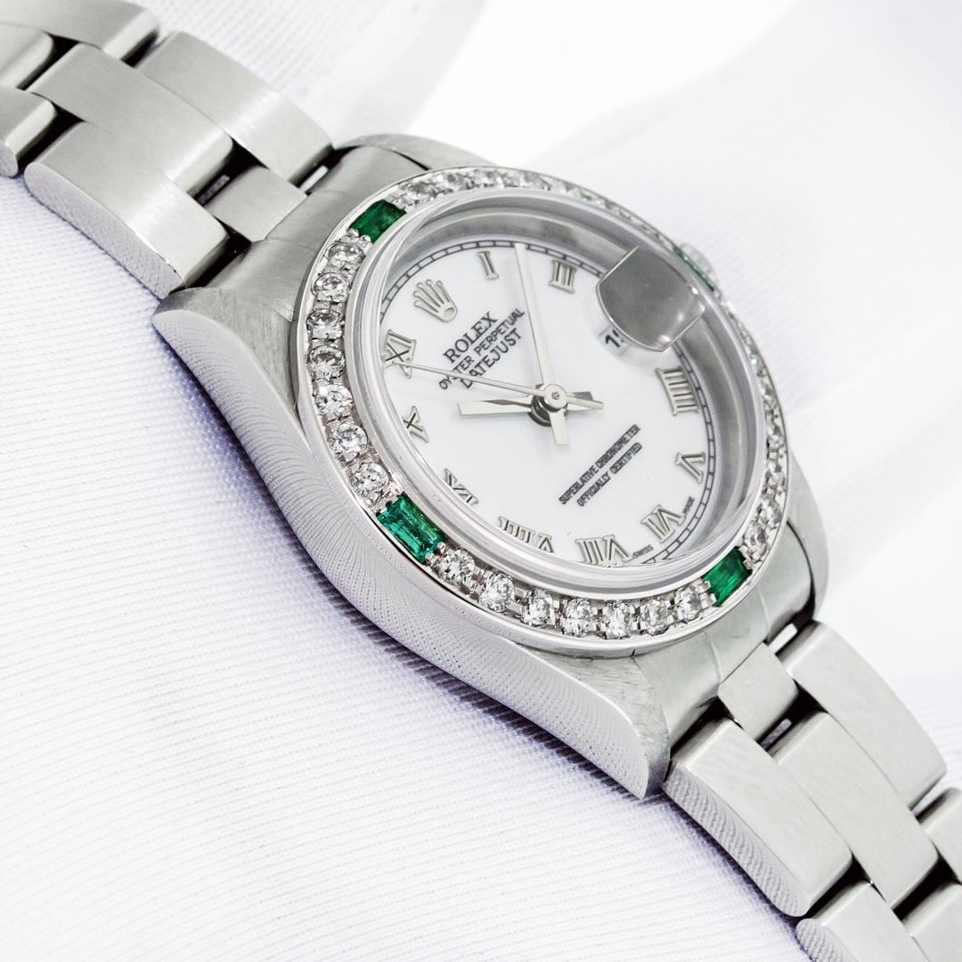 One Ladies Pre Owned Quickset Stainless Steel Rolex Datejust Polished Bright with Satin Finish, Serviced & Electronically Tested, Stainless Steel Case: 26mm, Rolex Stainless Steel Crown, Custom Bezel: New 18K White Gold Emerald Bead Set Diamond Bezel, Diamond + Gem Count: 28 Diamonds + 4 Emeralds, Clarity: SI-VS, Color: G to H. Custom Crystal: New Sapphire With Magnified Date Window. Custom Hands: New Hands. Rolex Movement: Automatic Winding Movement 2235. Rolex Dial: White With Roman Hour Markers & Square Track. Date Window: 3 O'Clock Position Date Display, Model: Quickset Datejust. Condition: G-6 Extra Fine. Rolex Bracelet: Stainless Steel Oyster Band. Bright Polish & Satin Finish. 6.0 Inch Length, Adjustable. Standard Clasp, With Rolex Logo. This Watch Has Been Serviced Time Tested And Is In Excellent Condition It Is Free Of All Scratches And Dents.