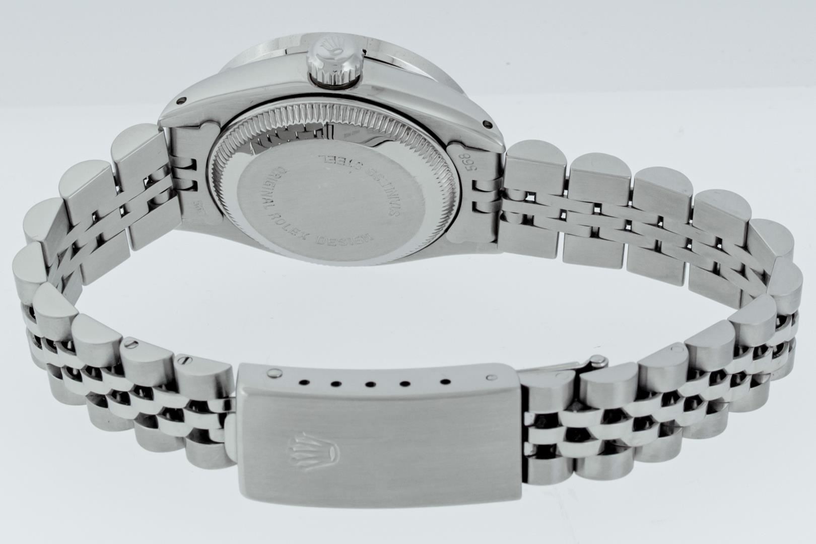 One Ladies Pre Owned Stainless Steel Quickset Rolex Datejust Polished Bright with Satin Finish, Serviced & Electronically Tested, Stainless Steel Case: 26mm, Stainless Steel Crown, Custom Bezel: New 18K White Gold Pyramid Diamond Bezel, Diamond Count: 24 Diamonds On Bezel. Total Weight .50 Carat, Clarity: SI-VS, Color: G to H. Custom Crystal: New Sapphire With Magnified Date Window. Custom Hands: New Luminescent Hands. Rolex Movement: Automatic Winding Movement. Rolex Dial: White Roman Dial. Date Window: 3 O'Clock Position Date Display, Model: Datejust. Condition: G-6 Extra Fine. Rolex Bracelet: Stainless Steel Jubilee Band With Rolex Crown On Buckle. Bright Polish & Satin Finish. Band Length: 6.0 Inch Length, Adjustable. Standard Clasp, With Rolex Logo. This Watch Has Been Serviced Time Tested And Is In Excellent Condition It Is Free Of All Scratches And Dents. This Watch Comes With A Rolex Box, Booklet And Wallet.