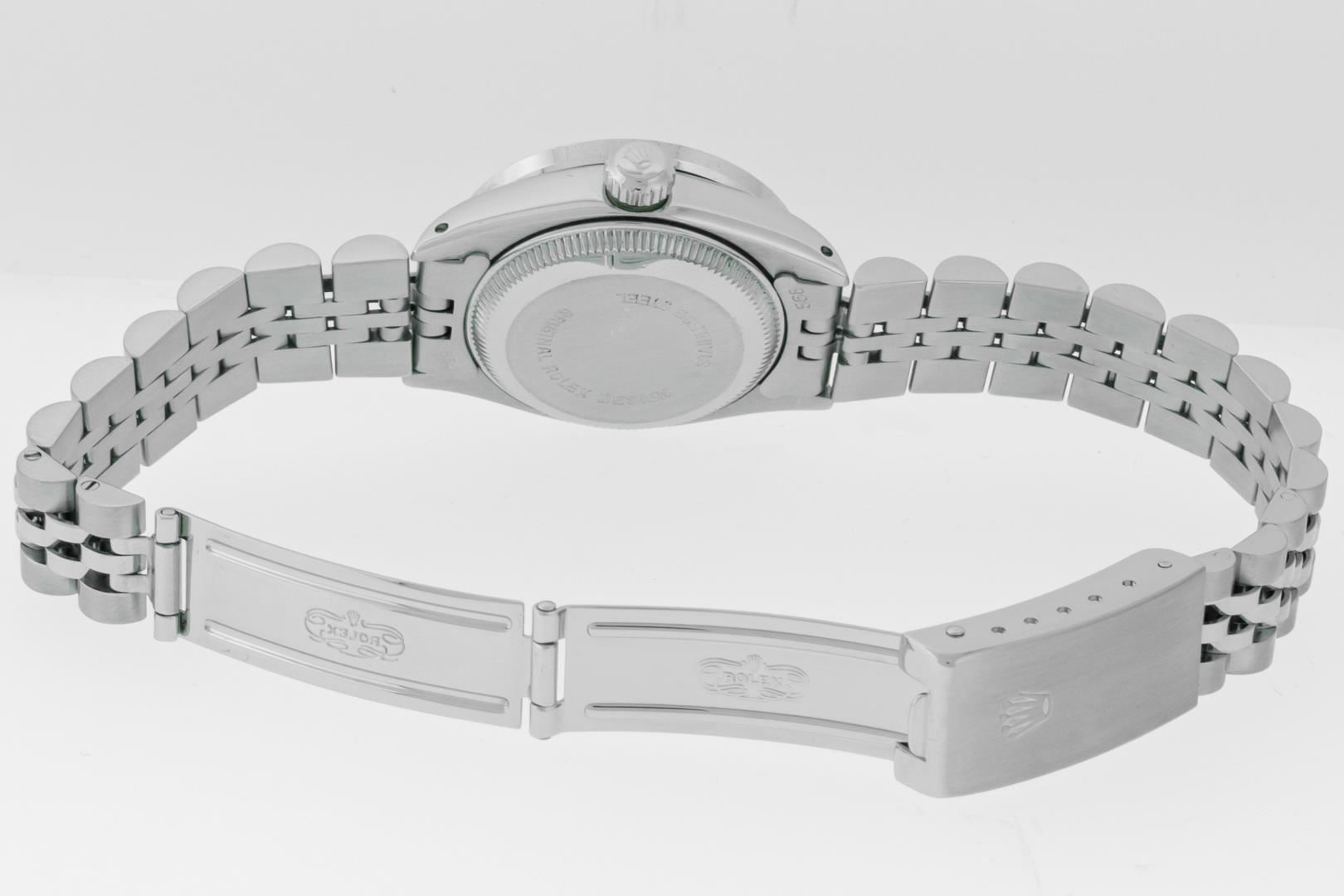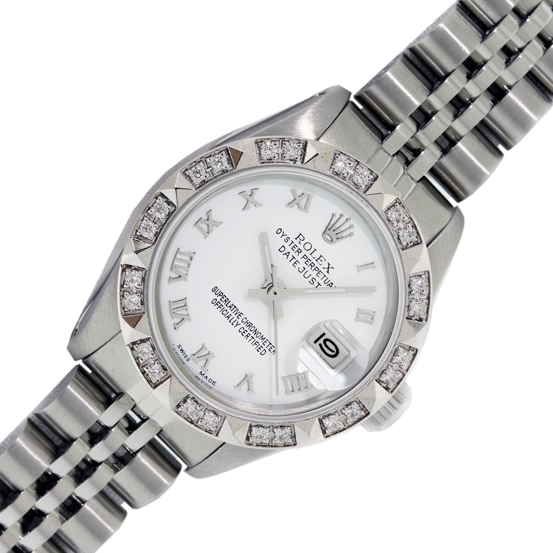 One Ladies Pre Owned Stainless Steel Quickset Rolex Datejust Polished Bright with Satin Finish, Serviced & Electronically Tested, Stainless Steel Case: 26mm, Stainless Steel Crown, Custom Bezel: New 18K White Gold Pyramid Diamond Bezel, Diamond Count: 24 Diamonds On Bezel. Total Weight .50 Carat, Clarity: SI-VS, Color: G to H. Custom Crystal: New Sapphire With Magnified Date Window. Custom Hands: New Luminescent Hands. Rolex Movement: Automatic Winding Movement. Rolex Dial: White Roman Dial. Date Window: 3 O'Clock Position Date Display, Model: Datejust. Condition: G-6 Extra Fine. Rolex Bracelet: Stainless Steel Jubilee Band With Rolex Crown On Buckle. Bright Polish & Satin Finish. Band Length: 6.0 Inch Length, Adjustable. Standard Clasp, With Rolex Logo. This Watch Has Been Serviced Time Tested And Is In Excellent Condition It Is Free Of All Scratches And Dents. This Watch Comes With A Rolex Box, Booklet And Wallet.
