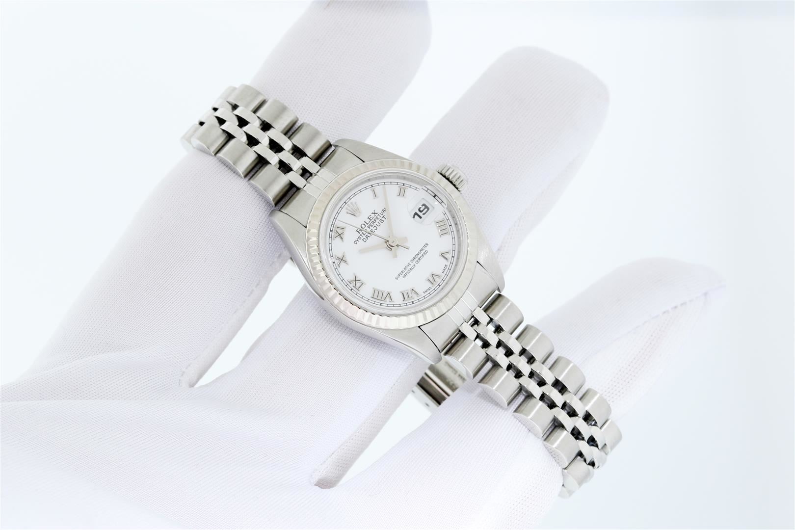 One Quickset Pre Owned Ladies Stainless Steel Rolex Datejust Polished Bright with Satin Finish, Serviced & Electronically Tested, Rolex Stainless Steel Case: 26mm, Rolex Stainless Steel Crown, Rolex Bezel: White Gold Fluted Bezel, Custom Crystal: New Sapphire with Date Window. Custom Hands: New Luminescent Hands. Rolex Movement: Automatic Winding Movement. Rolex Dial: White Roman, Date Window: 3 O'Clock Position Date Display, Model: Quickset 2230 Datejust. Condition: G-6 Extra Fine. Rolex Bracelet: Stainless Steel Jubilee Band. Bright Polish & Satin Finish. 6.0 Inch Length, Adjustable. Standard Clasp, with Rolex Logo. This Watch Has Been Serviced Time Tested And Is In Excellent Condition It Is Free Of All Scratches And Dents.